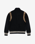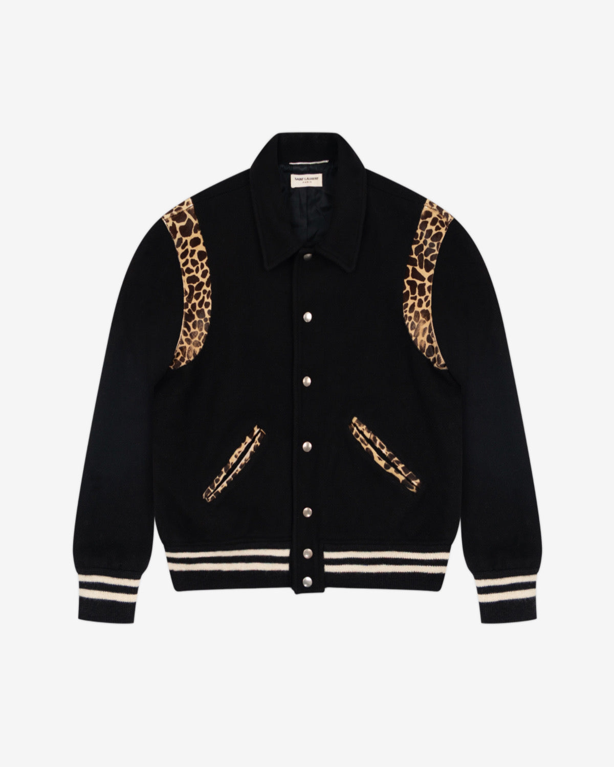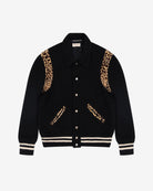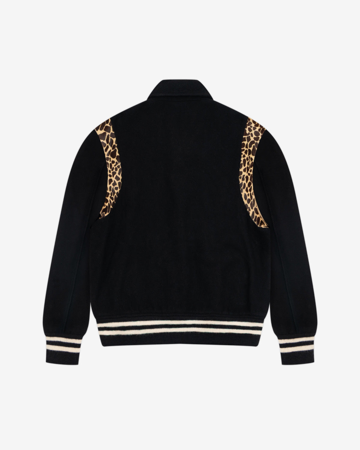 Iconic cheetah teddy jacket in the super rare black iteration. features a classic collar with contrast dual tone cuffing and bottom, black snap-closure button down front, and calfskin animal print contrast panel details on shoulders as well as side pockets. Men's sizing.