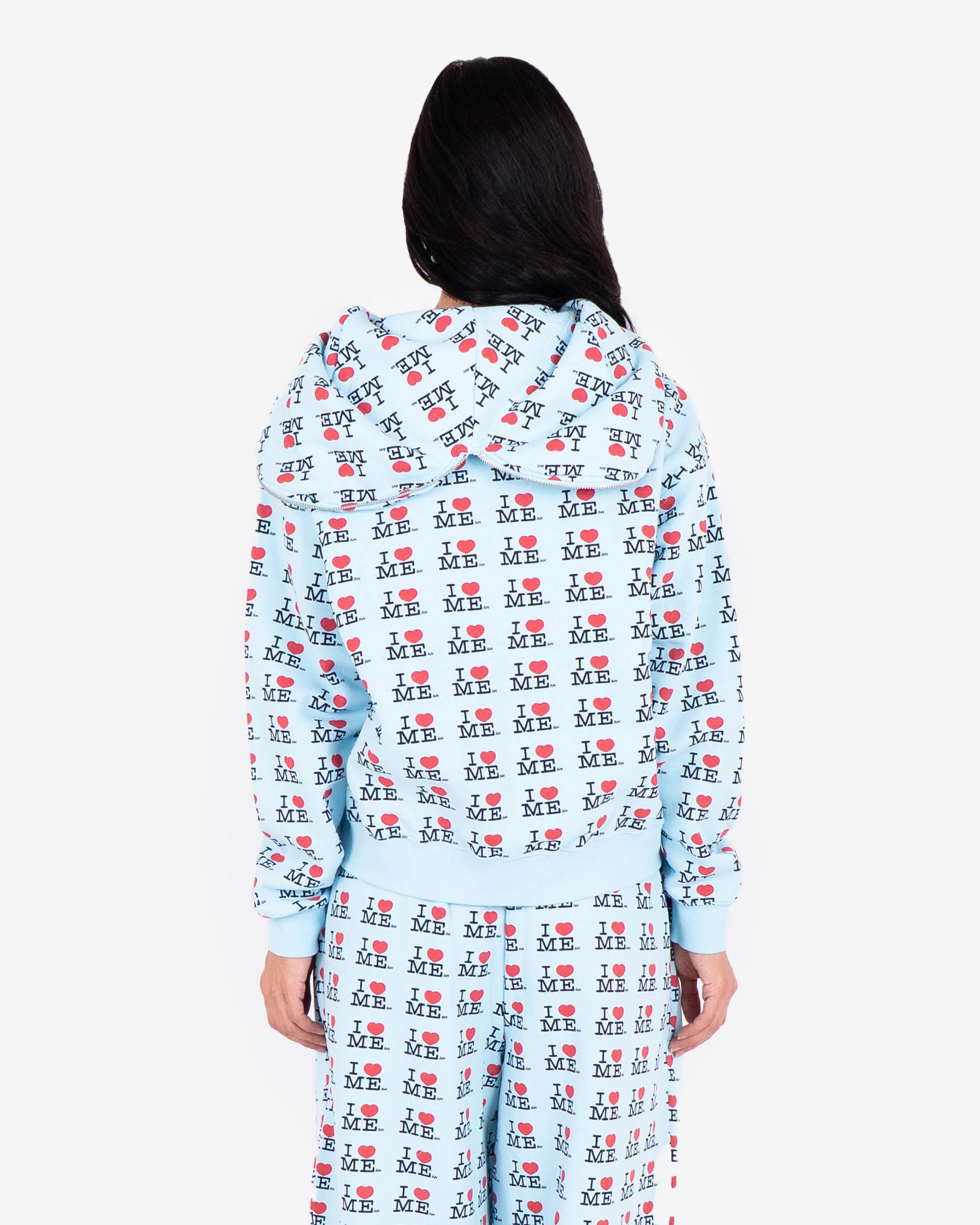Cropped butterfly zip-up hoodie with full closure, featuring the iconic "I ❤️ Me" print.