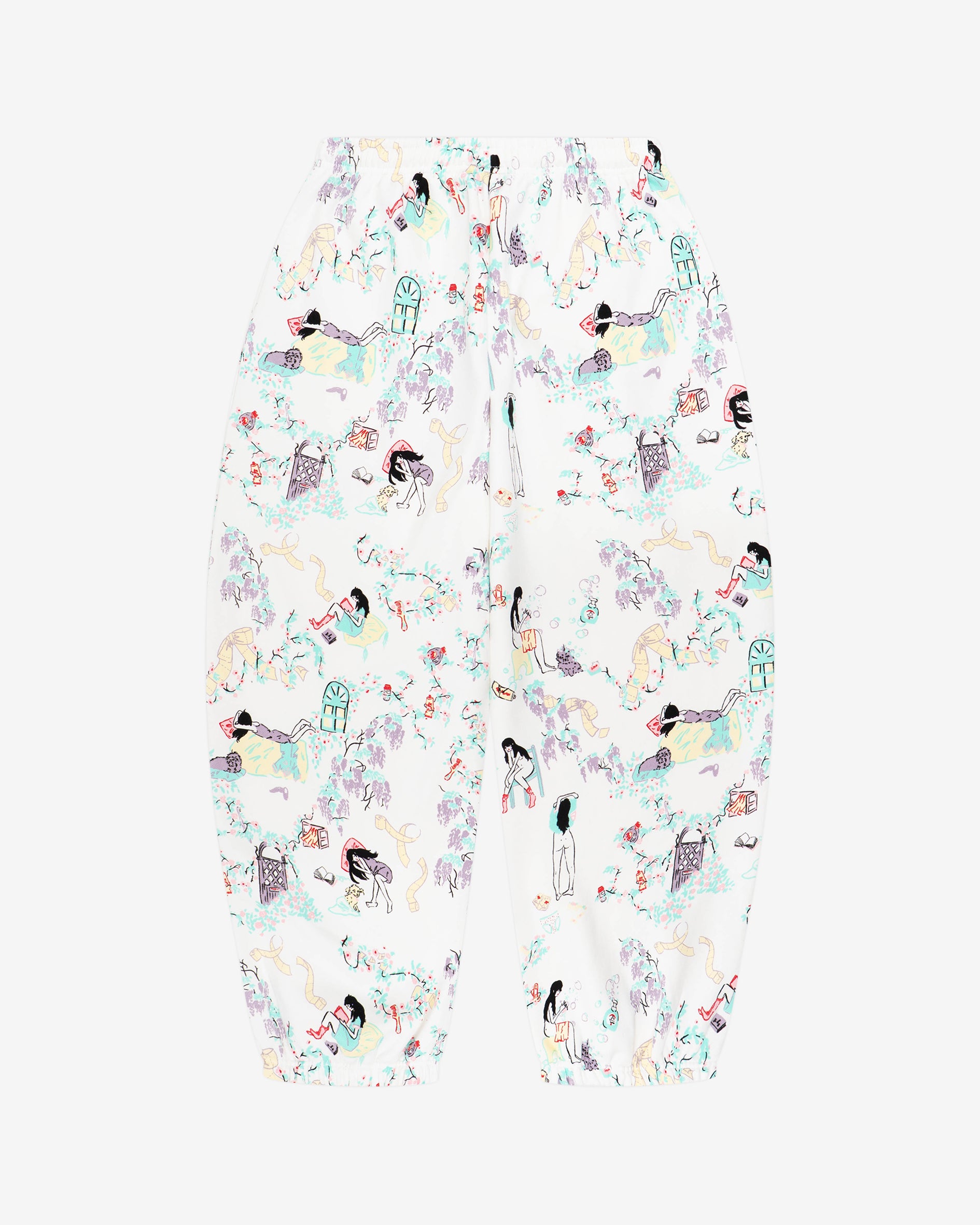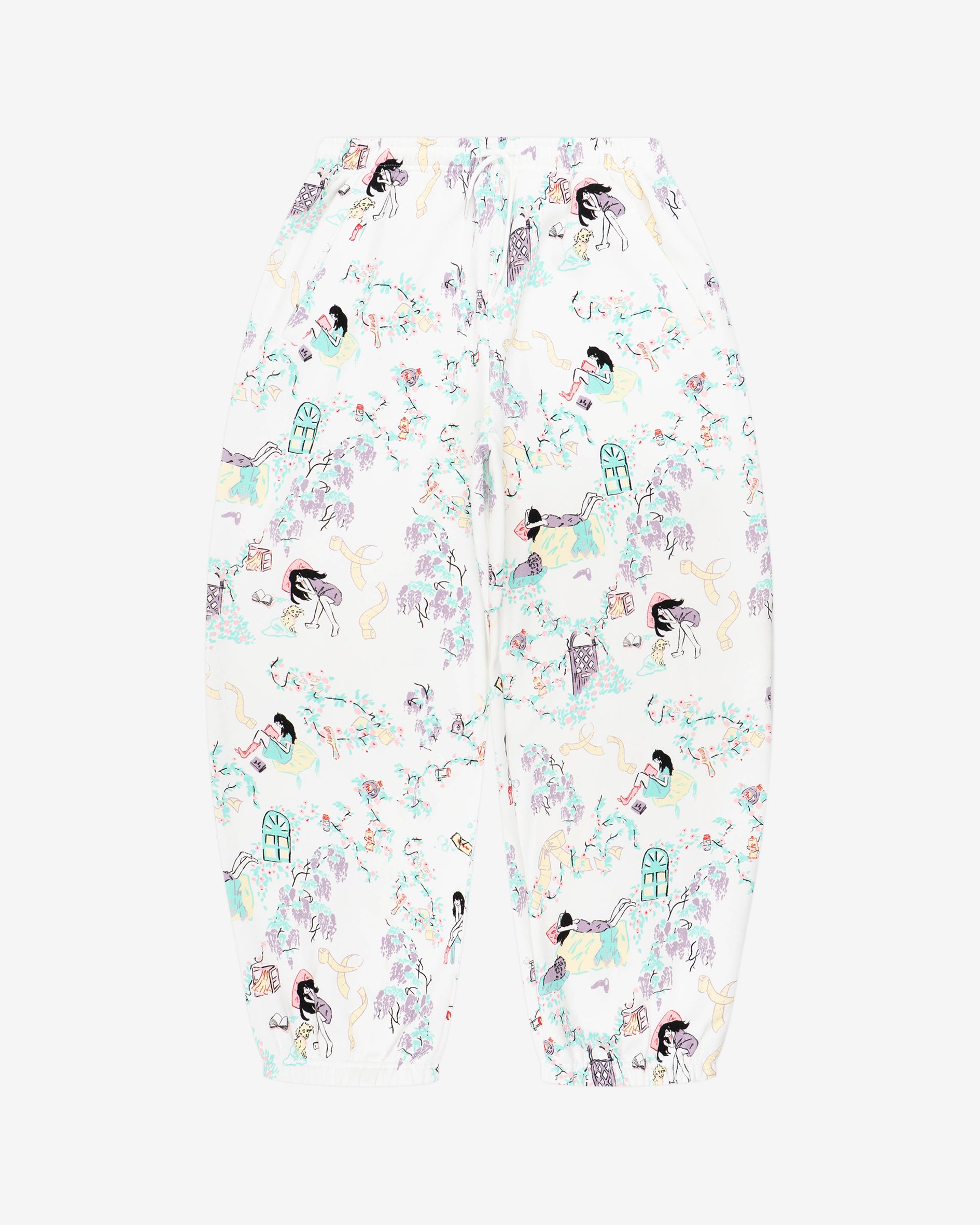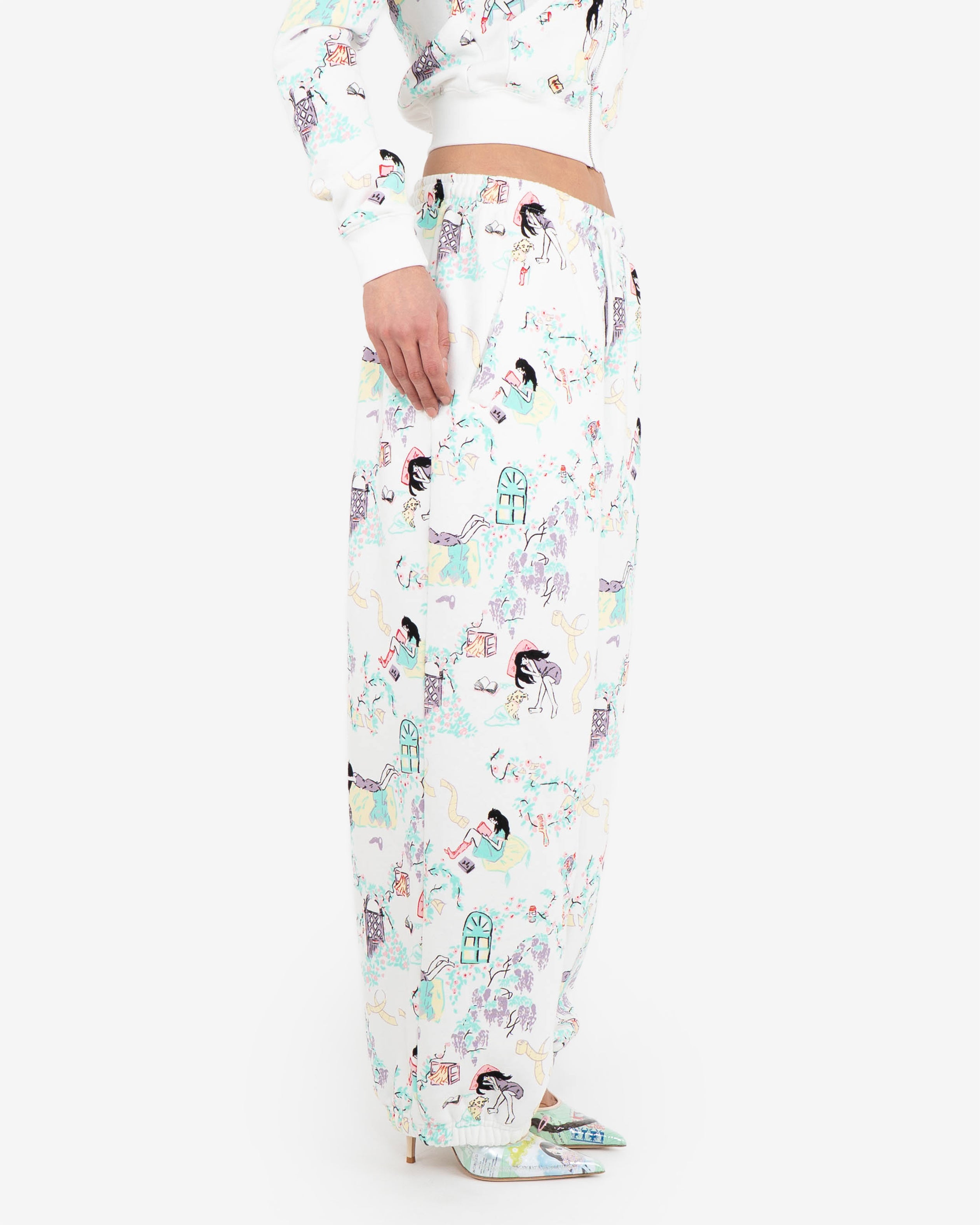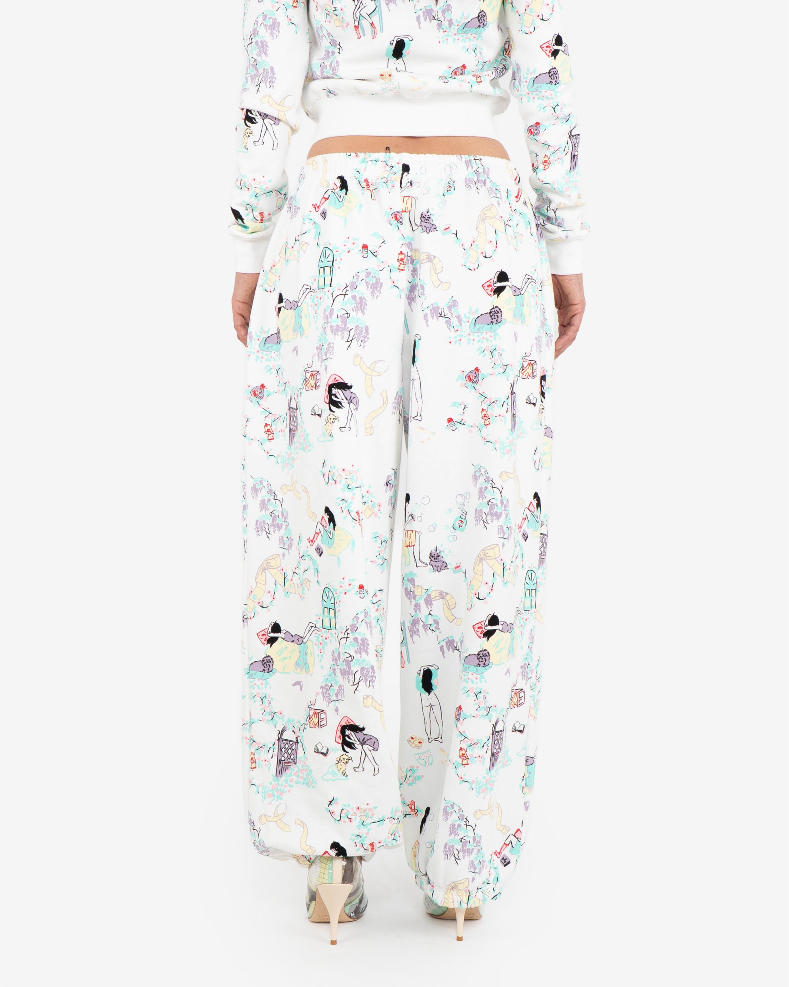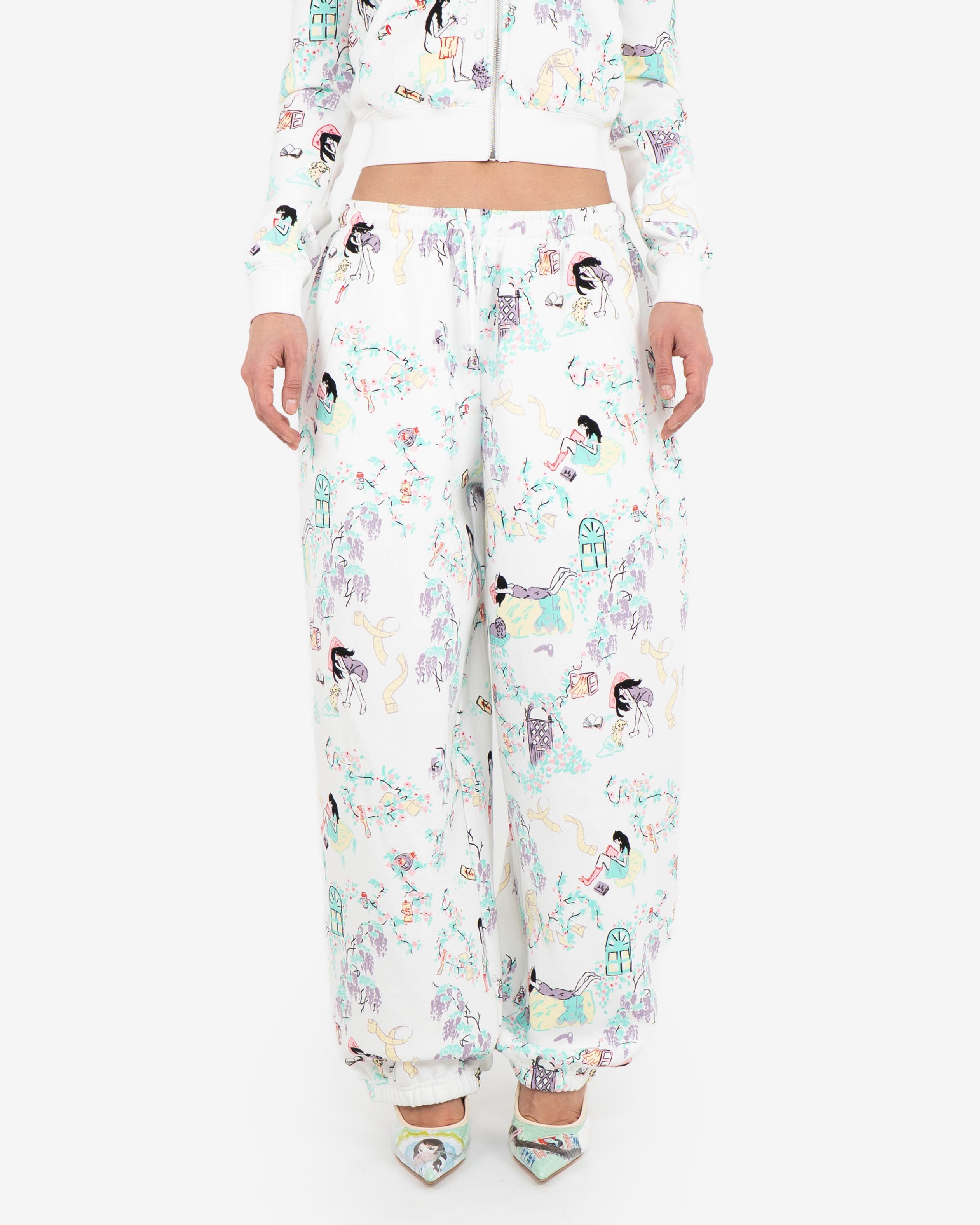 Day in the life graphic print in collaboration with artist Yuura Asana on signature joggers