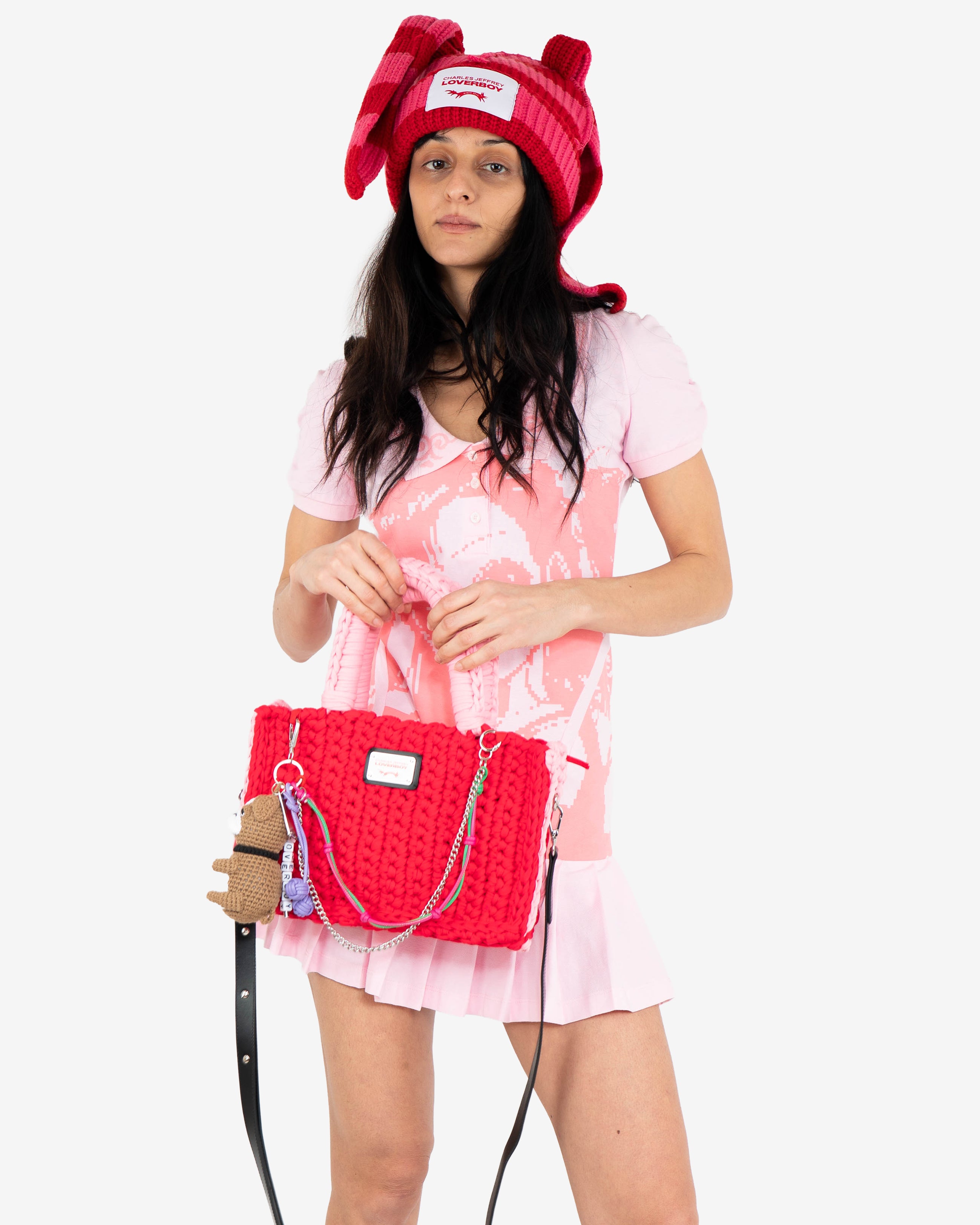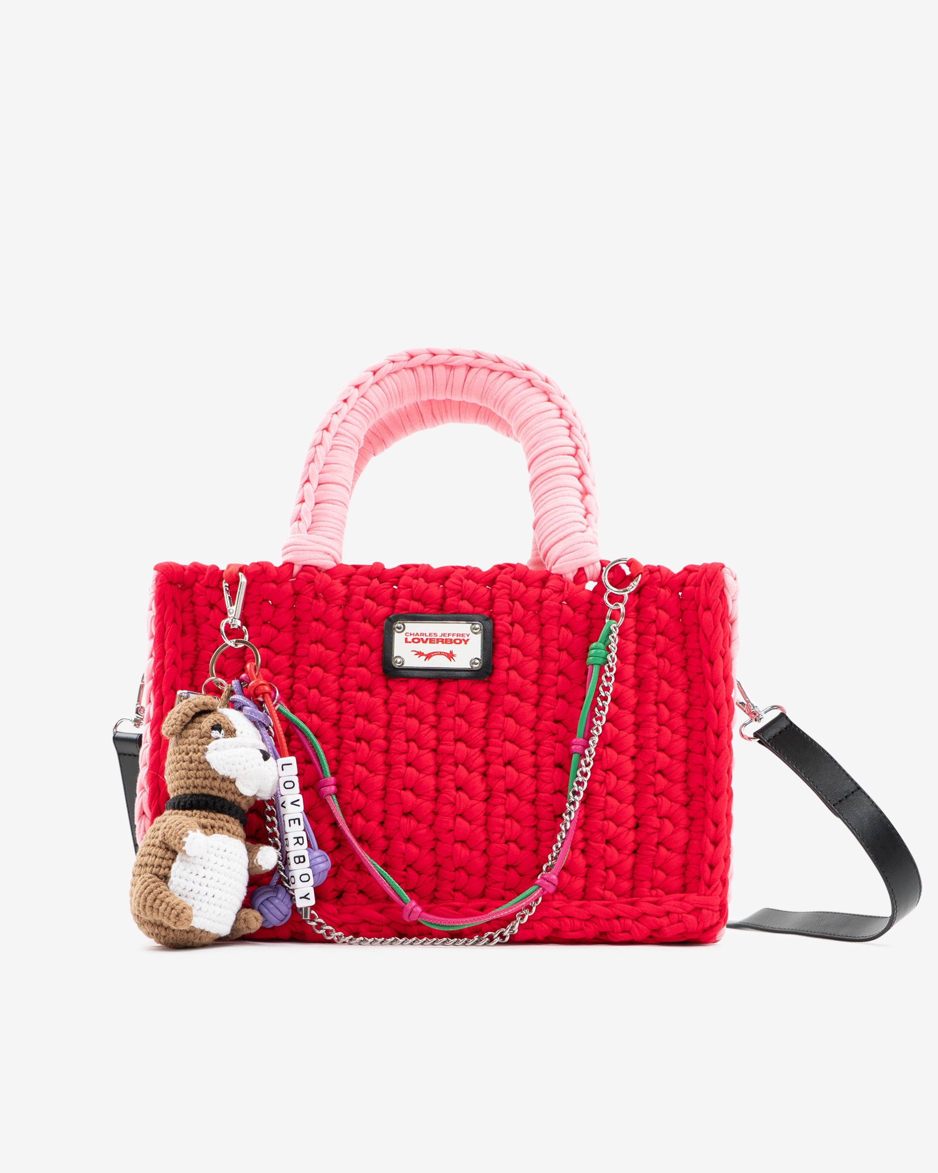 A red crocheted tote bag made from thick yarn using a chunky handwoven technique, featuring pink wrapped handles, metal chain and cord accents, and decorative charm attachments