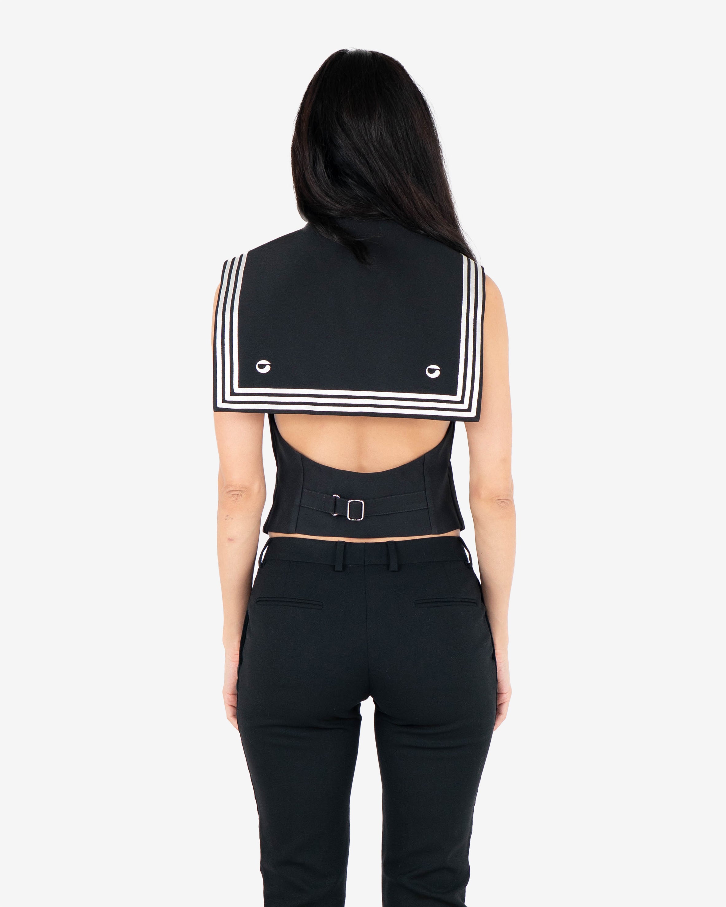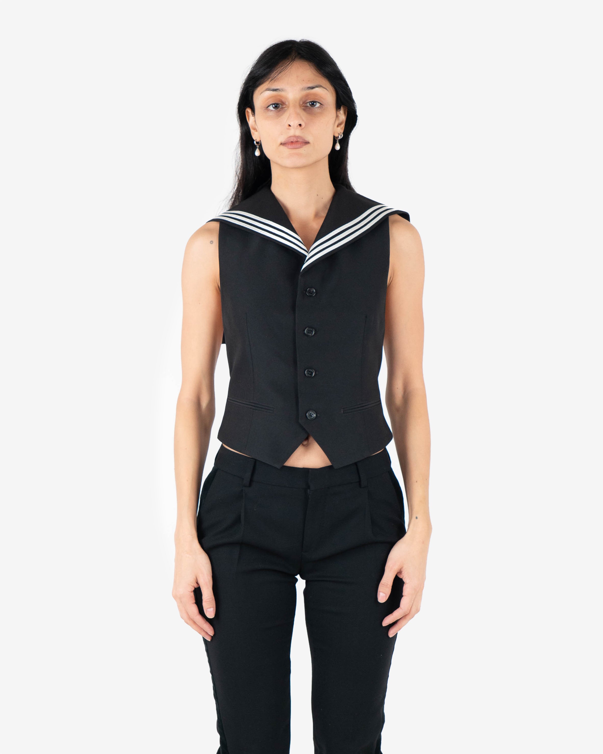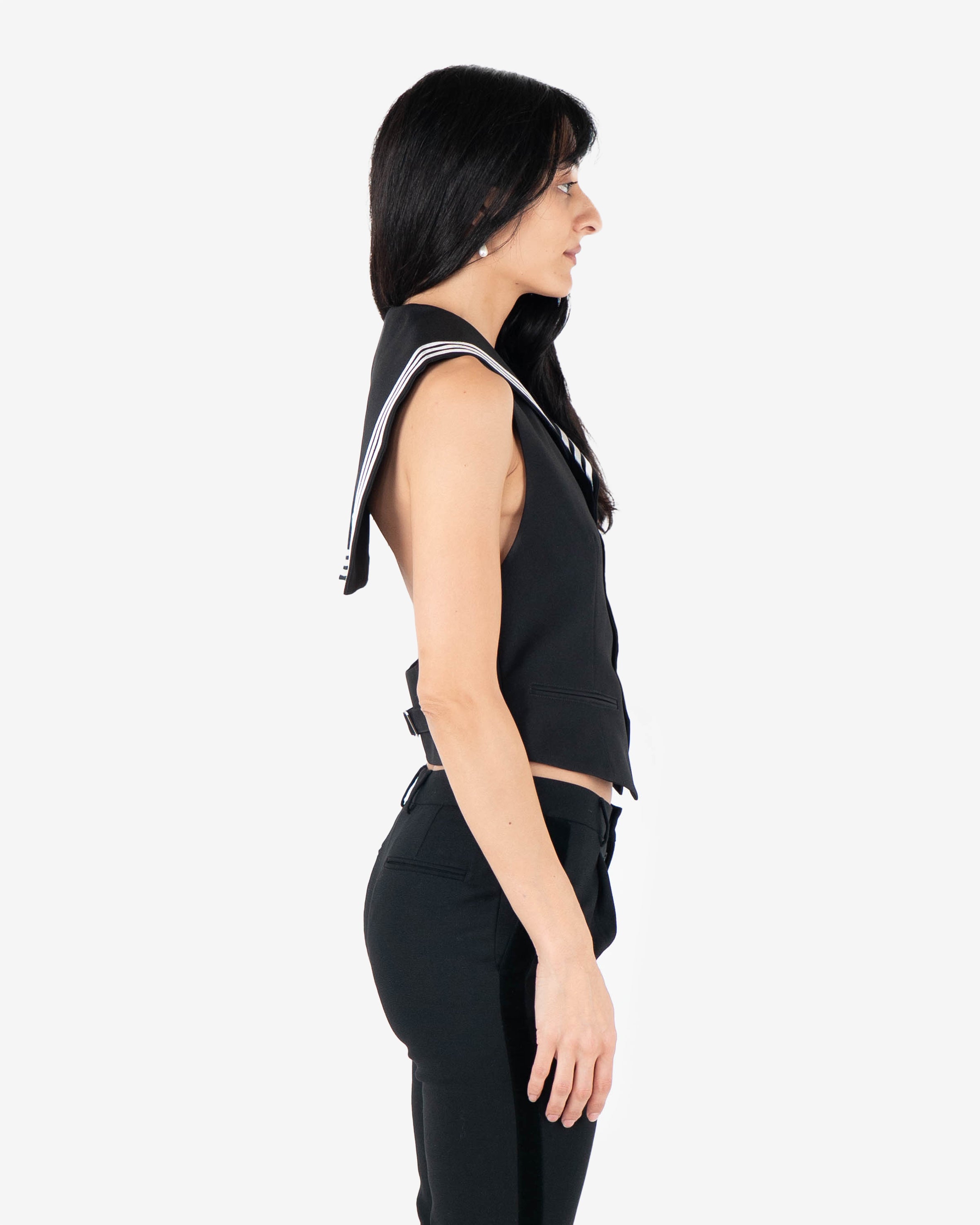 Black tailored sleeveless vest-style top featuring sailor collar with white triple stripe accent. Button-down front closure and two front welt pockets.