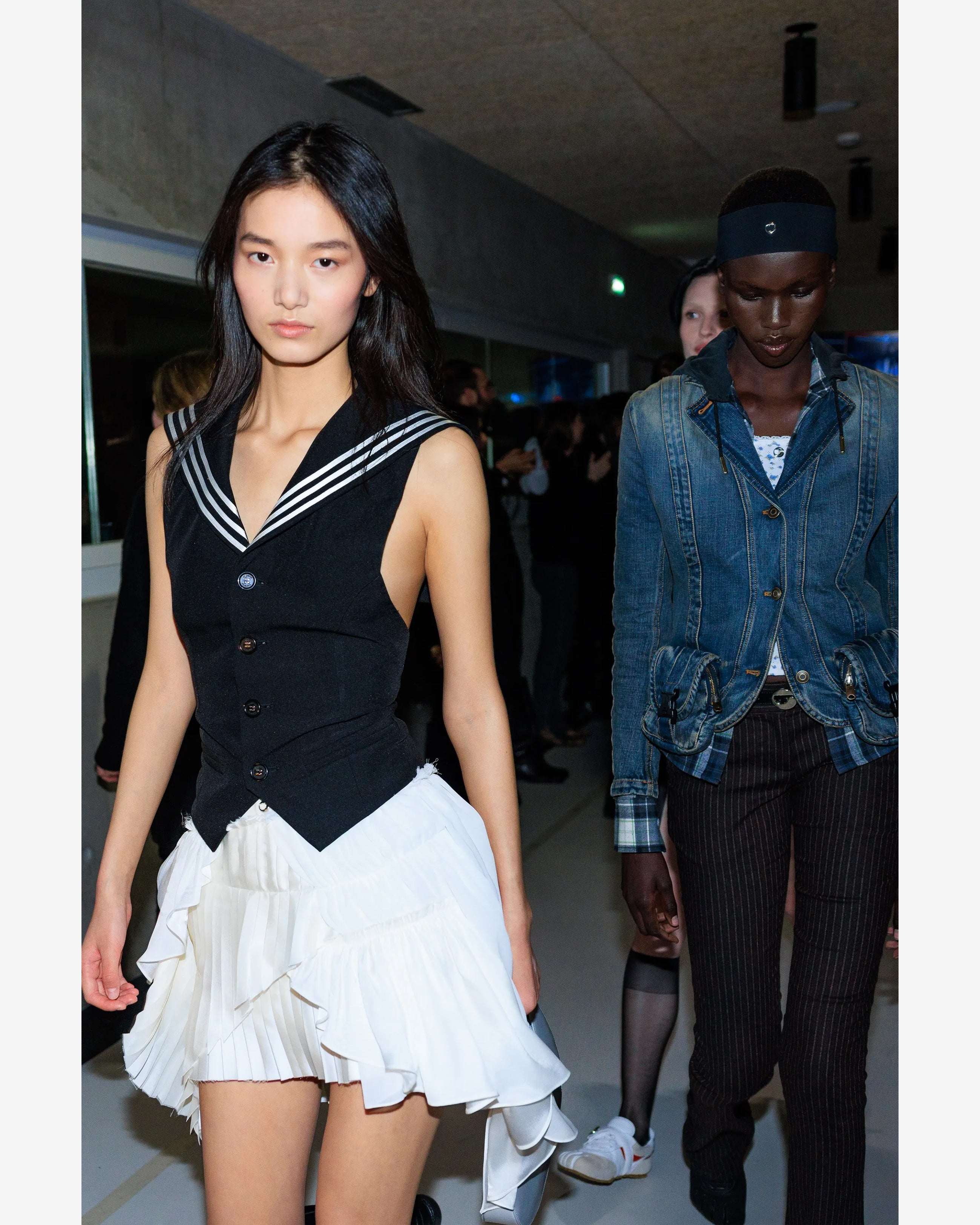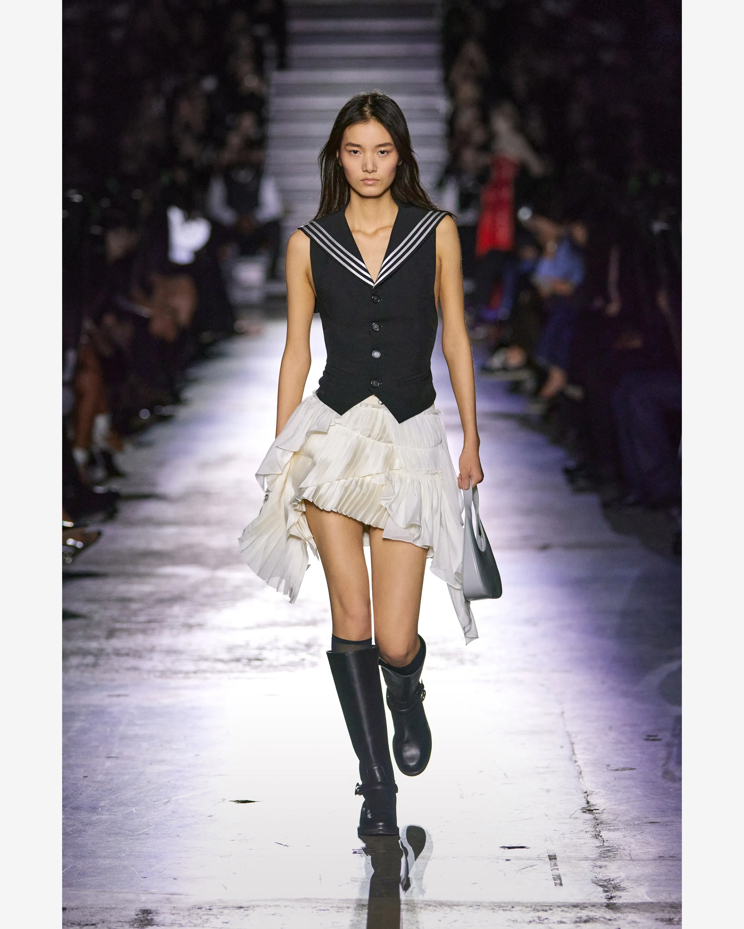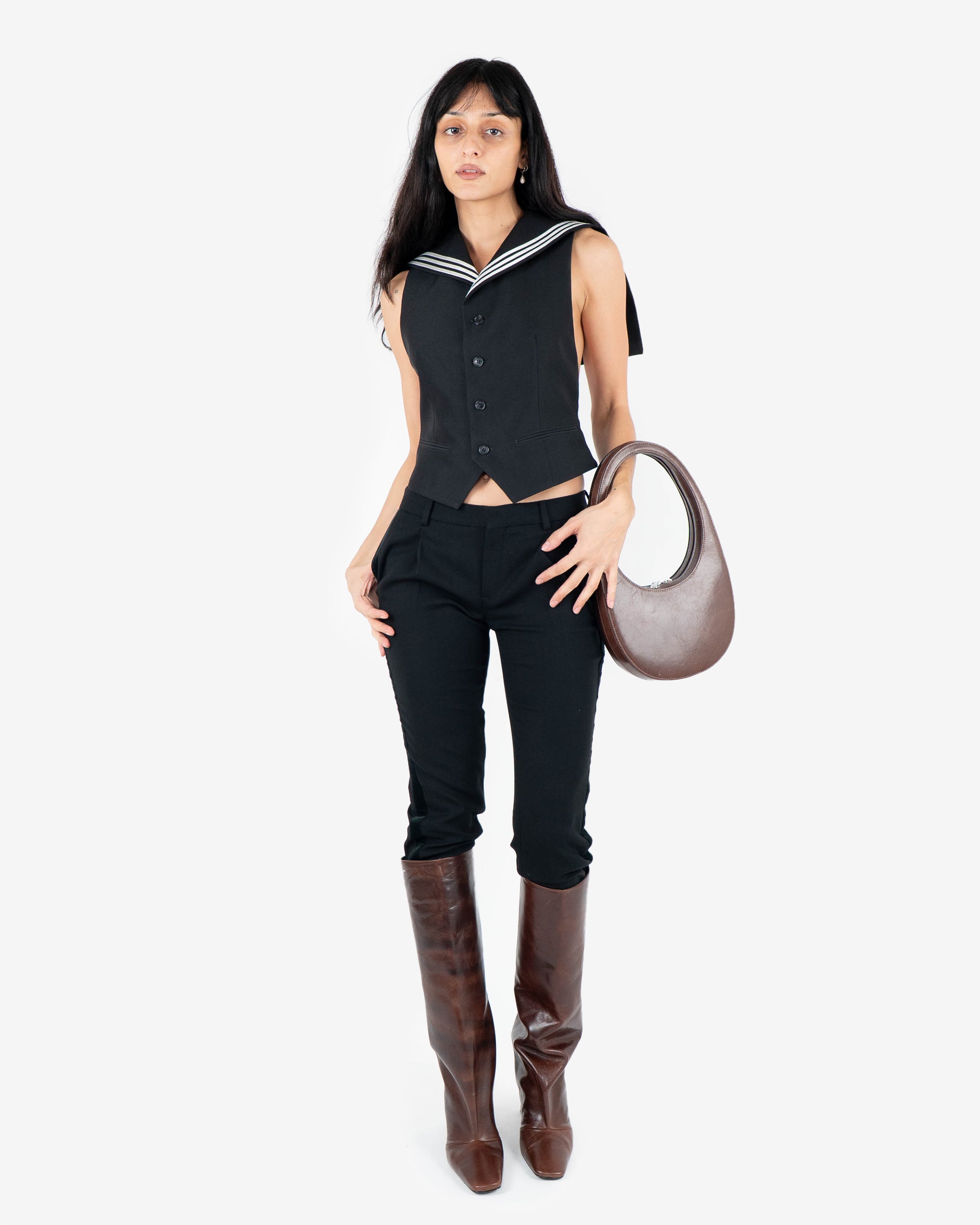 Black tailored sleeveless vest-style top featuring sailor collar with white triple stripe accent. Button-down front closure and two front welt pockets.