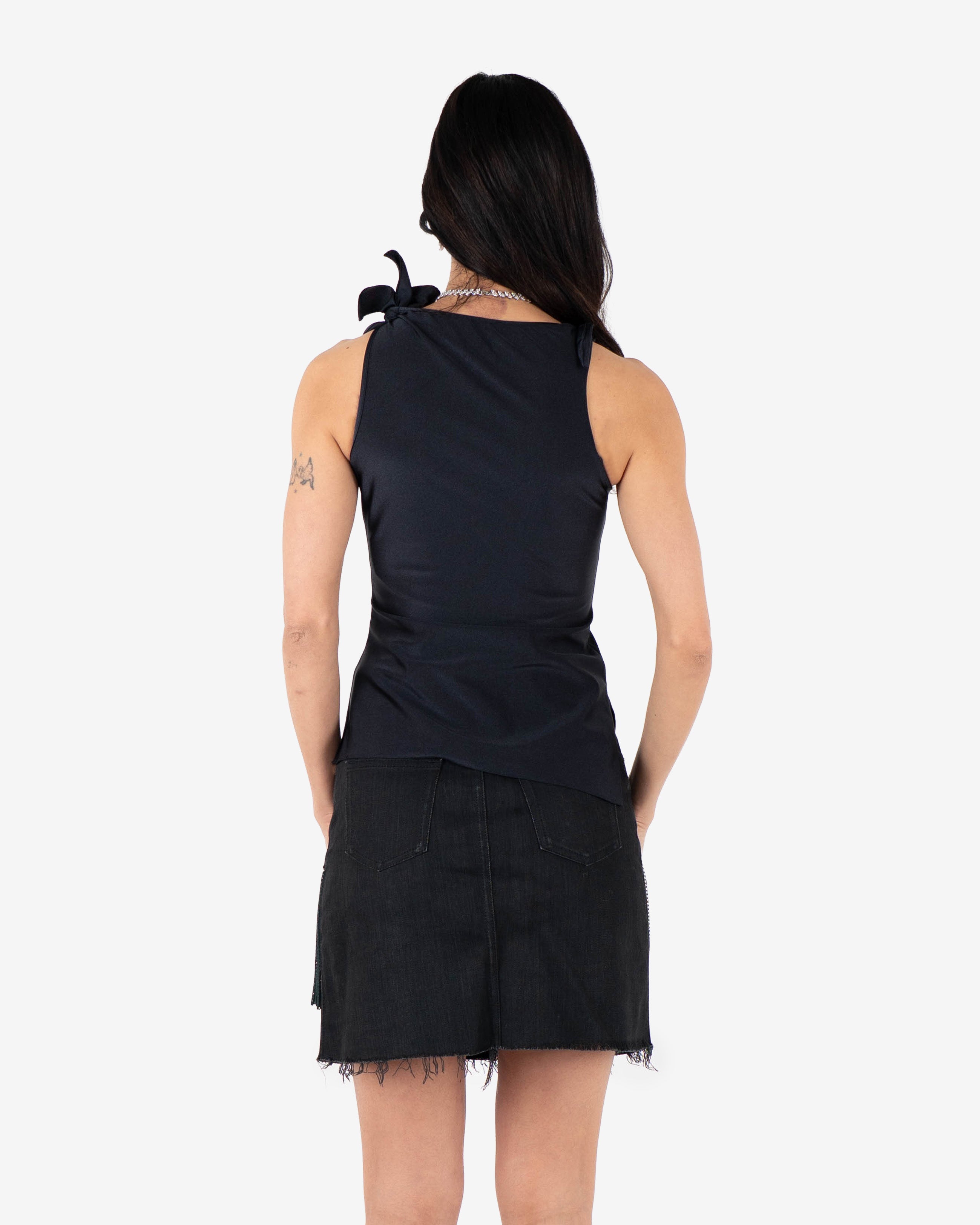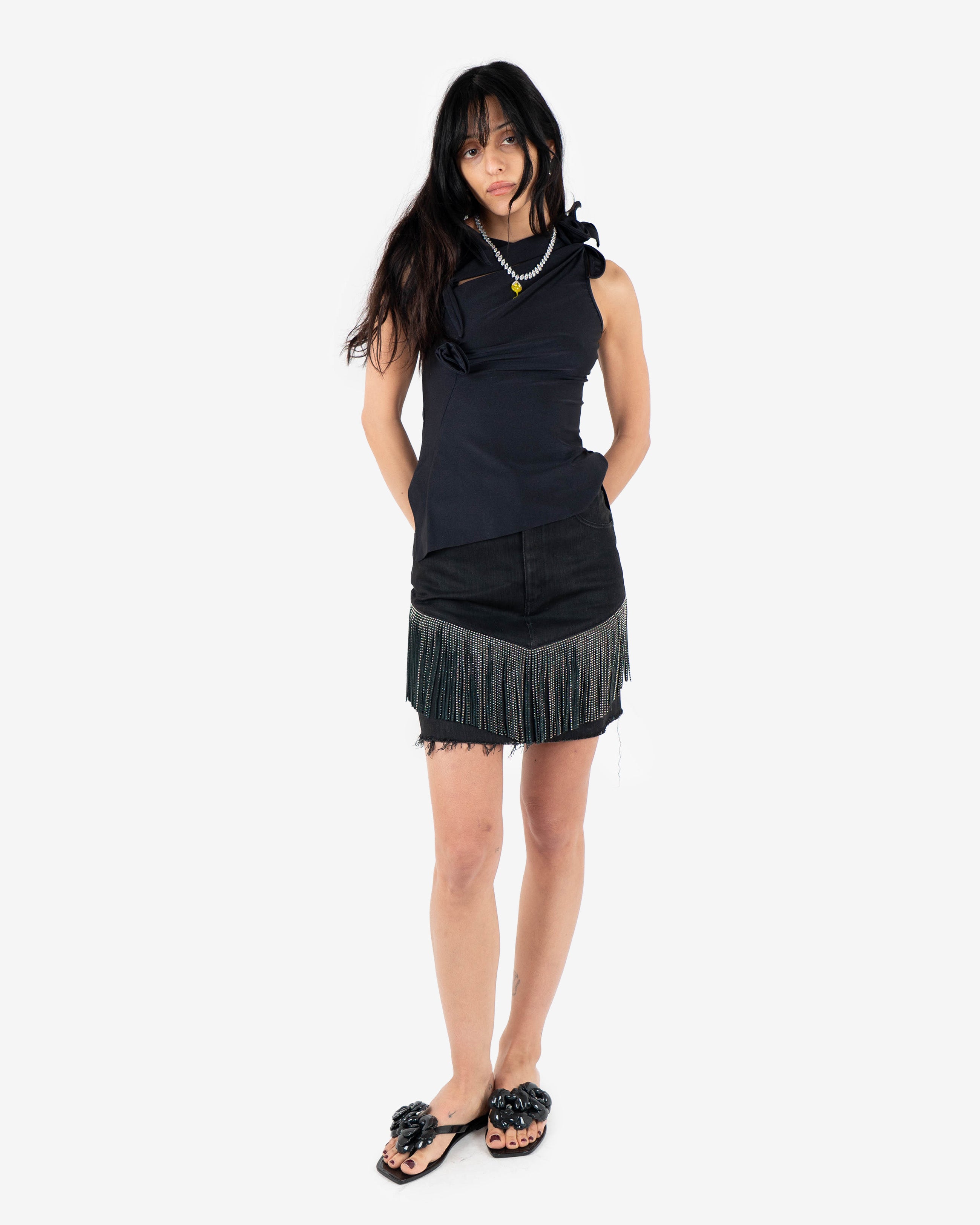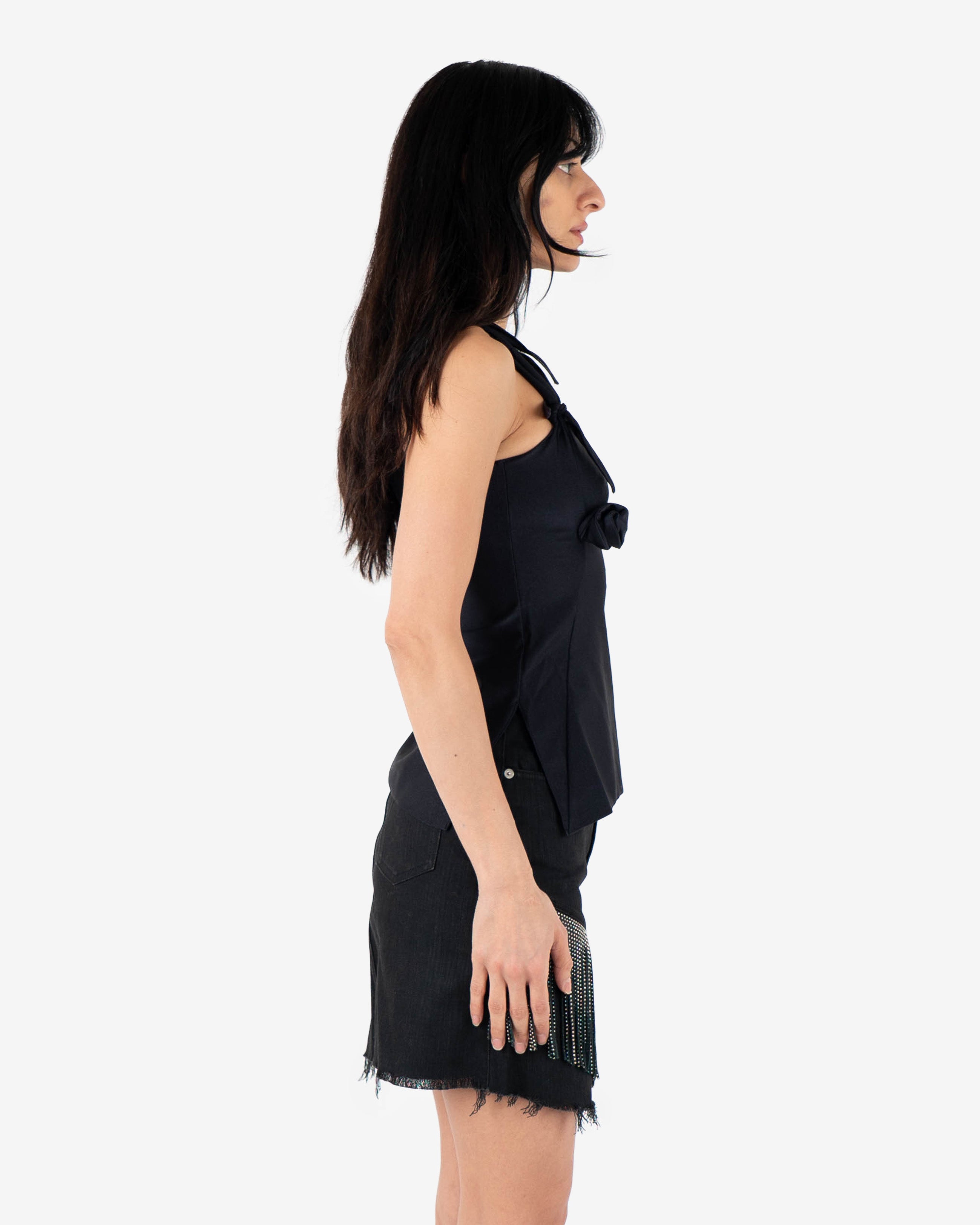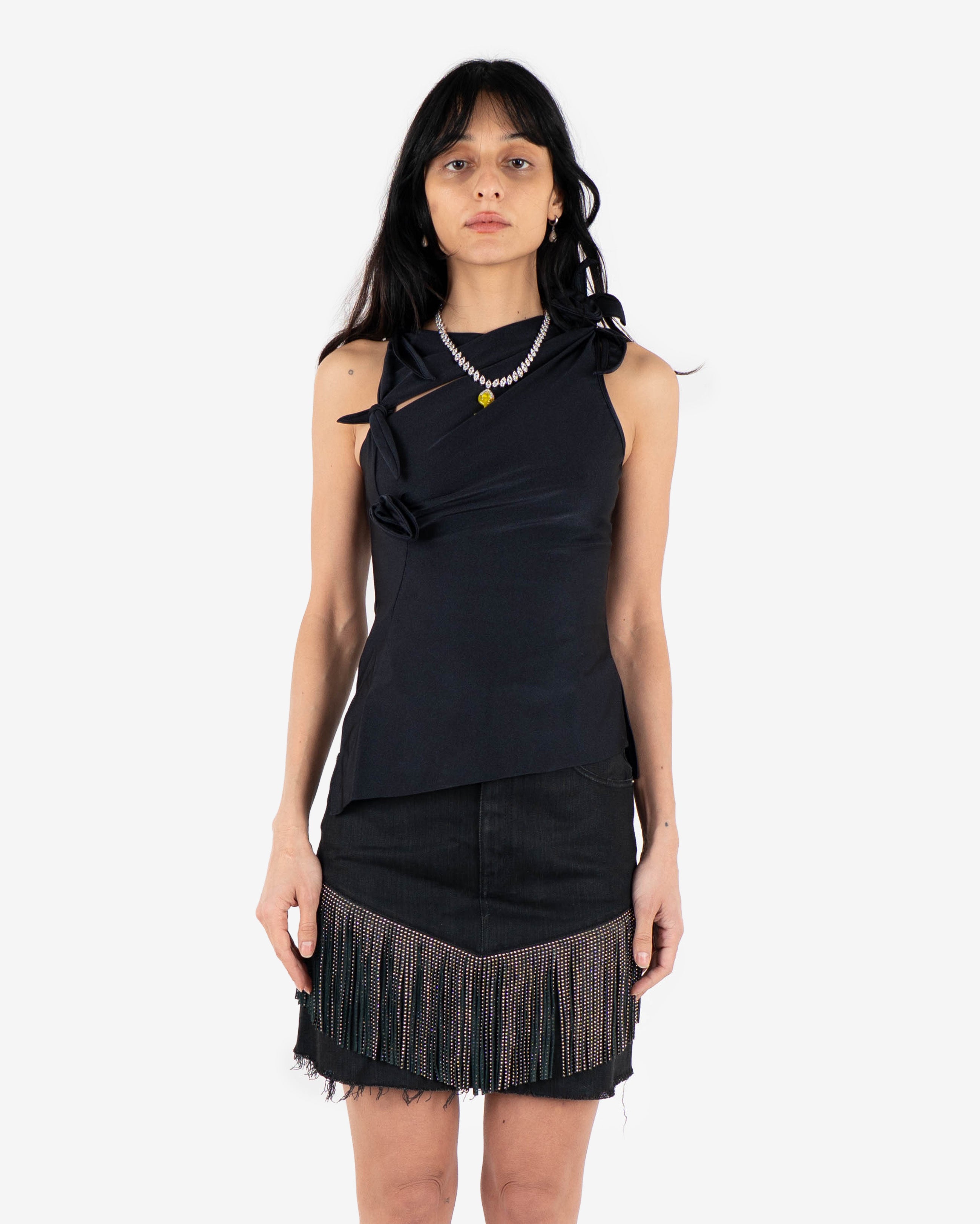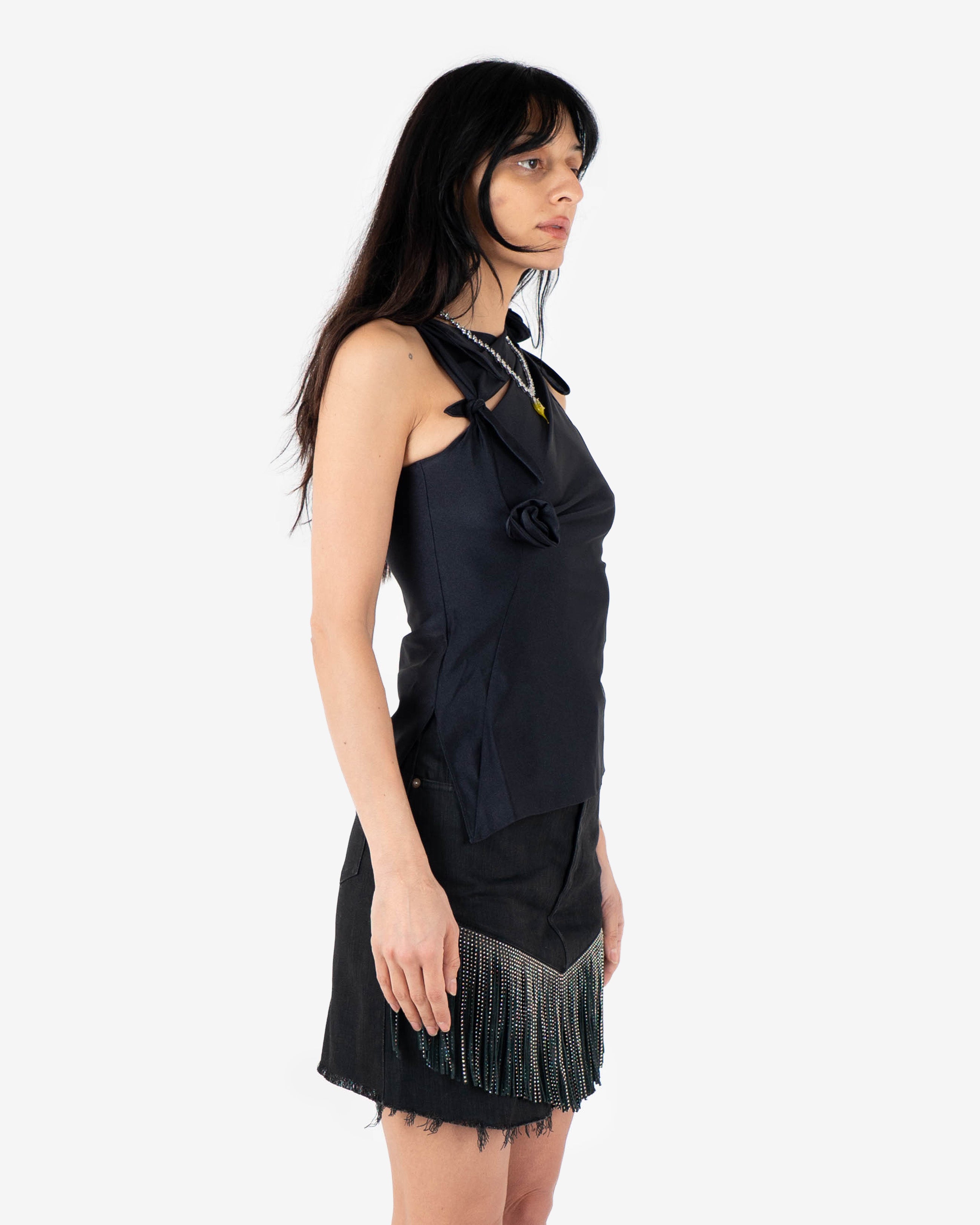 Draped black sleeveless top featuring asymmetric neckline and sculptural flower details.