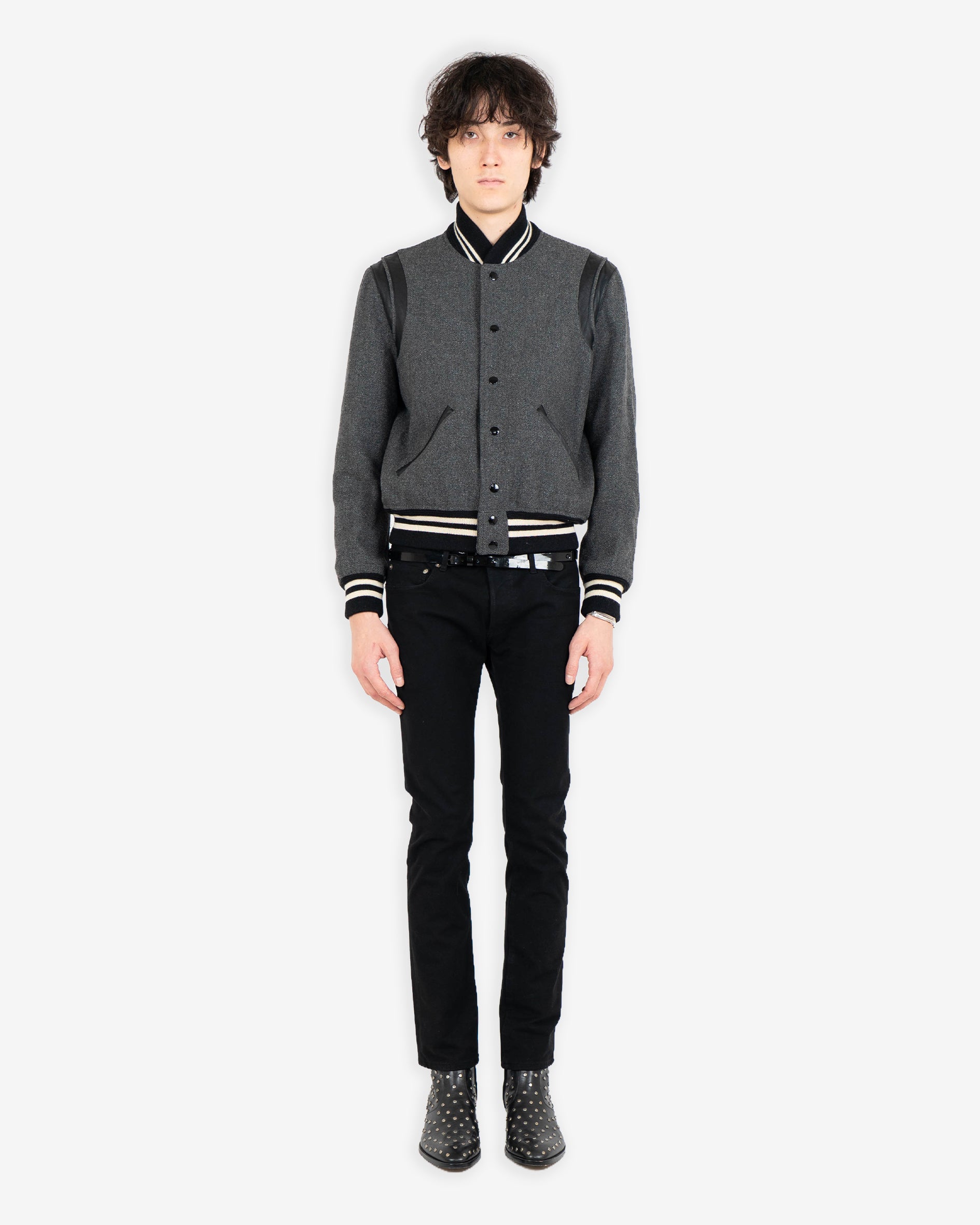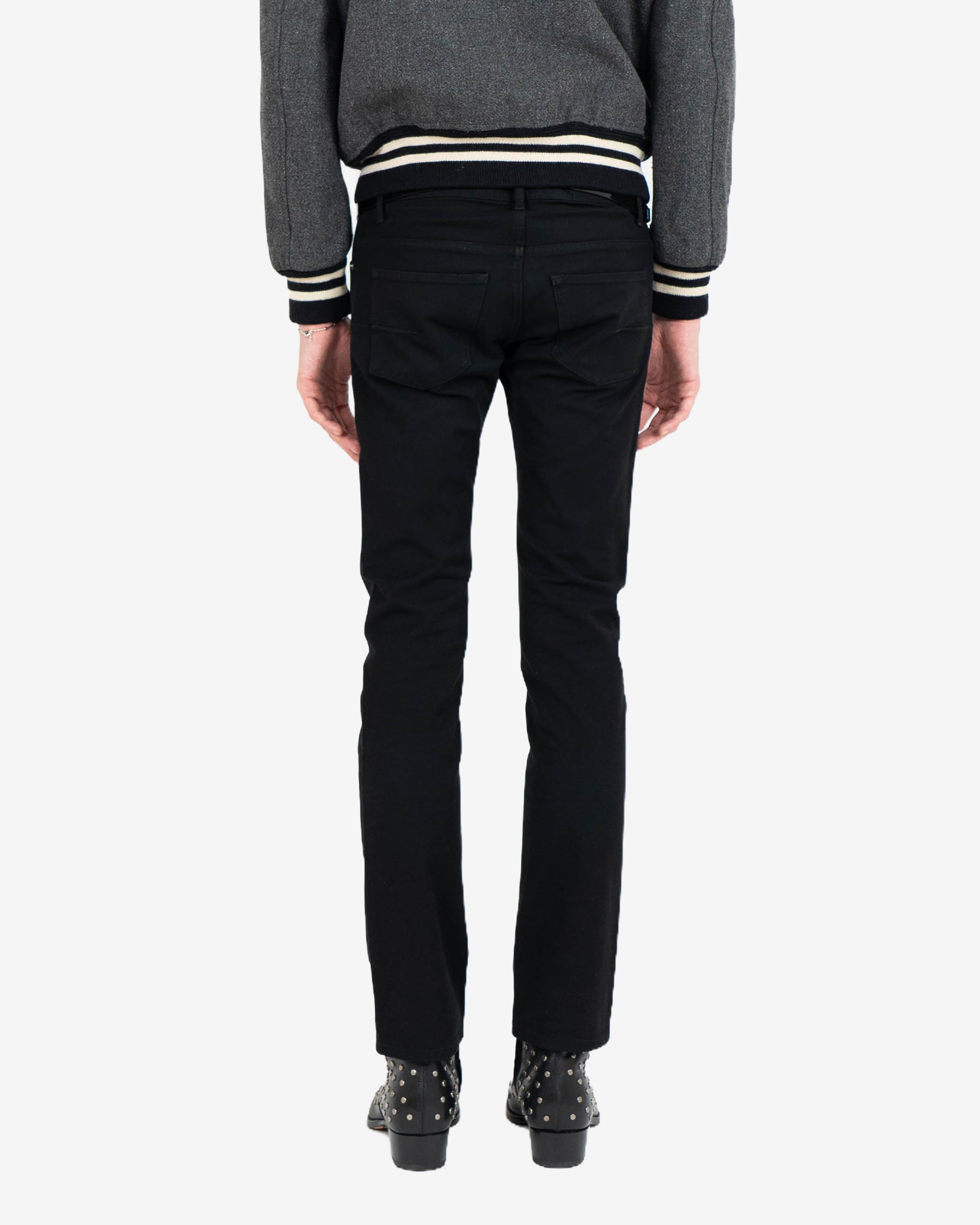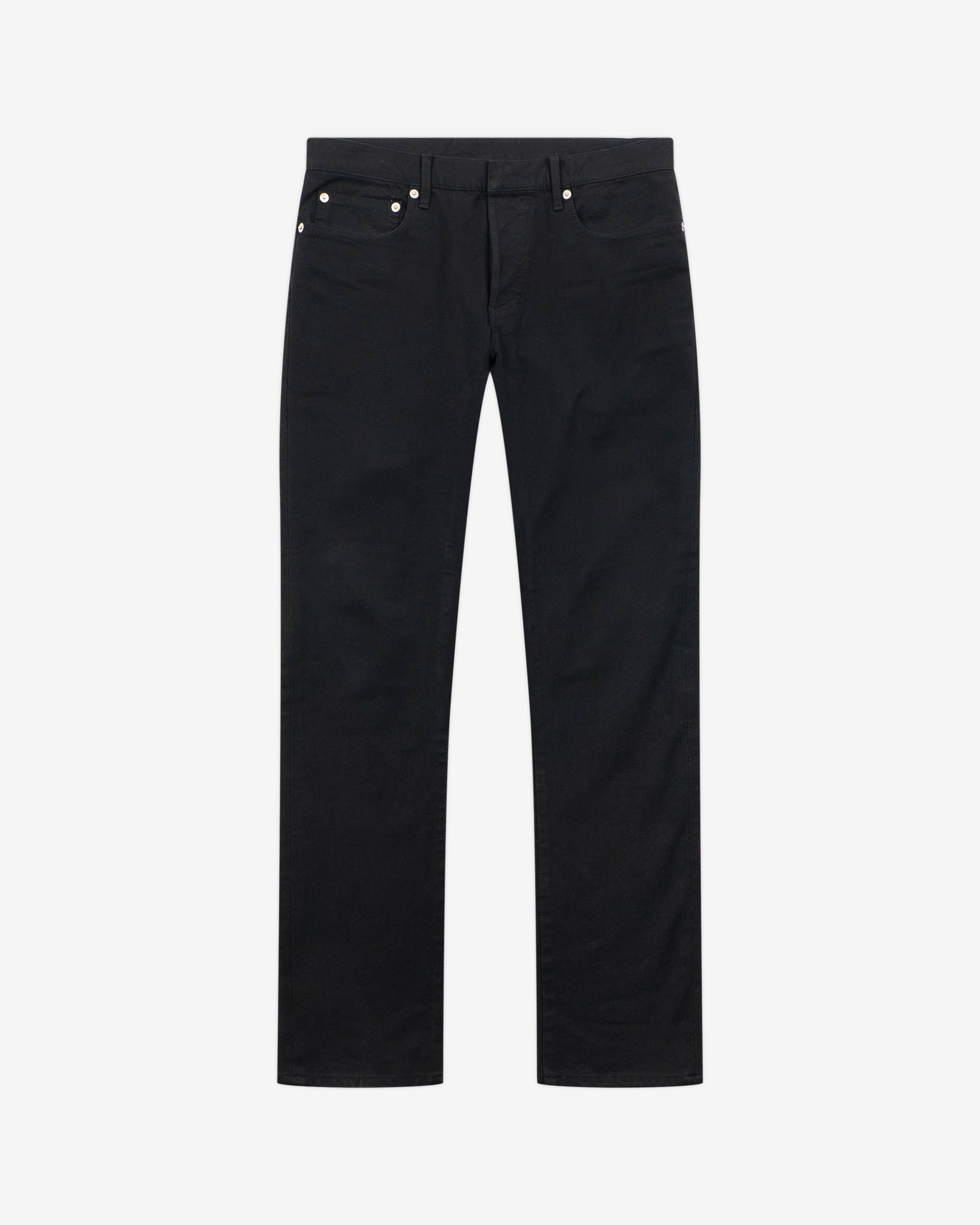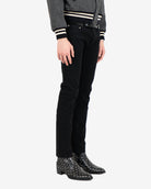 Classic black denim jeans with a skinny cut and shorter outseam. The stretch infused fabric offers a comfortable and flexible fit.
