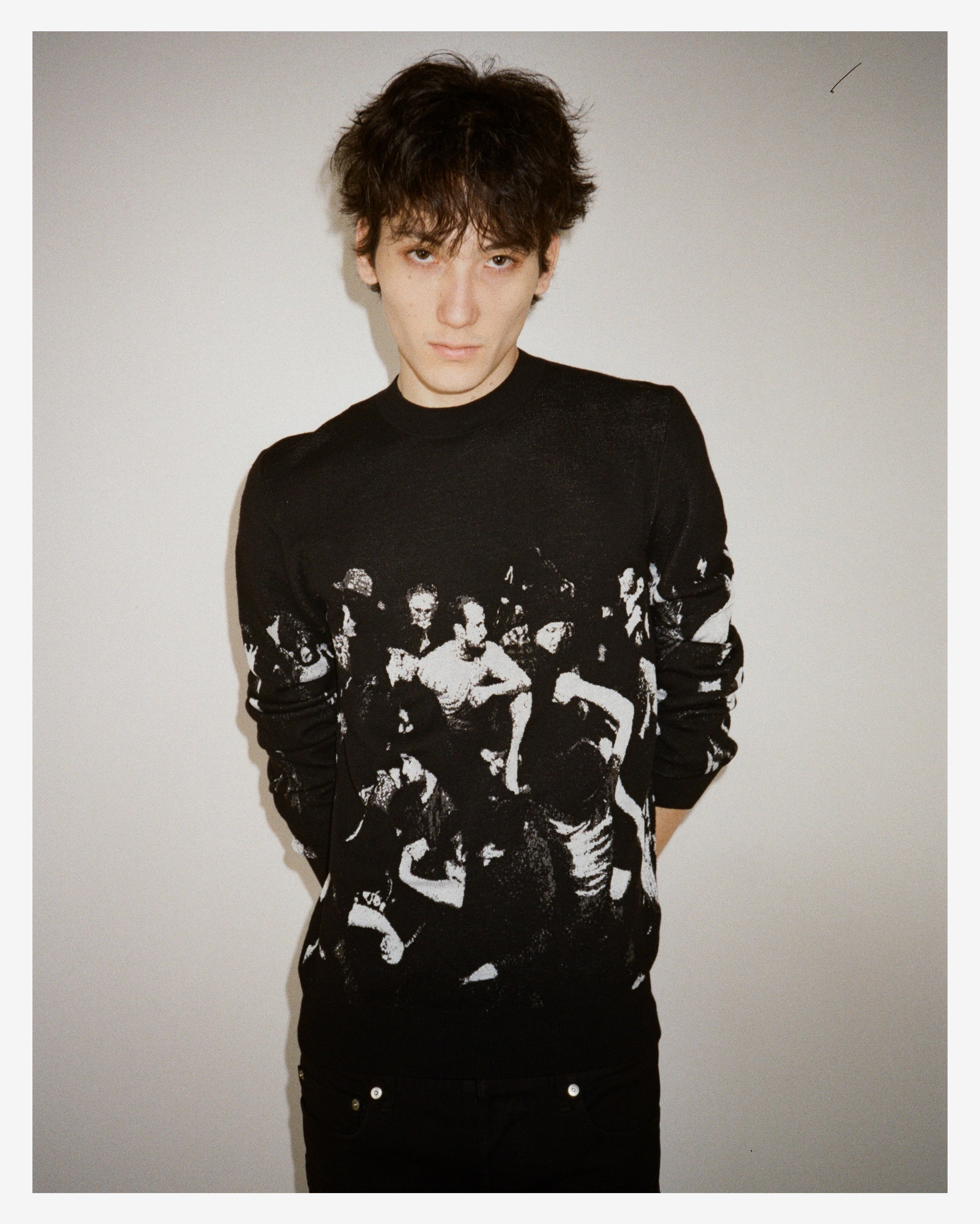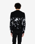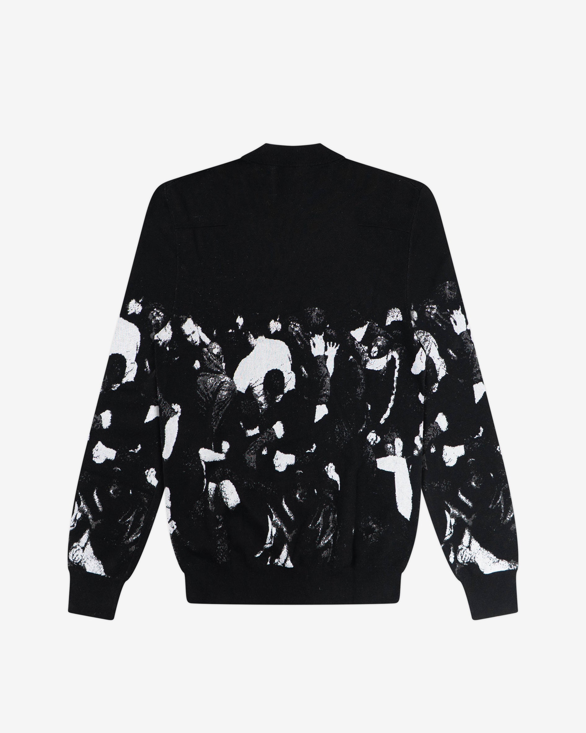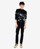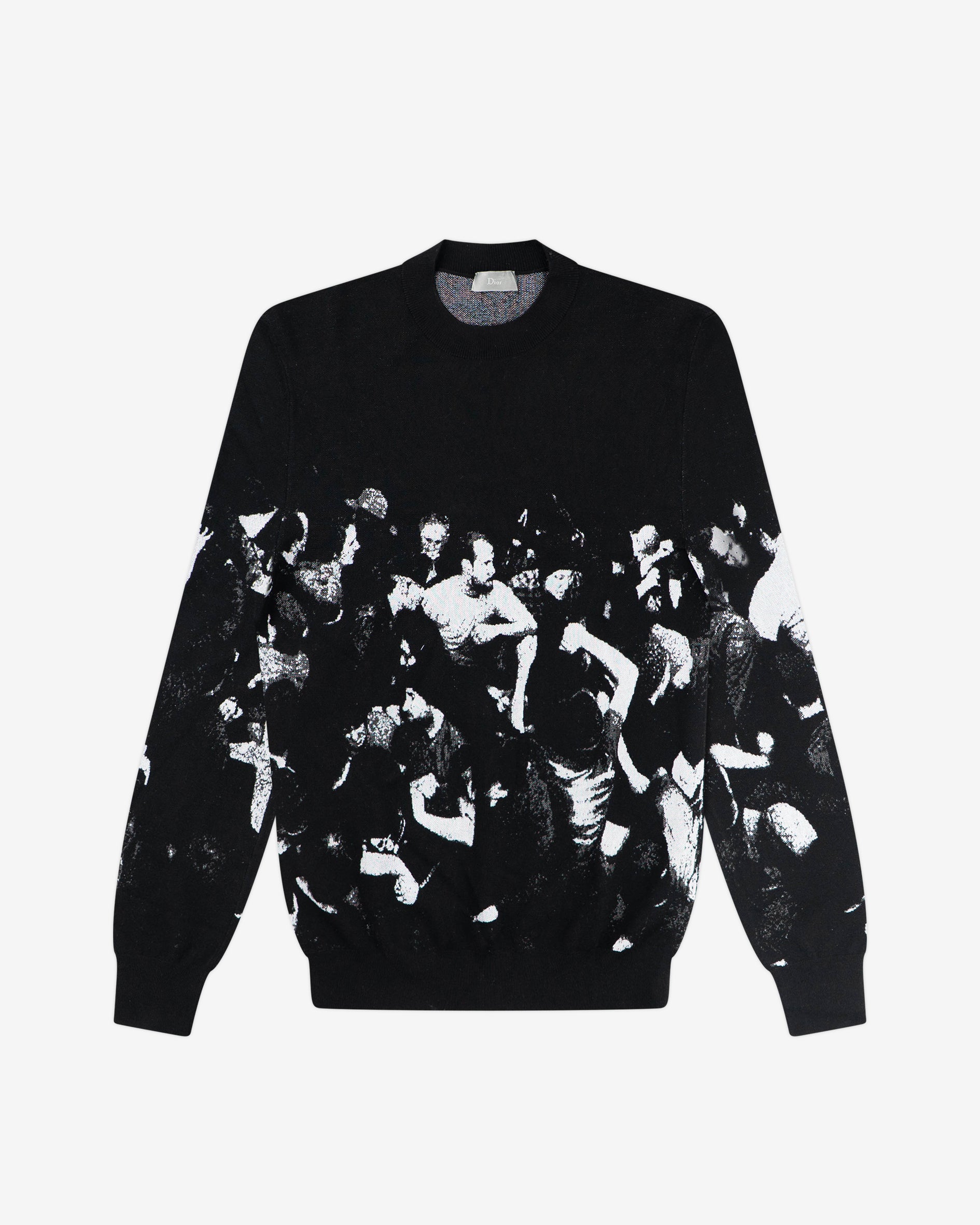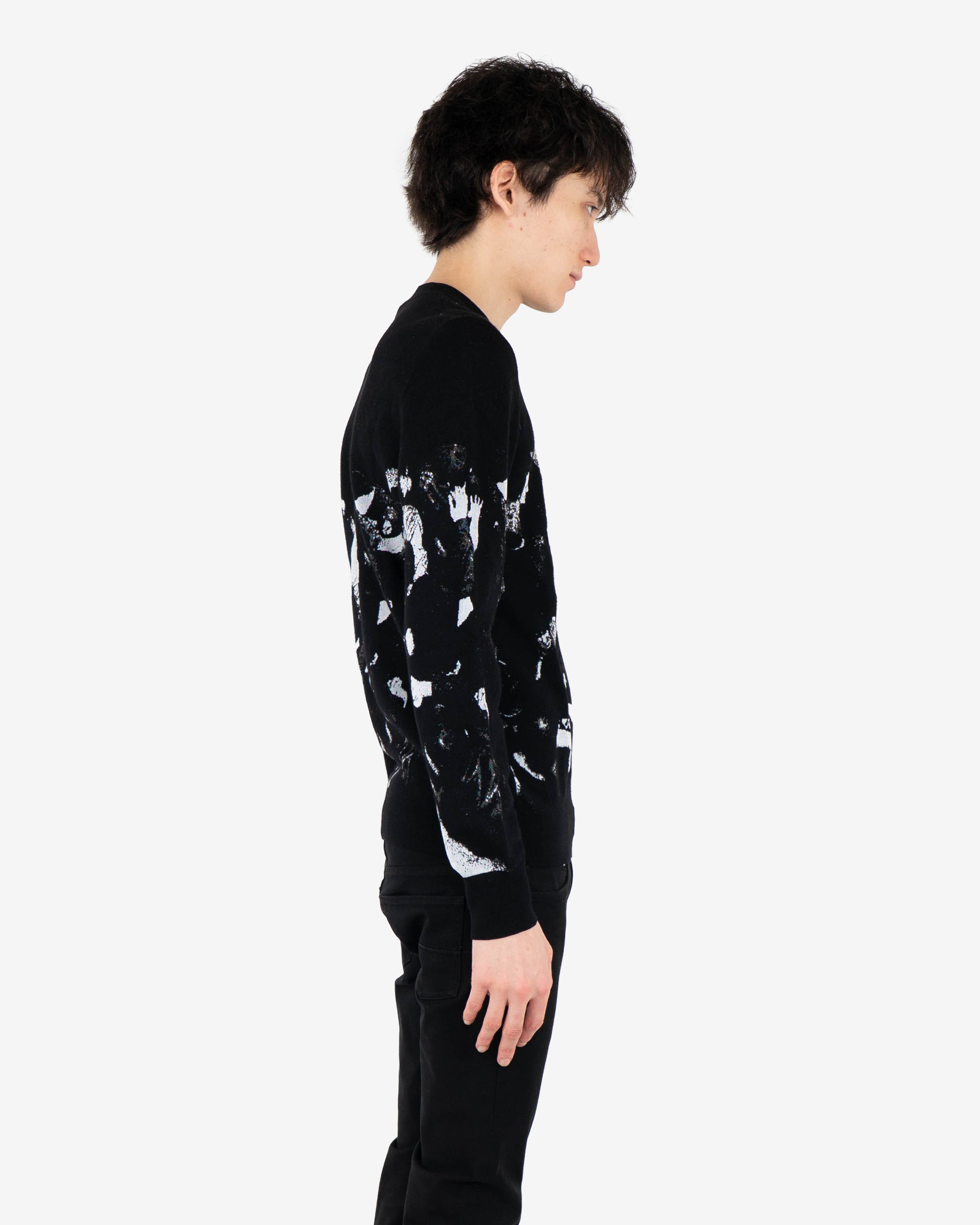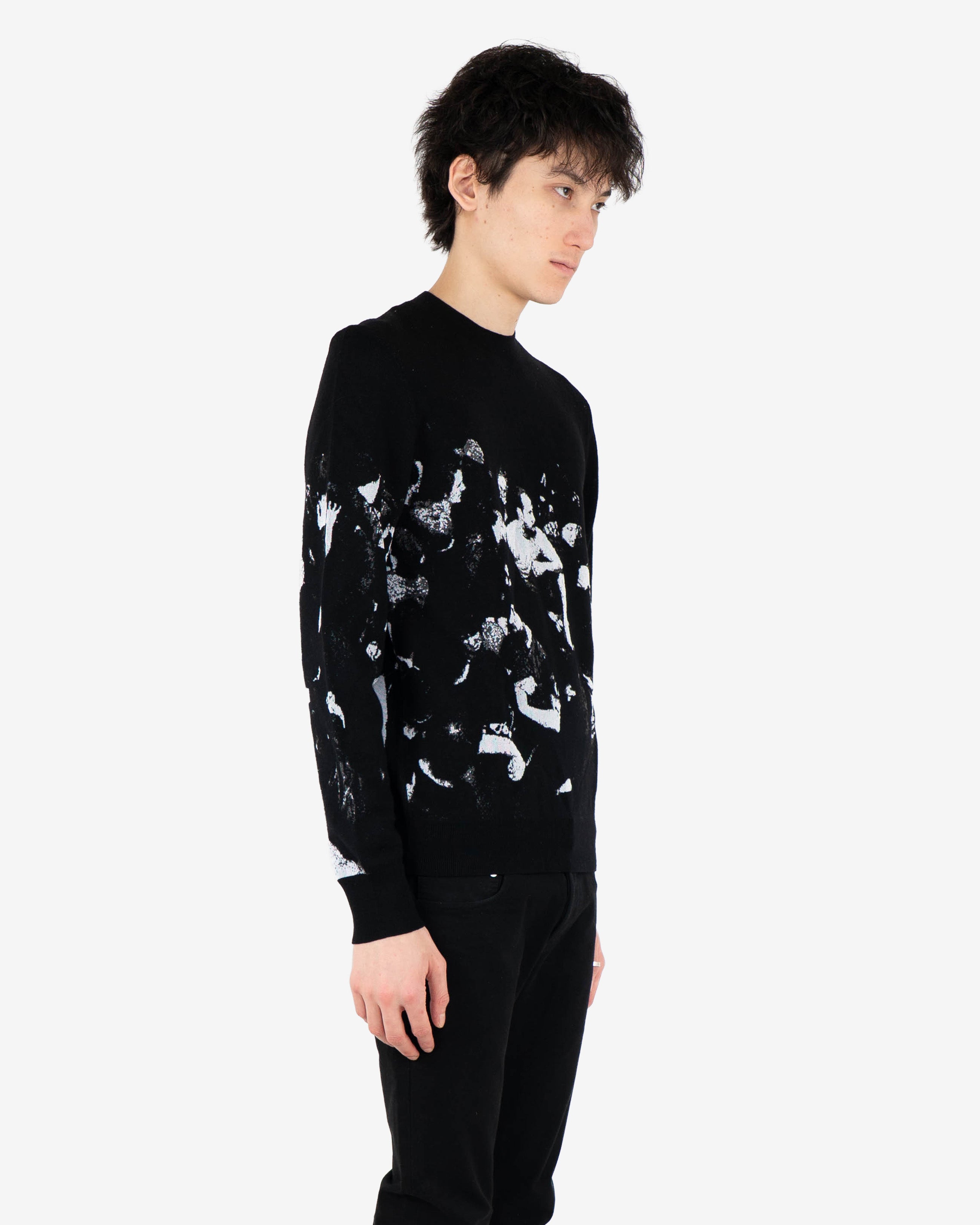 Black crewneck sweater featuring all over print of across the front and sleeves and back.