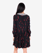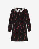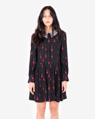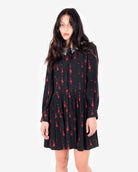 Incredibly unique black and red guitar and star print embroidered women's dress featuring button down front and button cuffs and lace contrast collar; from Hedi's psych rock collection.