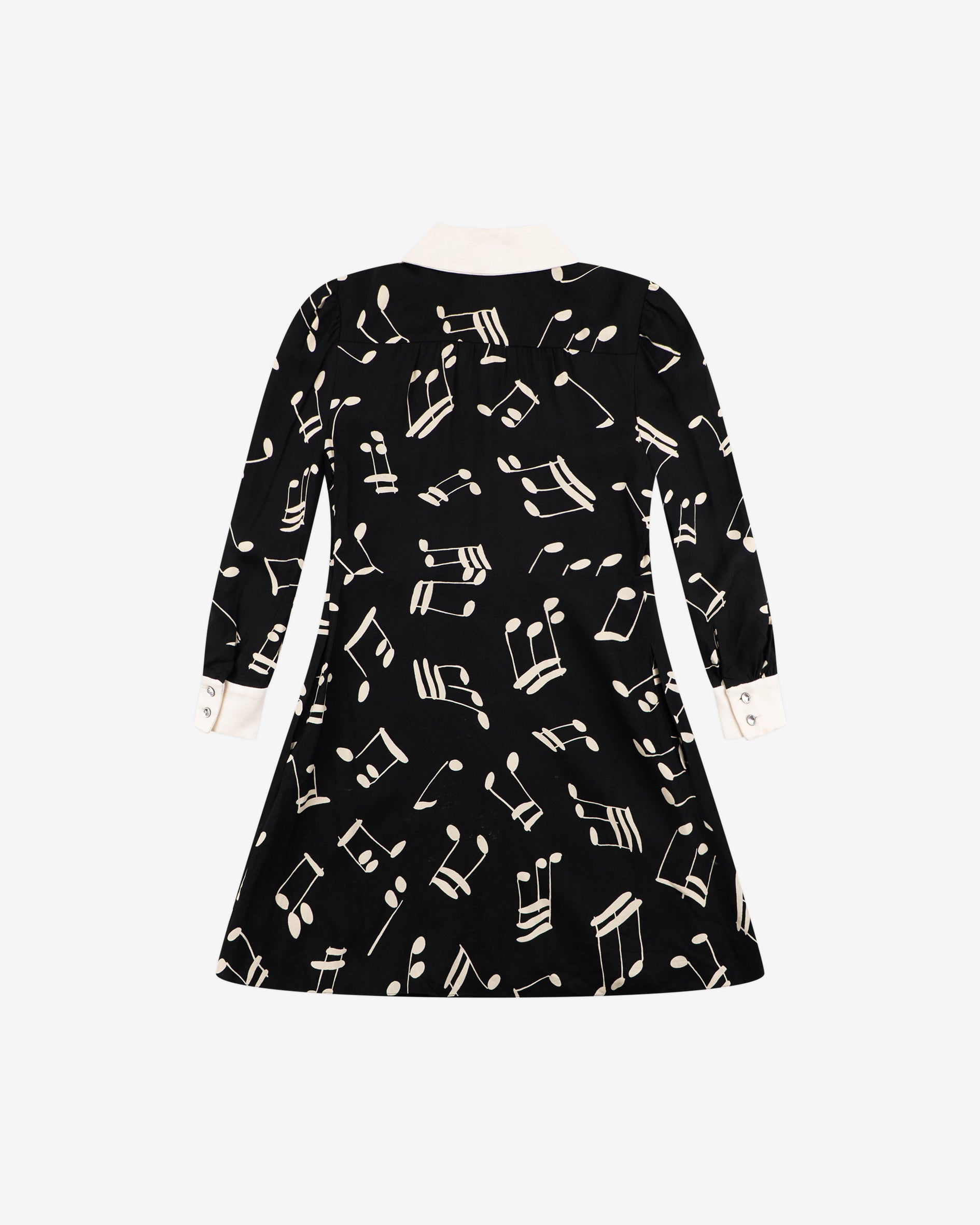 black A-line dress with a white collar and cuffs, featuring long sleeves and, white musical note print glass diamond-style buttons for closure.