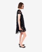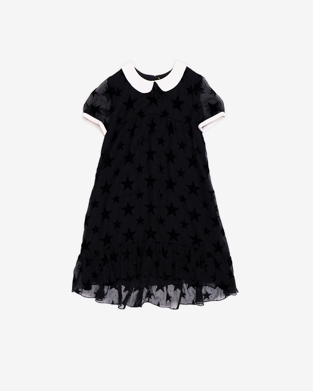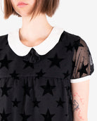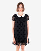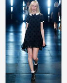 Babydoll style minidress with white contrast Peter Pan collar, white trim on cap sleeves, and ruffled hem. As seen on the runway that seasons.