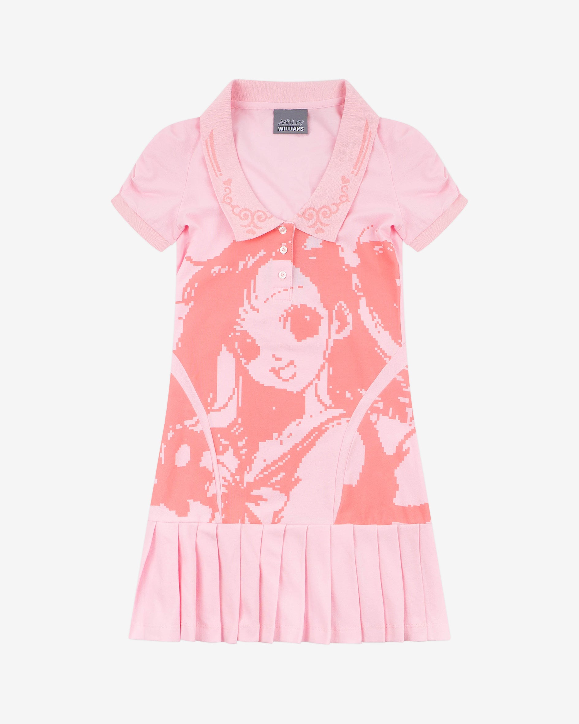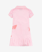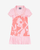 Pink 3/4 sleeve cotton piqué minidress with pink manga graphic featuring pleated low-rise skirt and a rib knit polo-style collar featuring black stripe trim and button-down front.