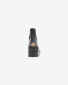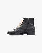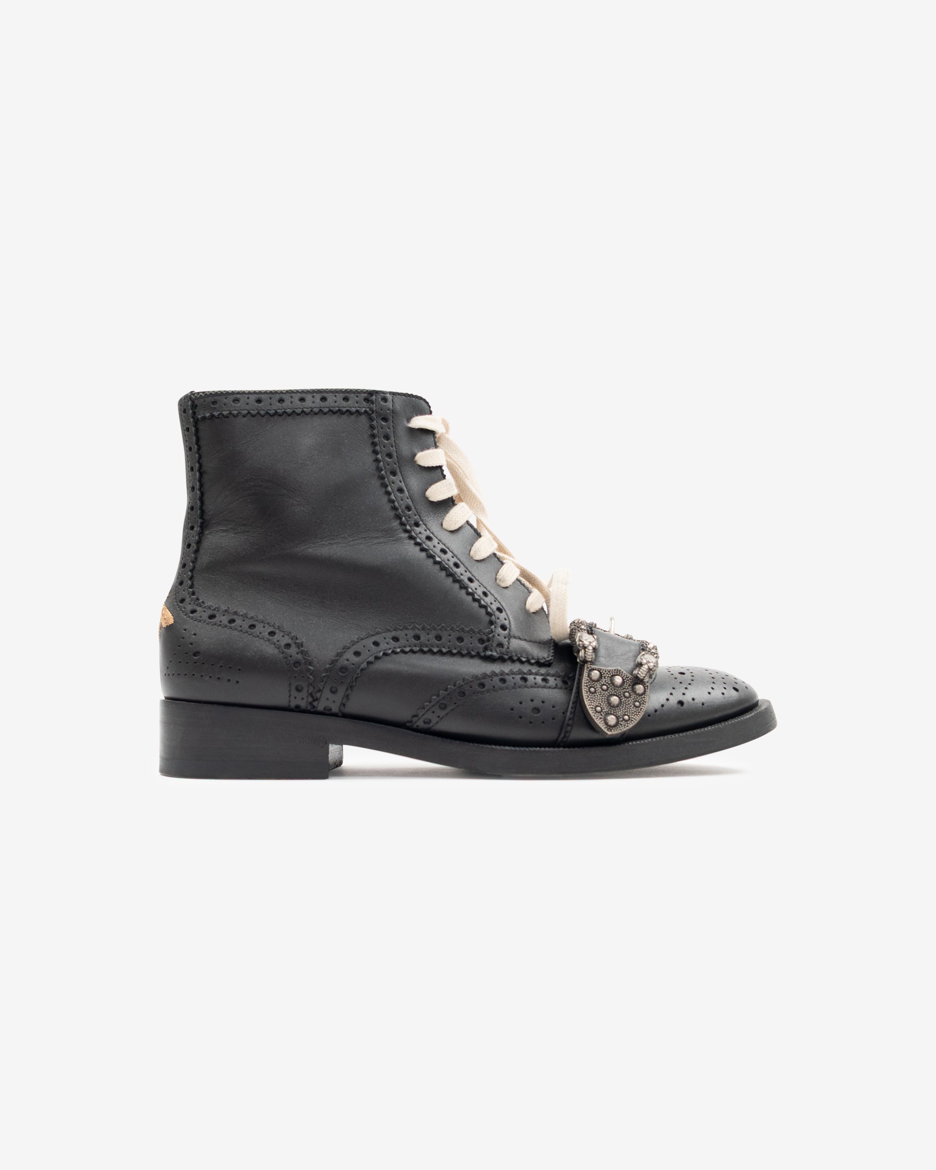 Black leather ankle boots featuring classic brogue perforations, cream laces, and decorative metal buckle at the toe.