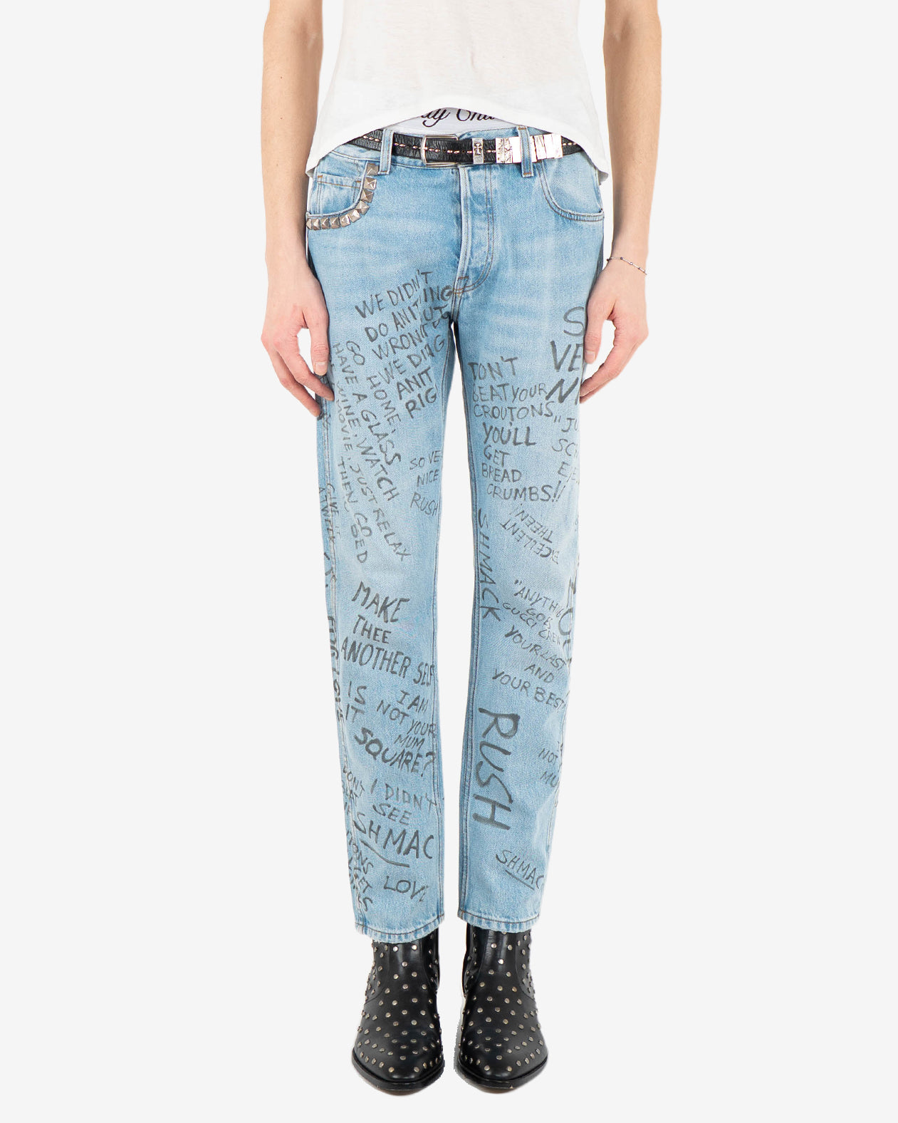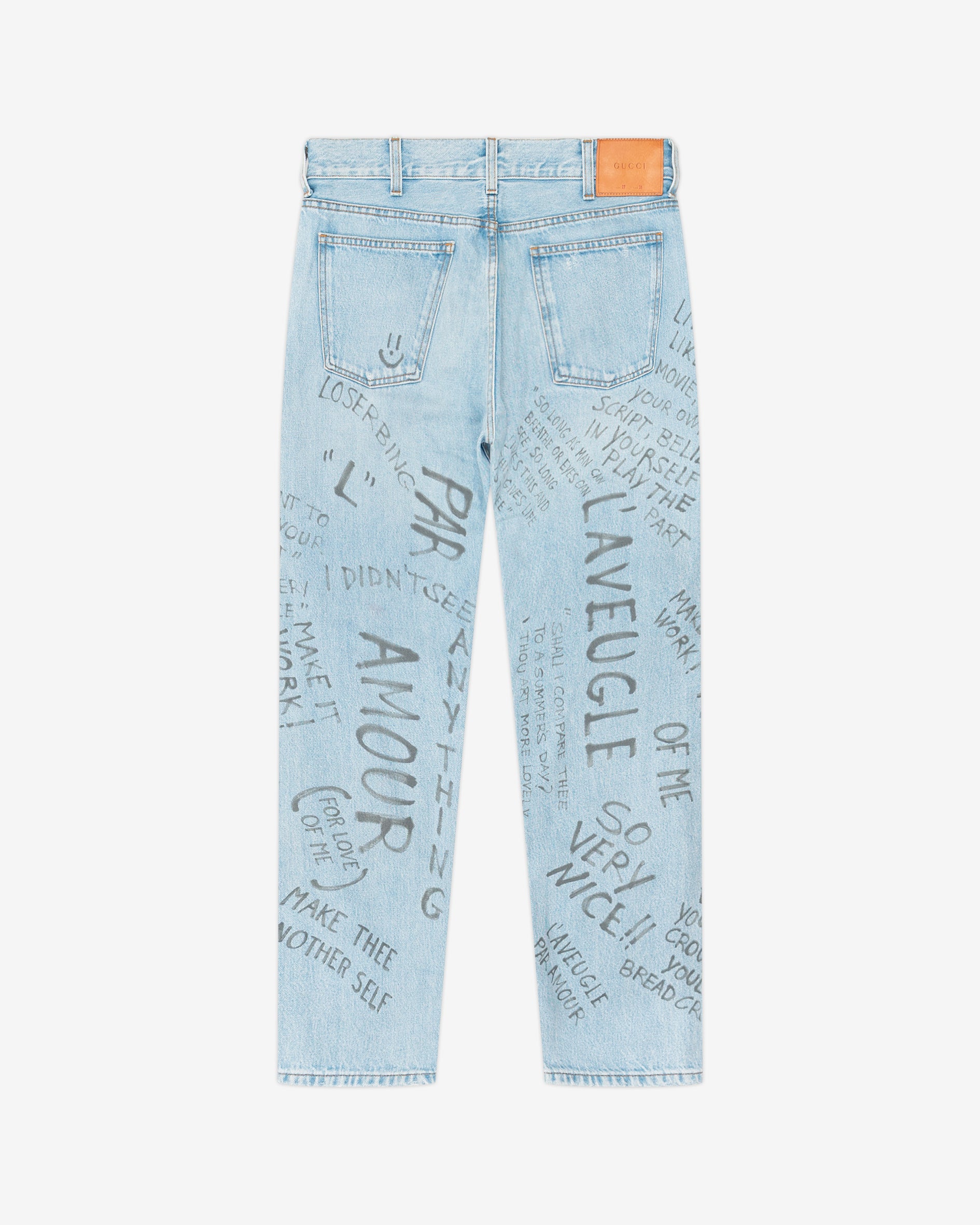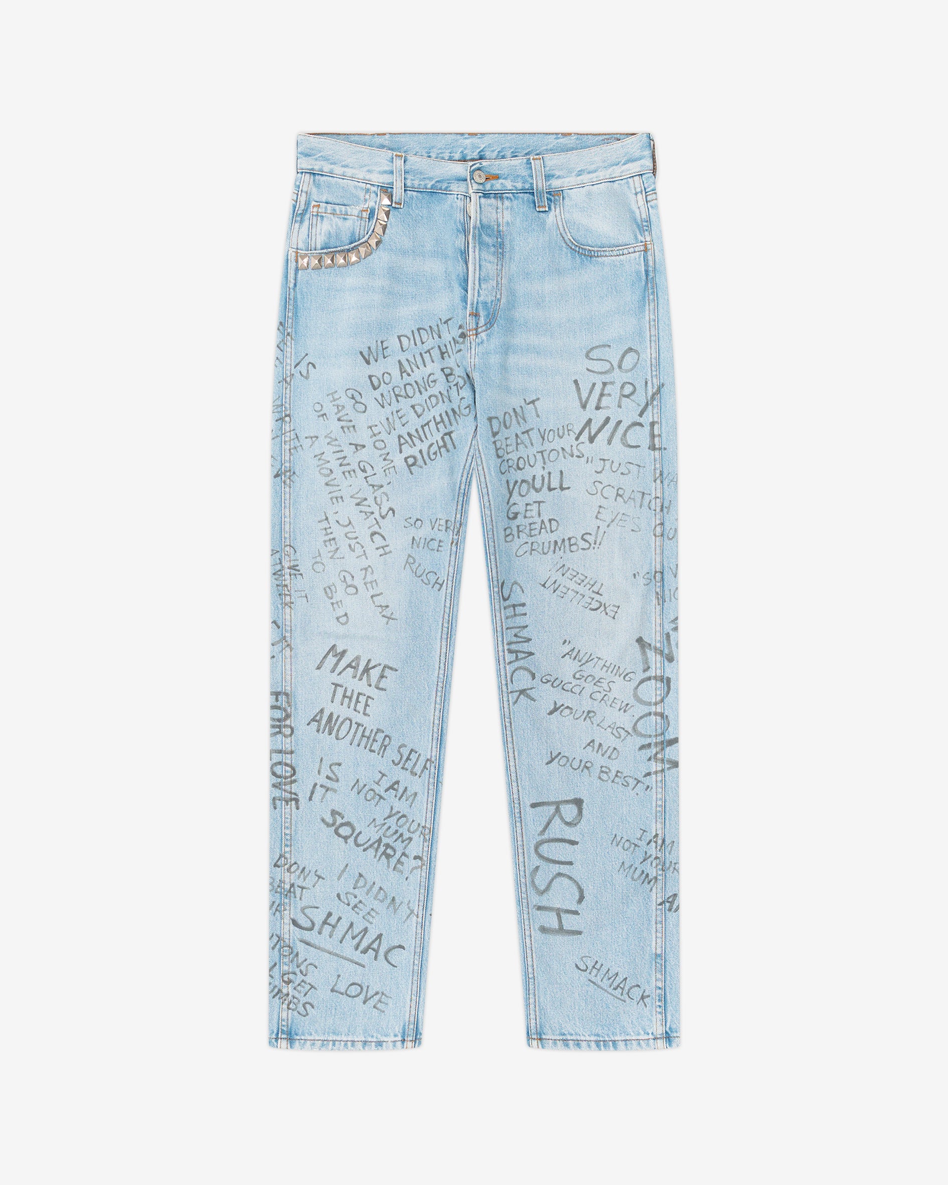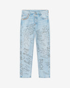 This light-wash straight-leg denim features an all-over handwritten graffiti text and metal stud detailing on the pocket.