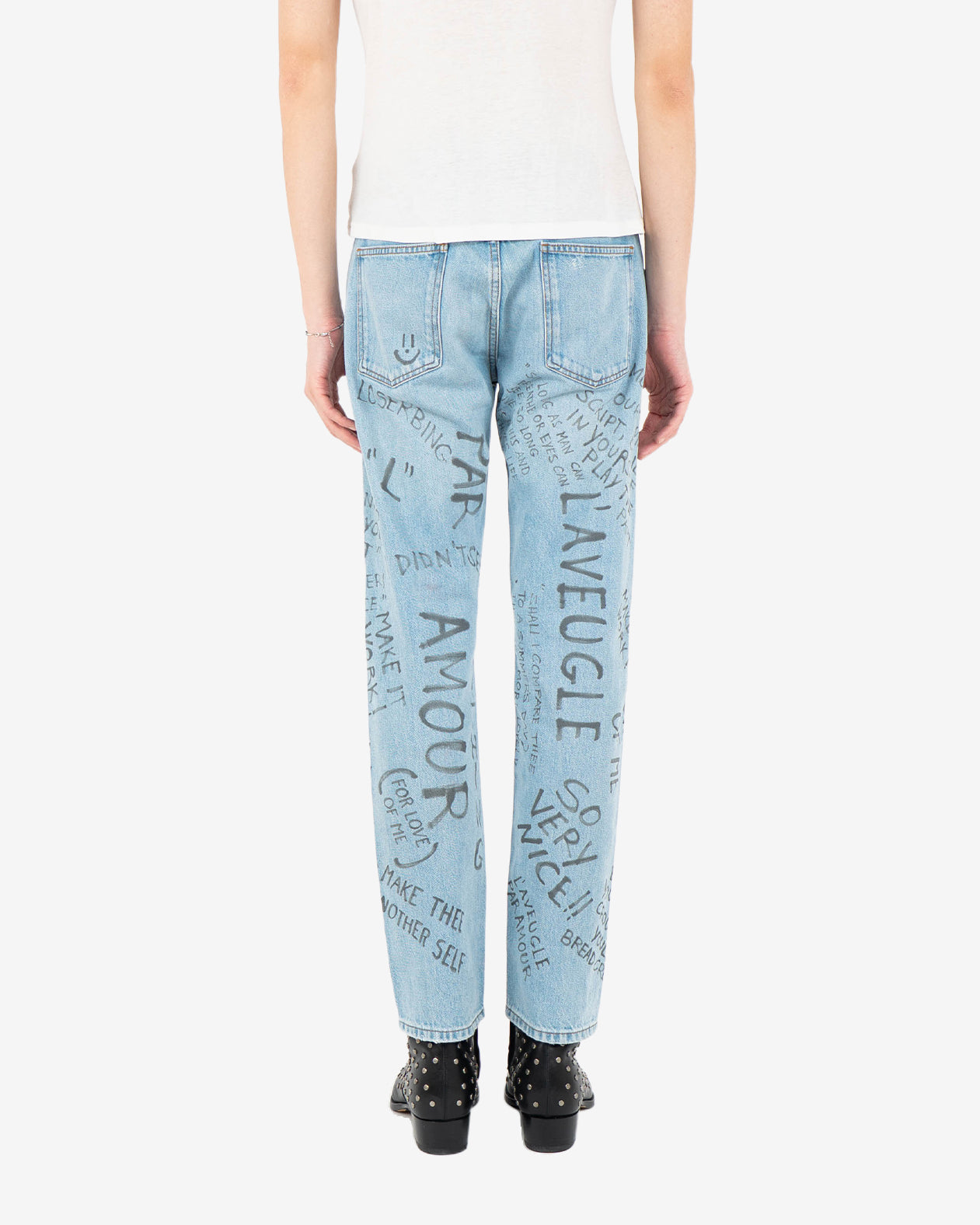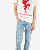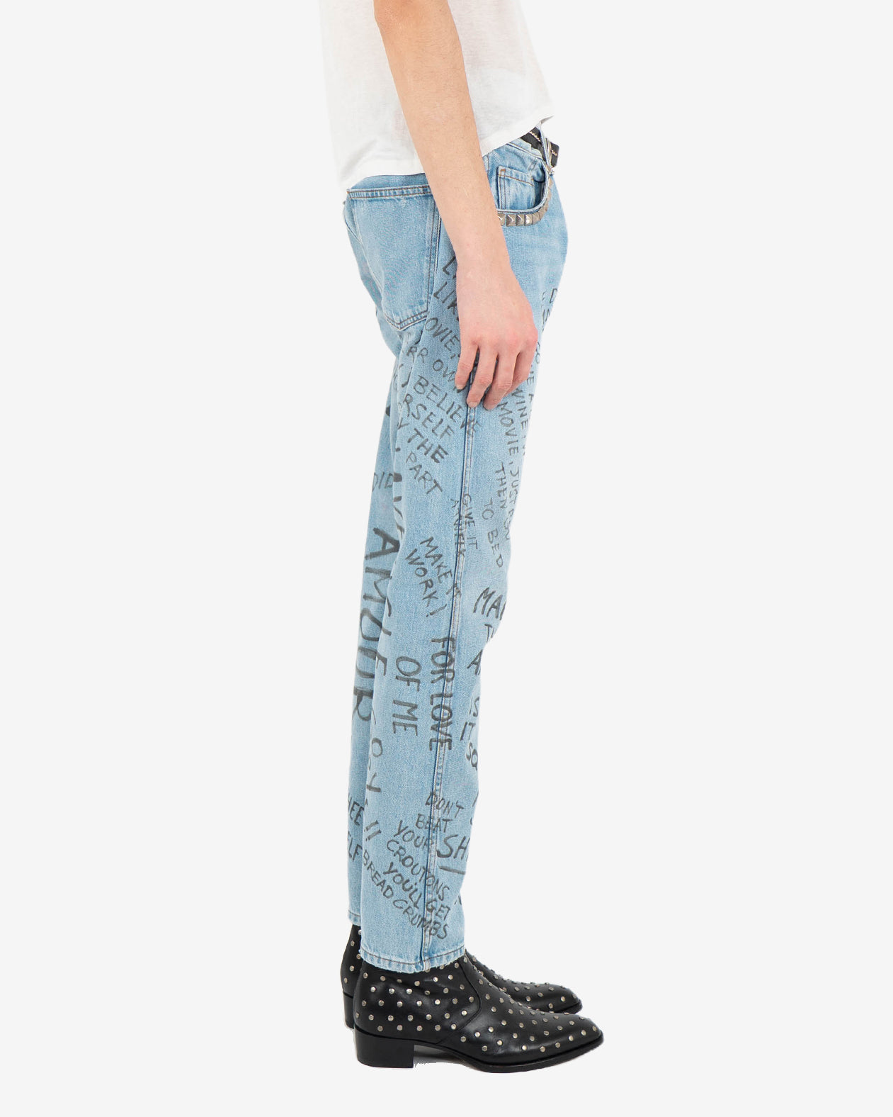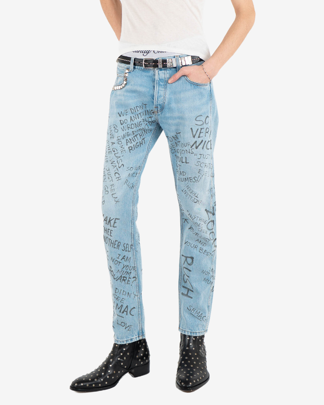 This light-wash straight-leg denim features an all-over handwritten graffiti text and metal stud detailing on the pocket.