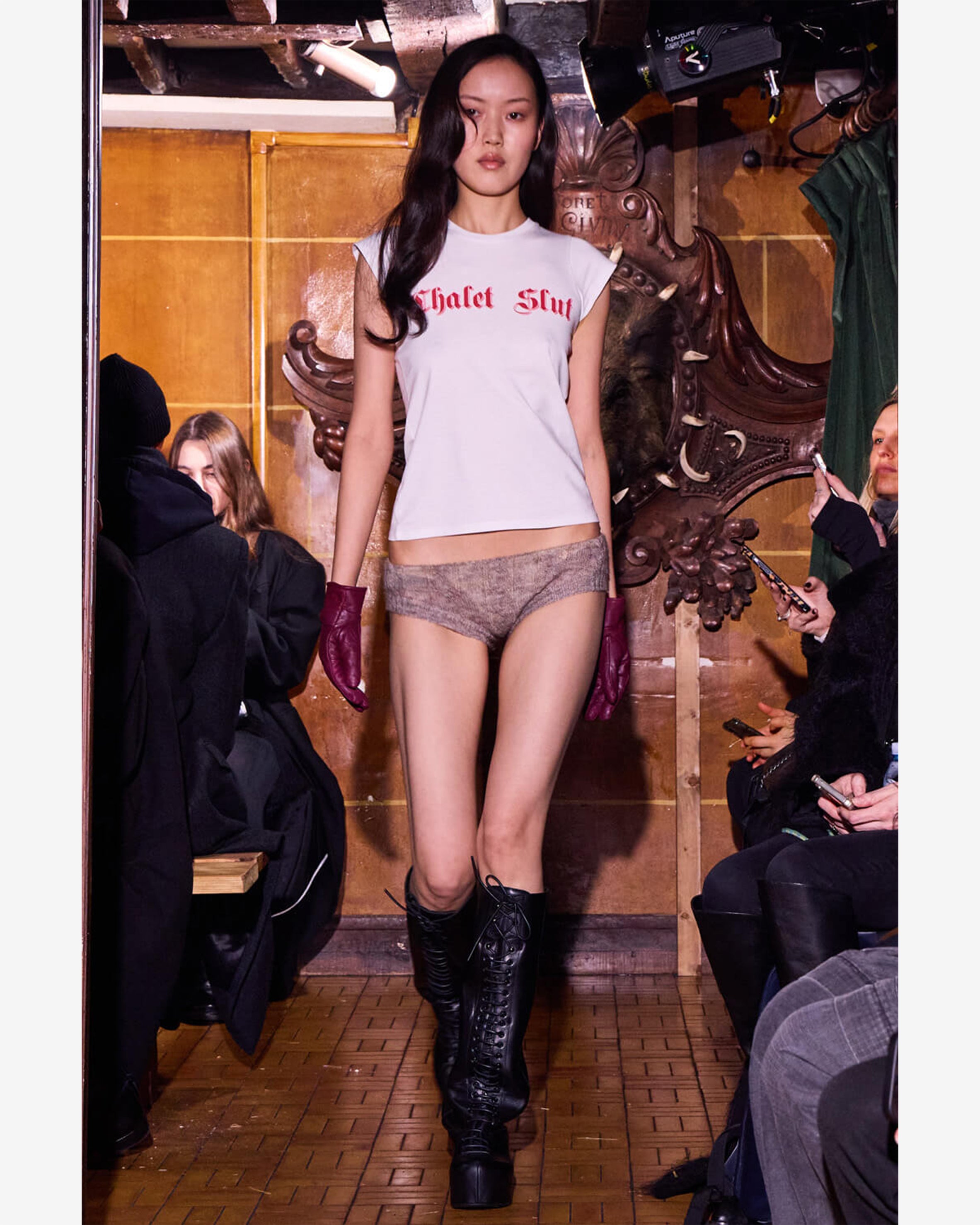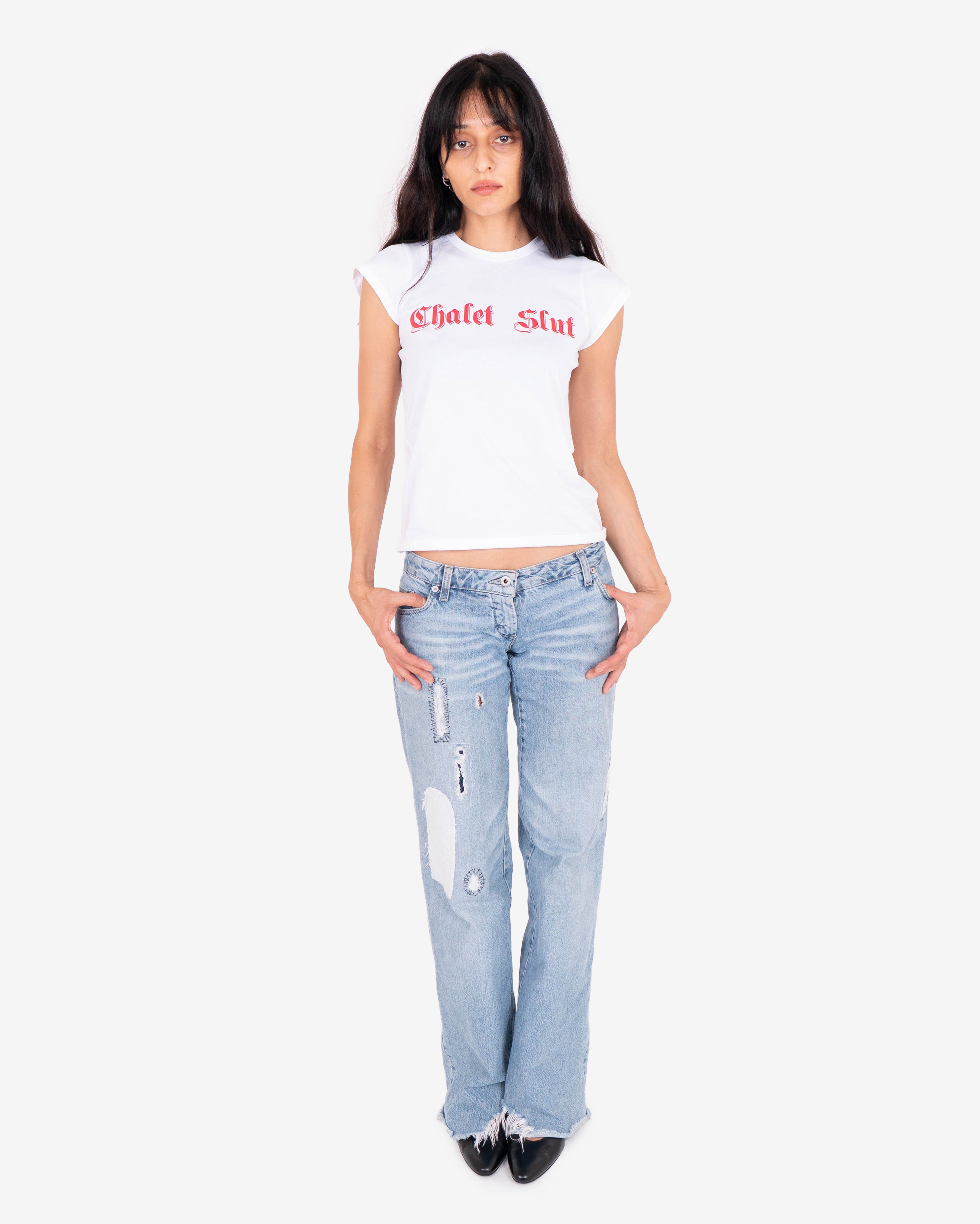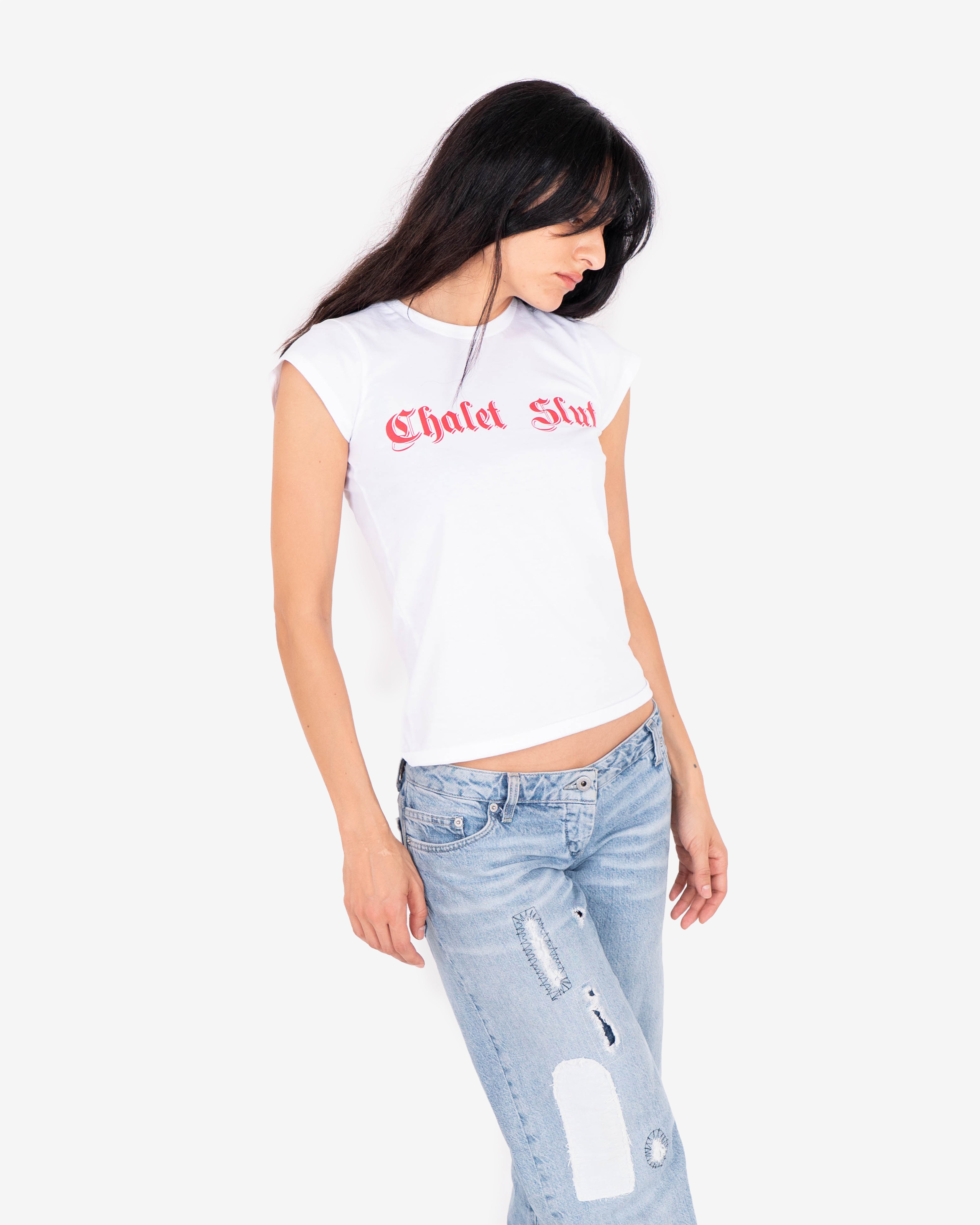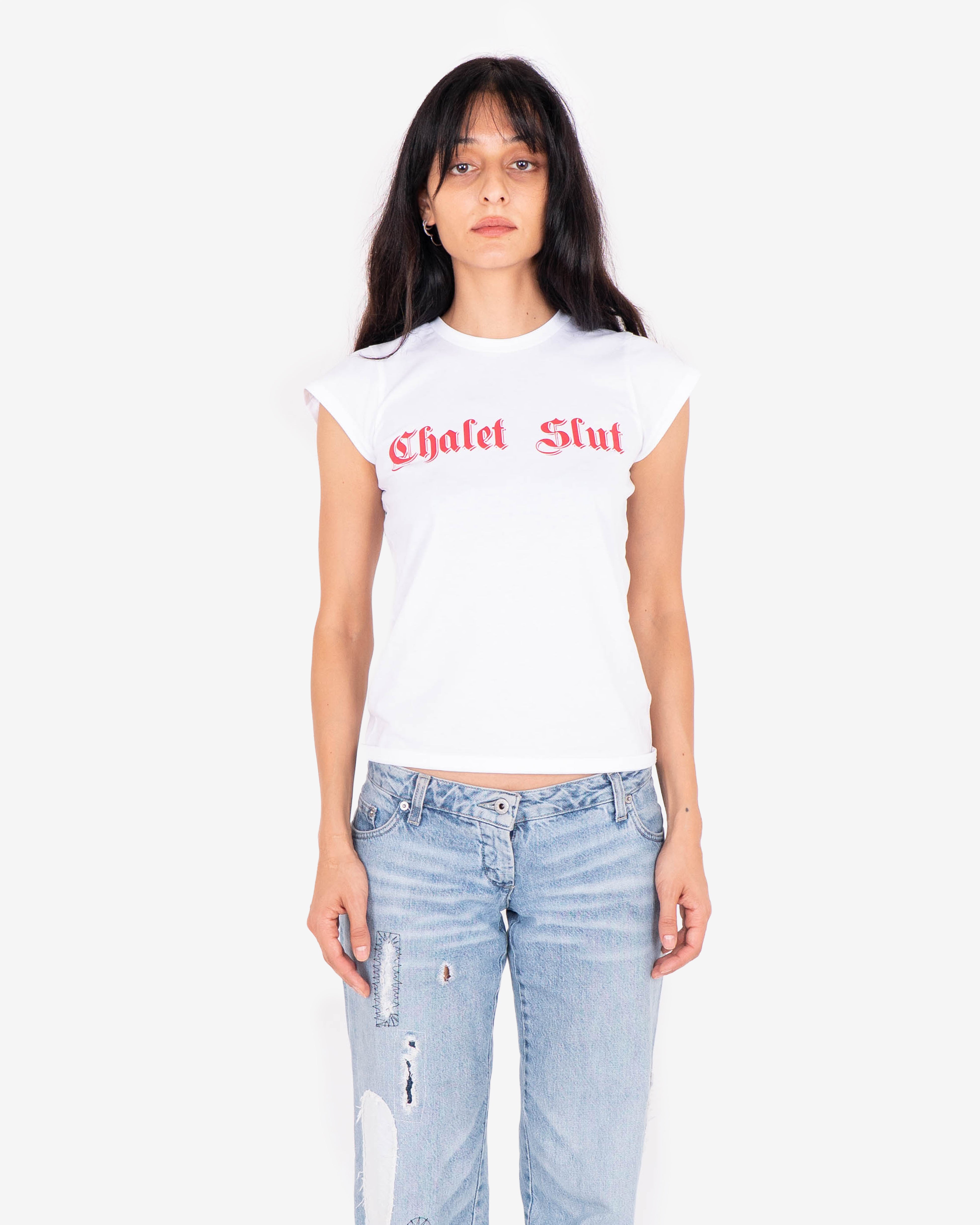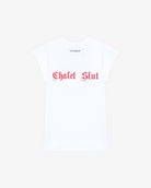 Babydoll t-shirt featuring red gothic style "Chalet Slut" print on chest.