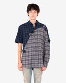 Cool plaid shirt ;) featuring contrast asymmetrical sleeves and dual plaid fabric. Button down closure.