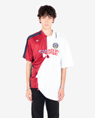 Asymmetrical collage draped football top featuring eye-catching paneled mesh construction, press-stud placket, logo patch and flocked chest logo, gathering and tied bow details at front and back and printed logo on back.