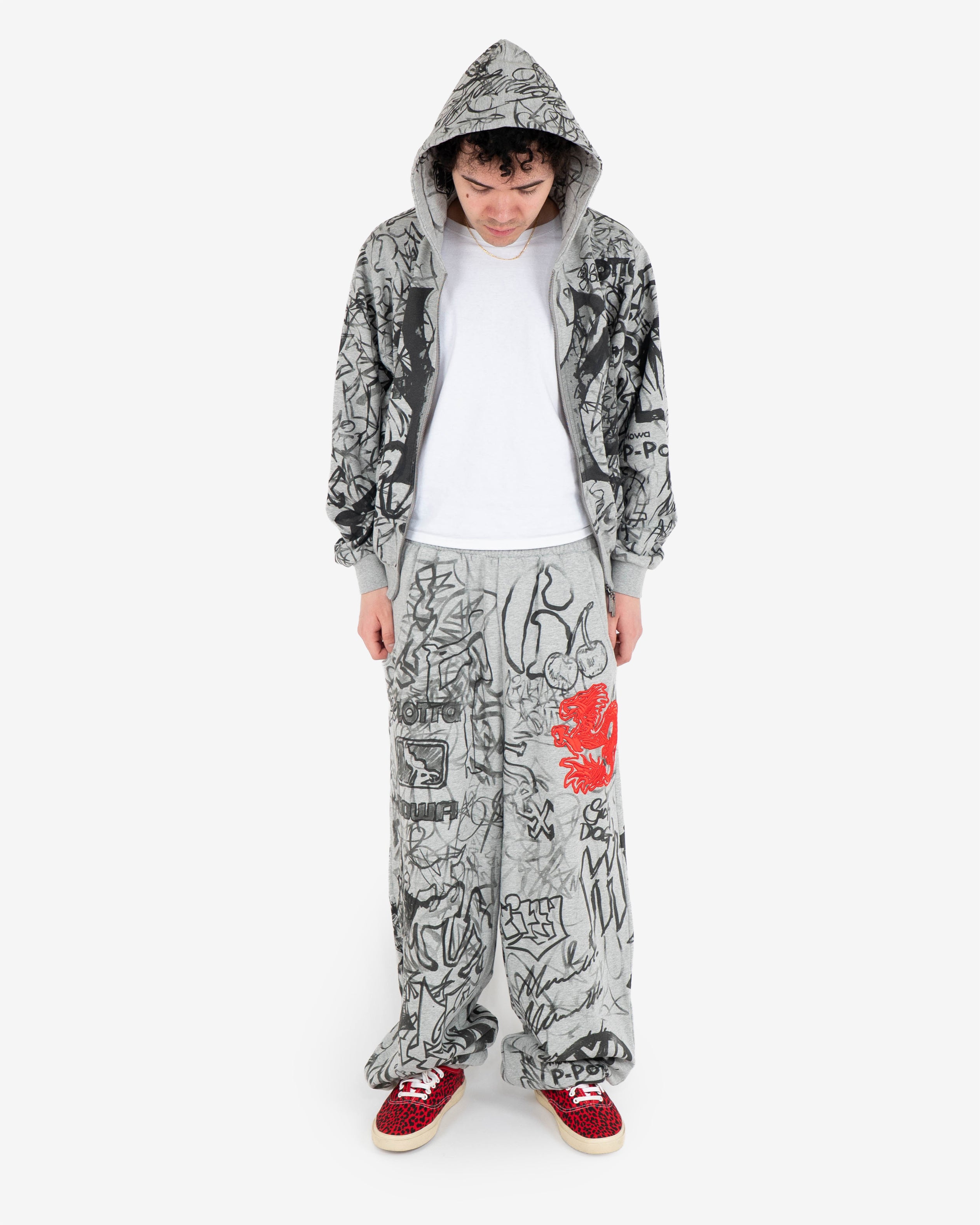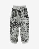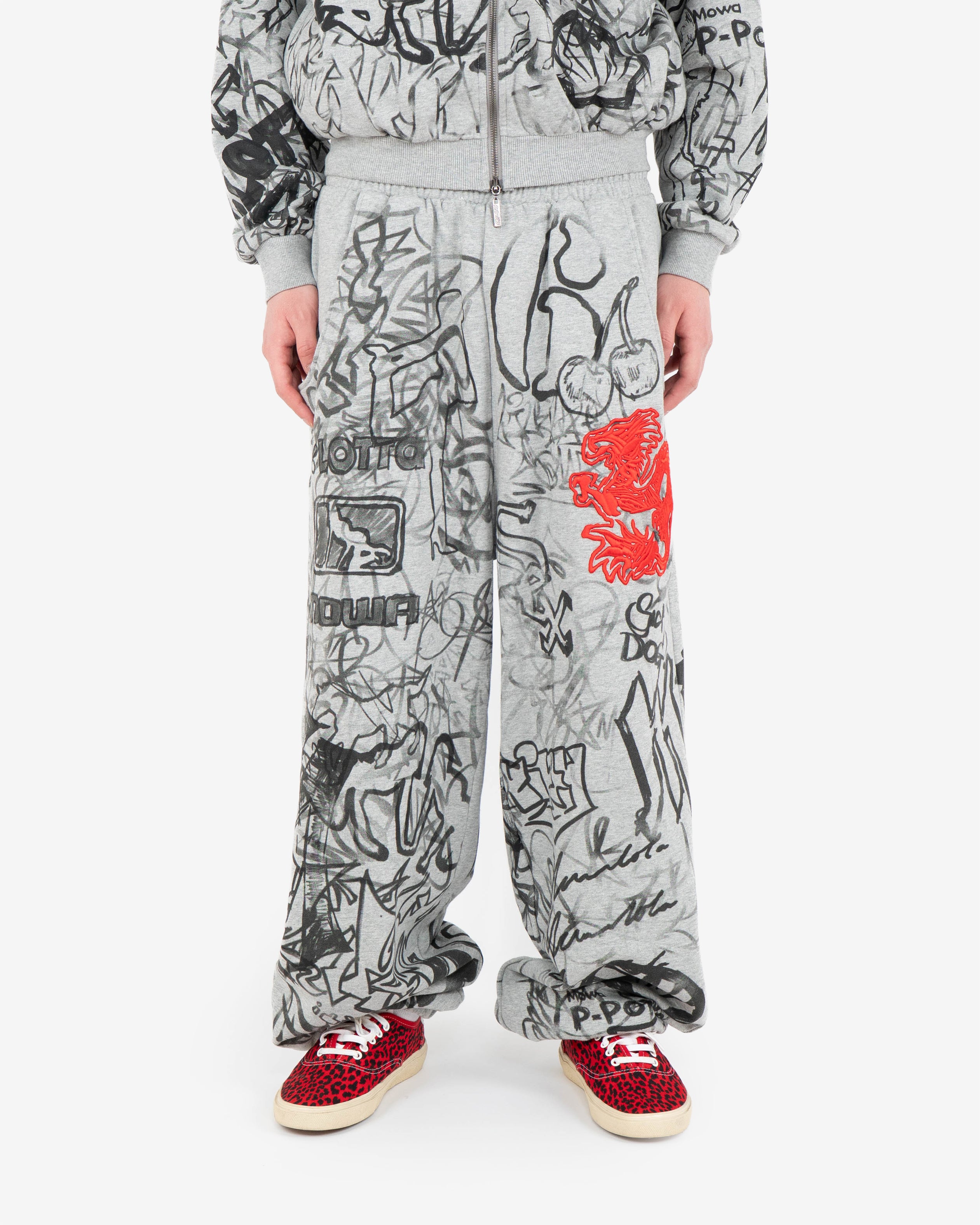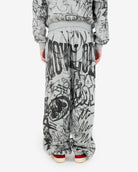Joggers featuring all-over black graffiti-style print accented by a bold, red embroidered graphic on the left leg and mowalola logo print on back.
