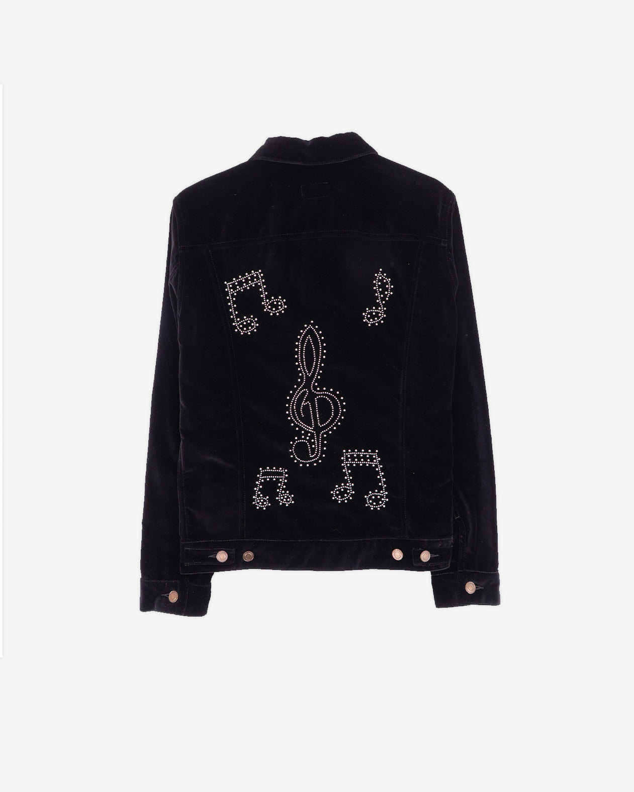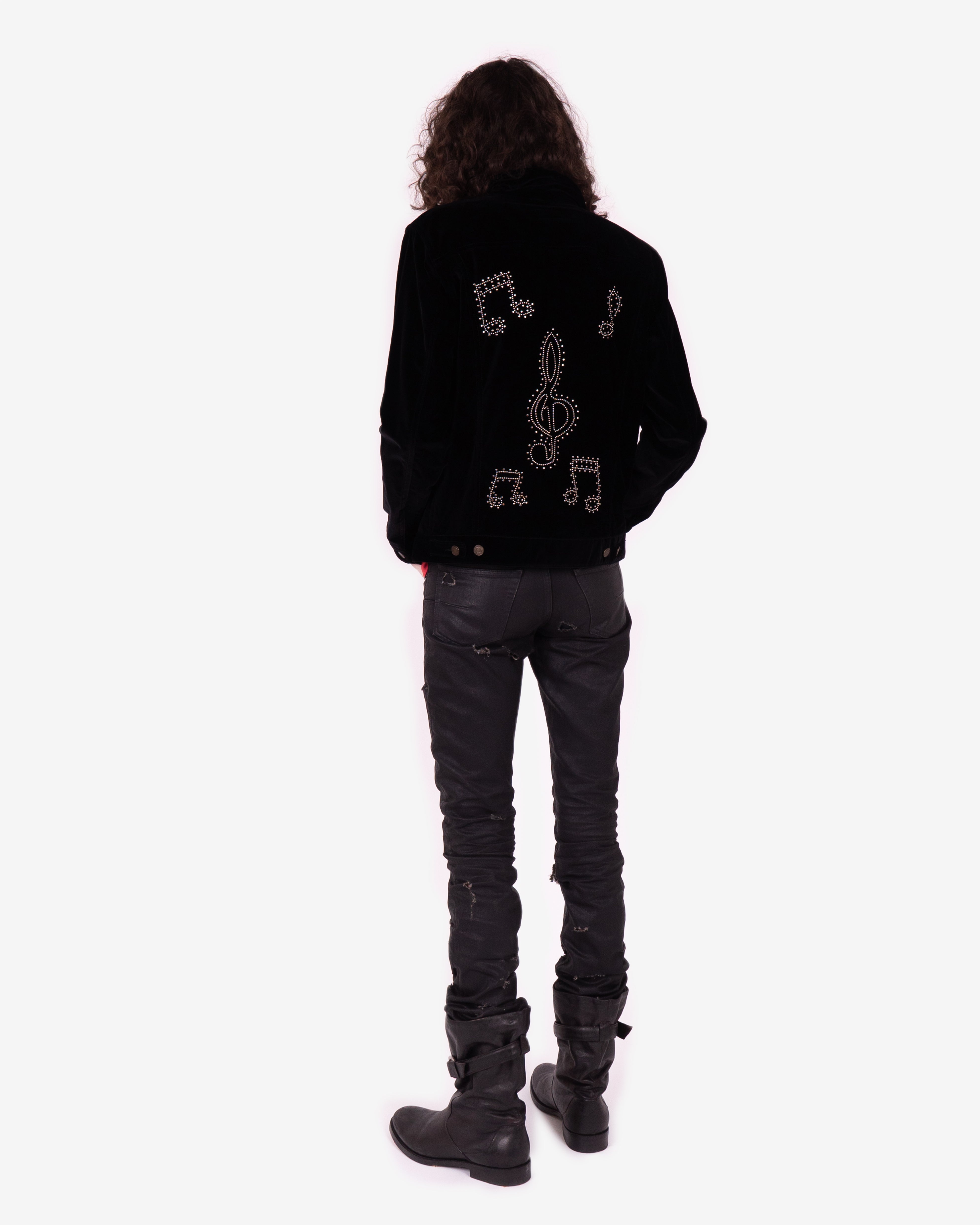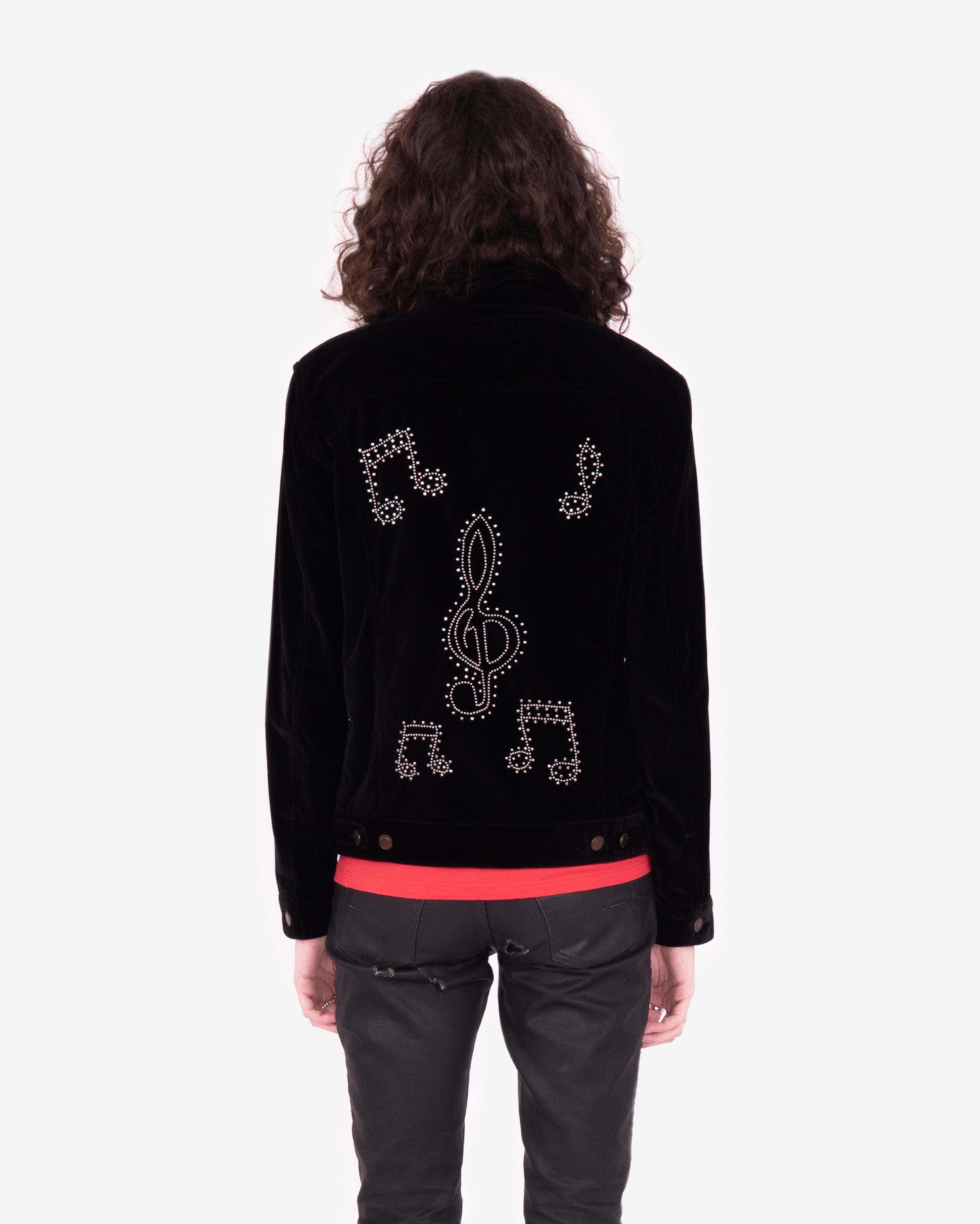 Trucker jacket in black velvet, featuring a buttoned closure and music note studs pattern all throughout the back.