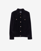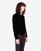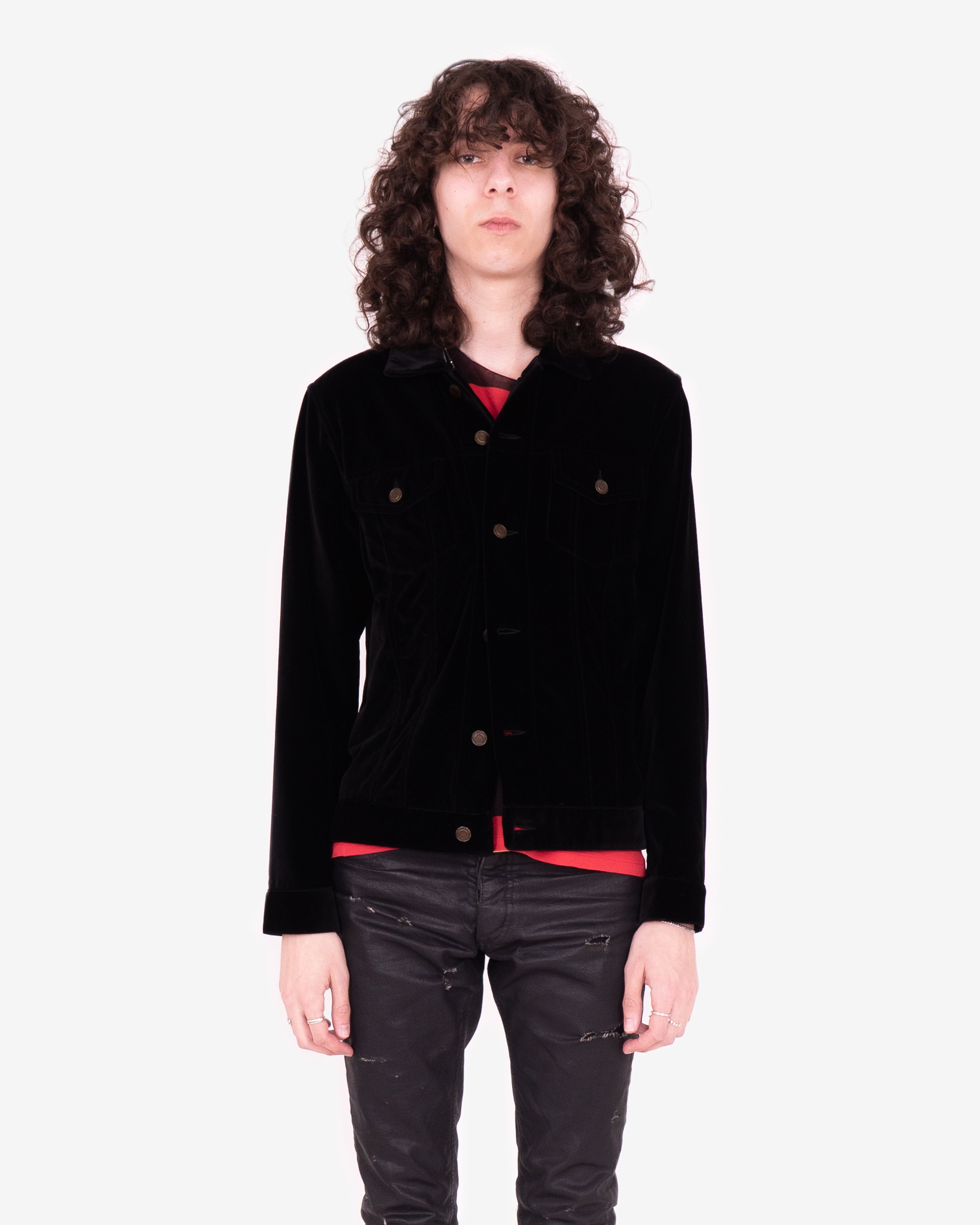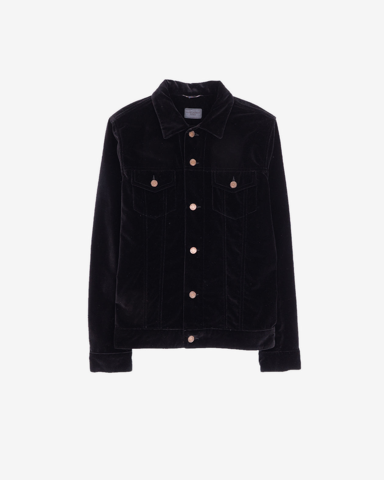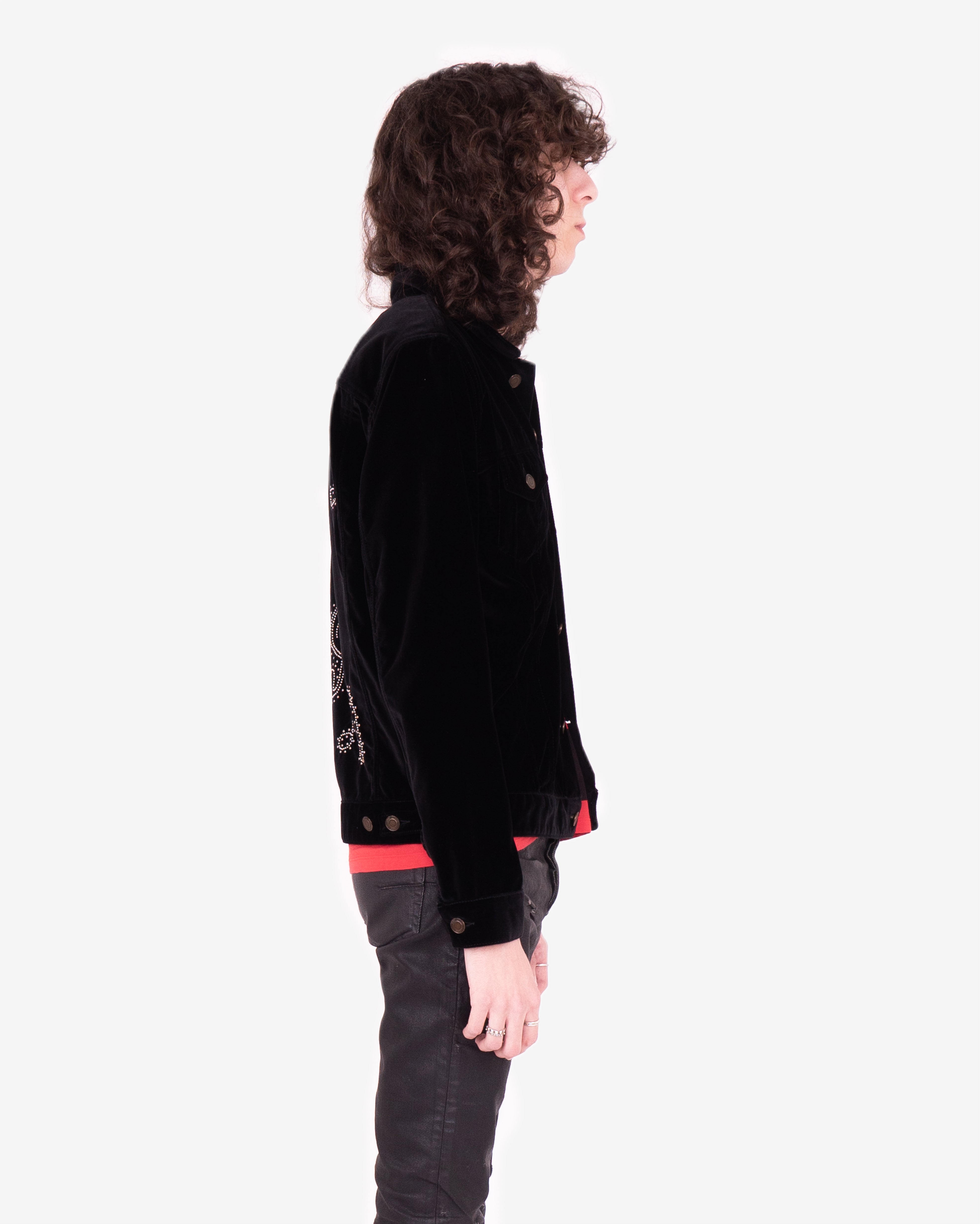 Trucker jacket in black velvet, featuring a buttoned closure and music note studs pattern all throughout the back.