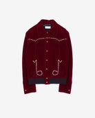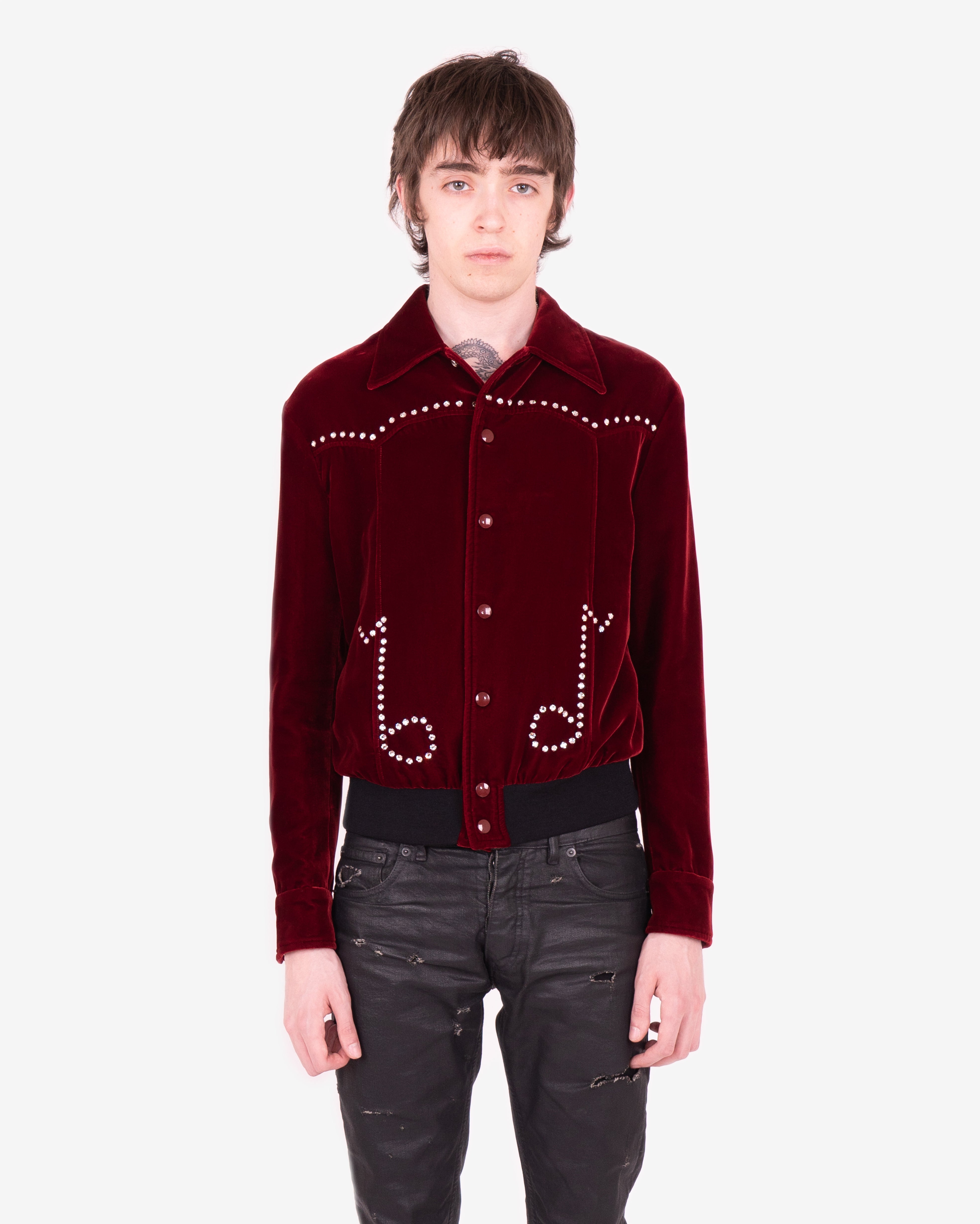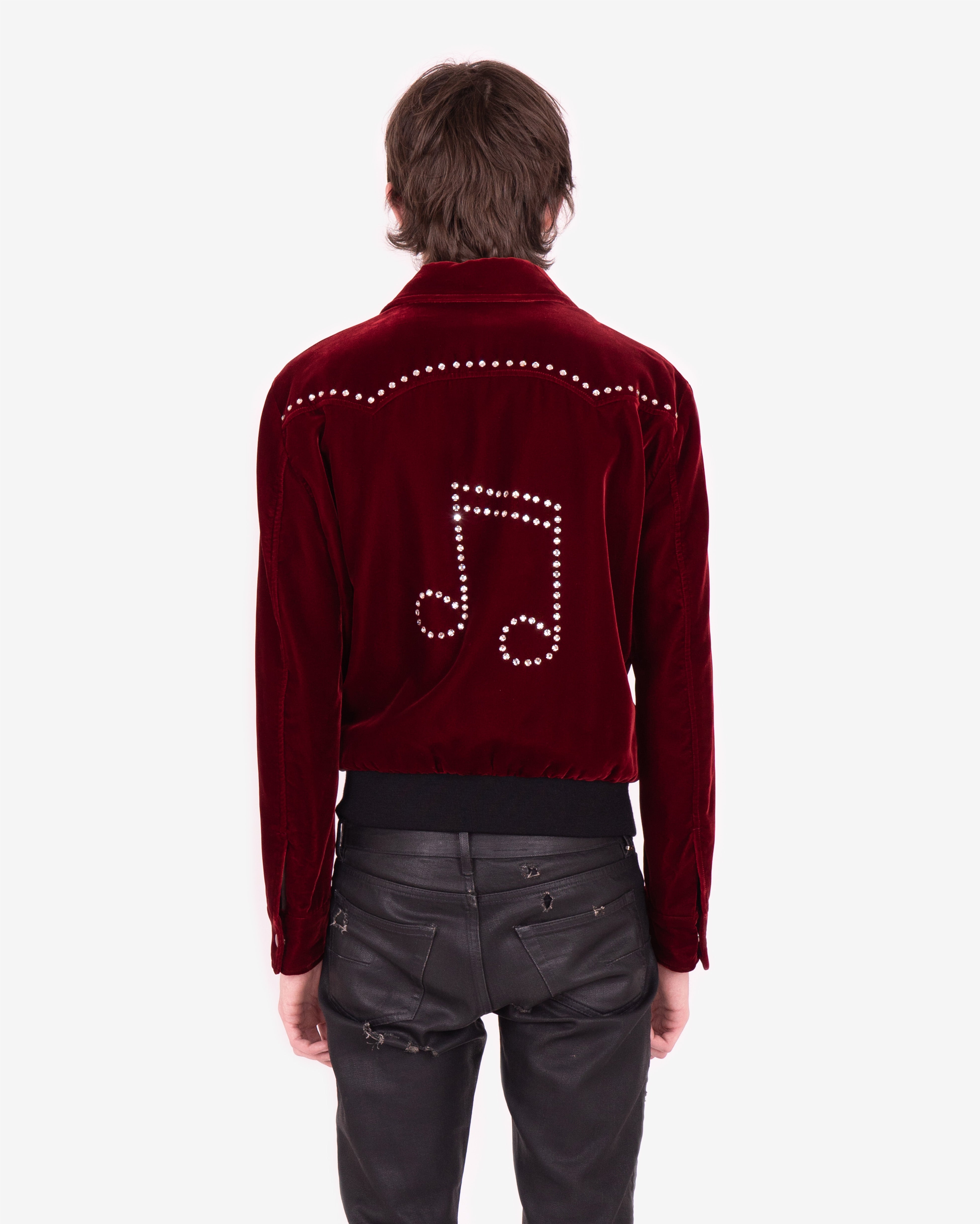 Rare musical note rhinestone accent jacket with button down contrast closure and black ribbed waistbband.