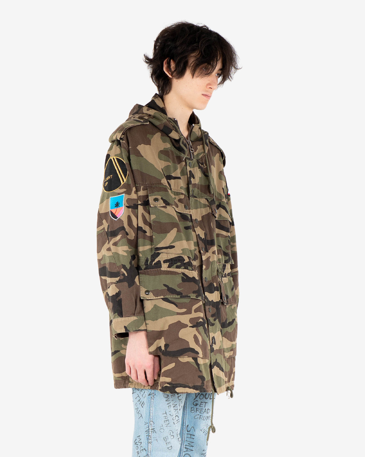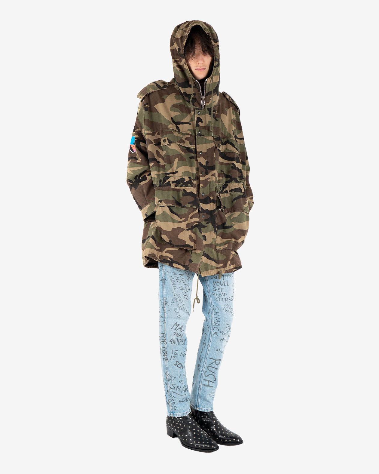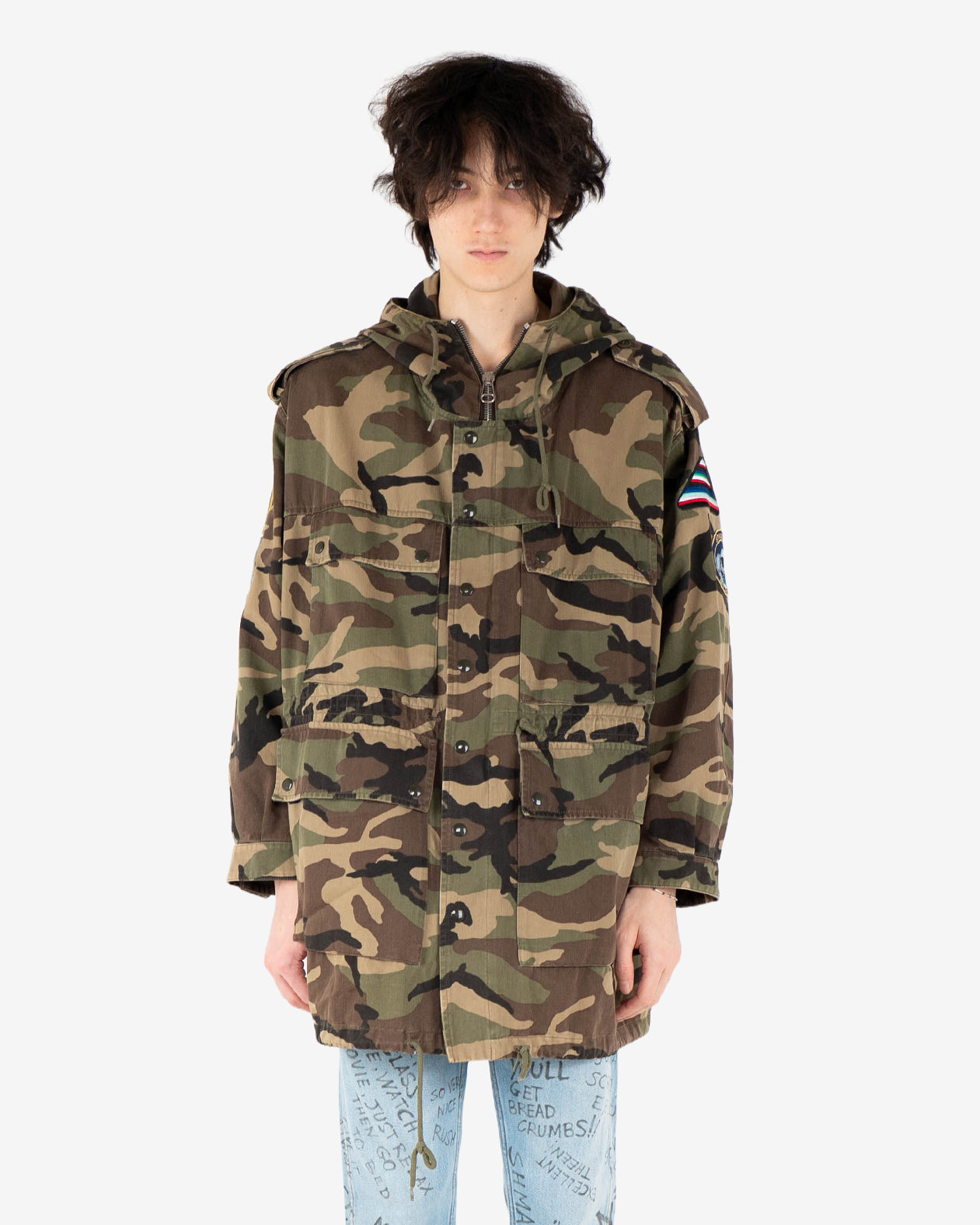 Oversized patch parka in khaki and black camouflage printed cotton gabardine.