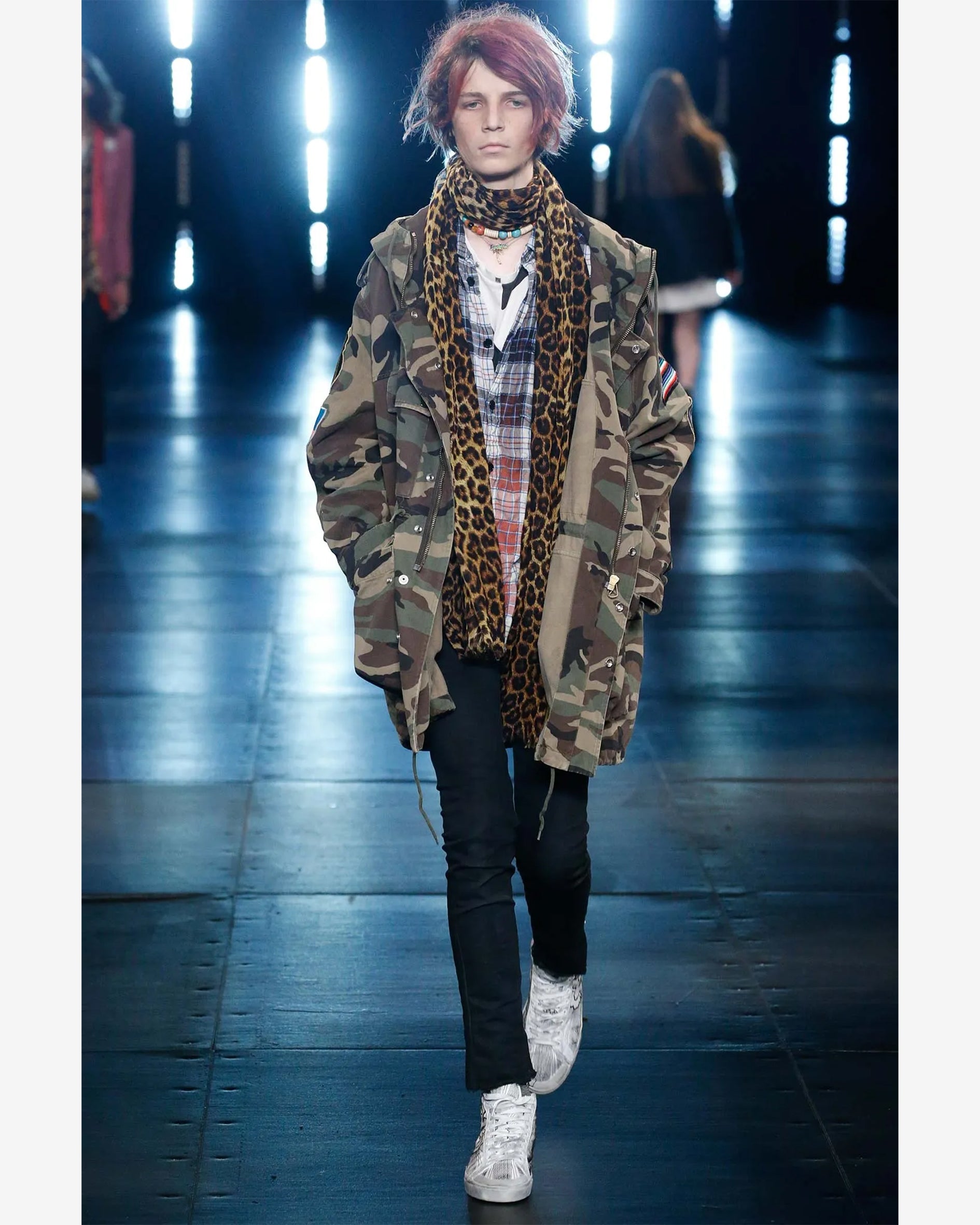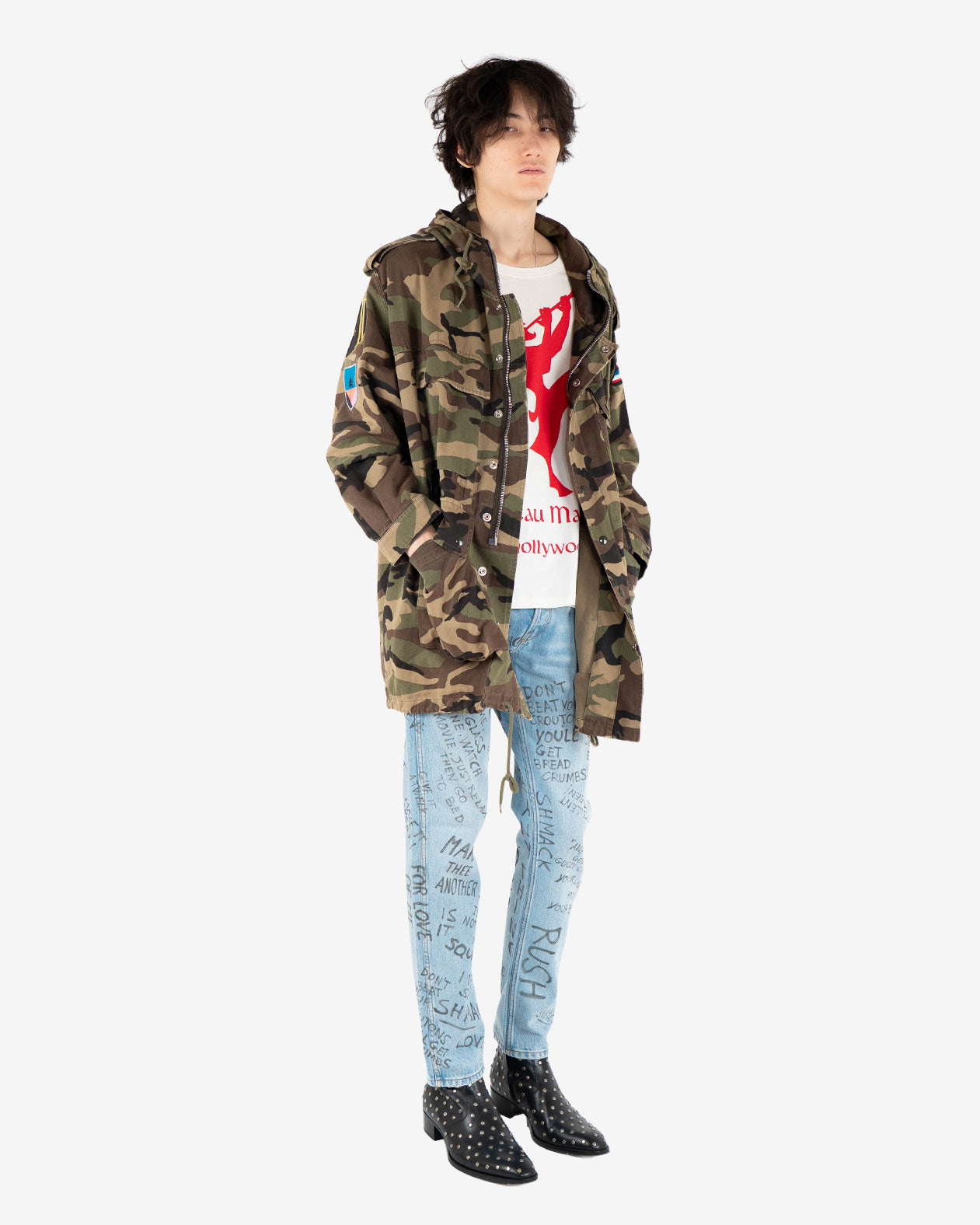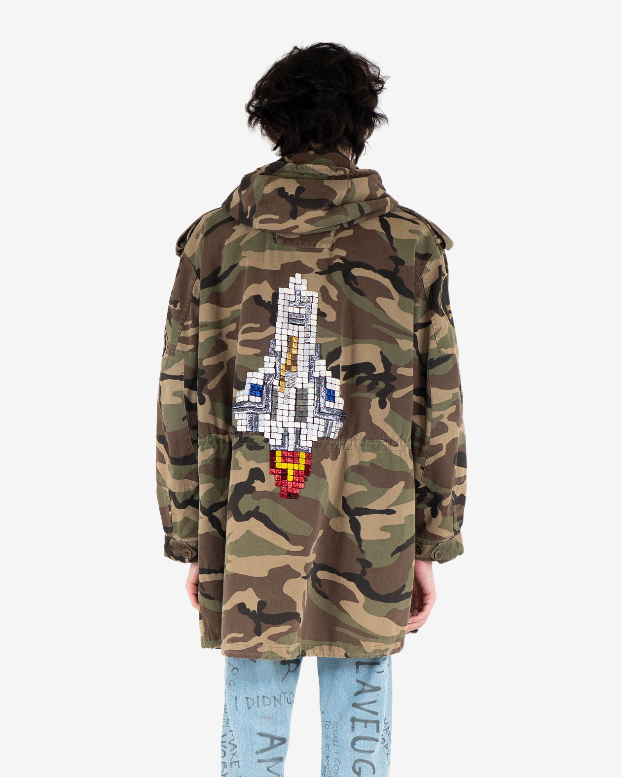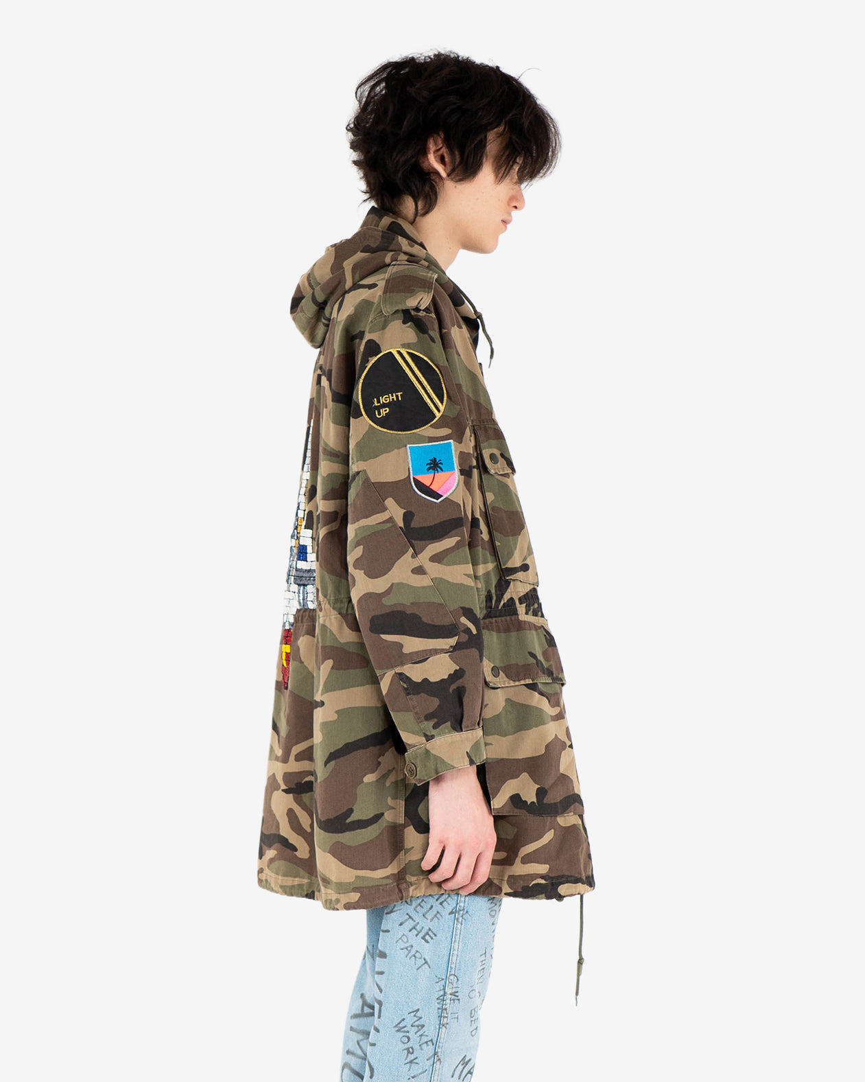 Oversized patch parka in khaki and black camouflage printed cotton gabardine.