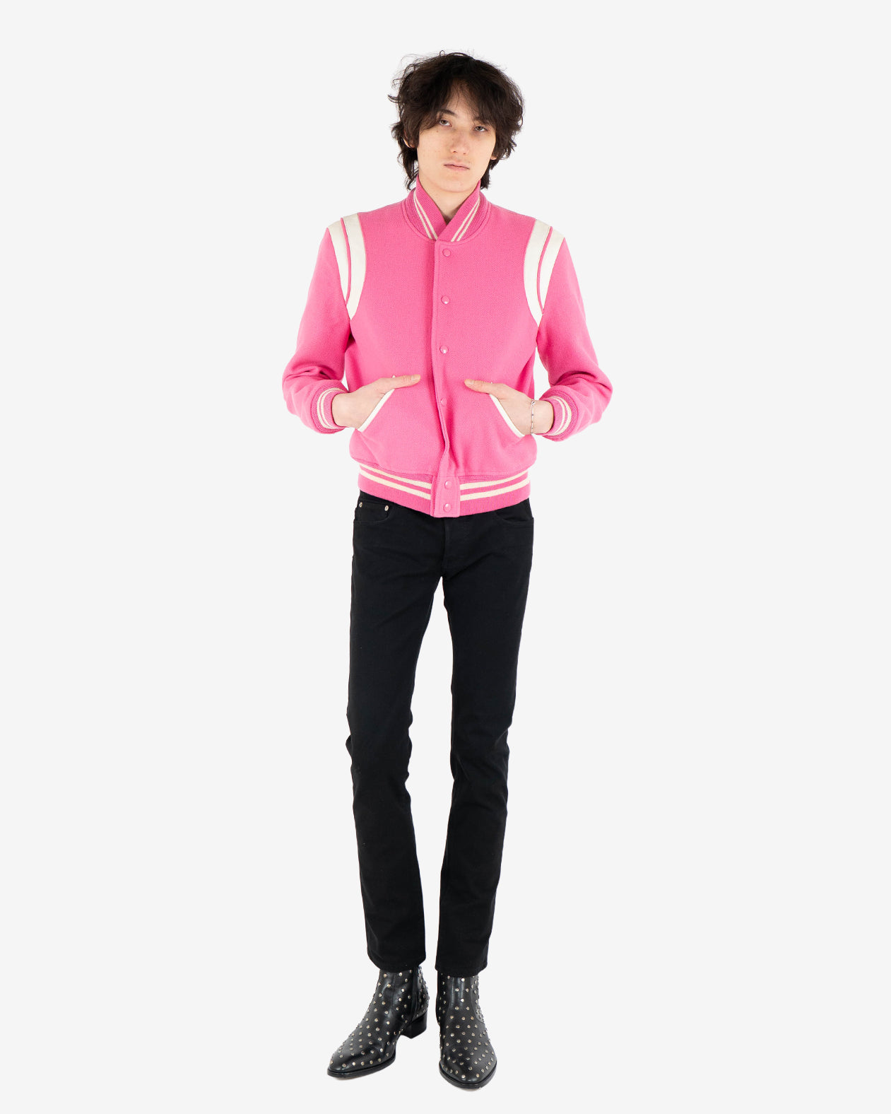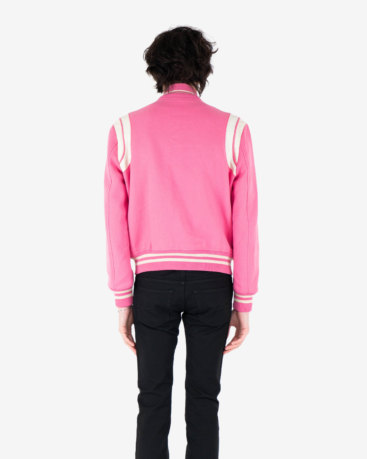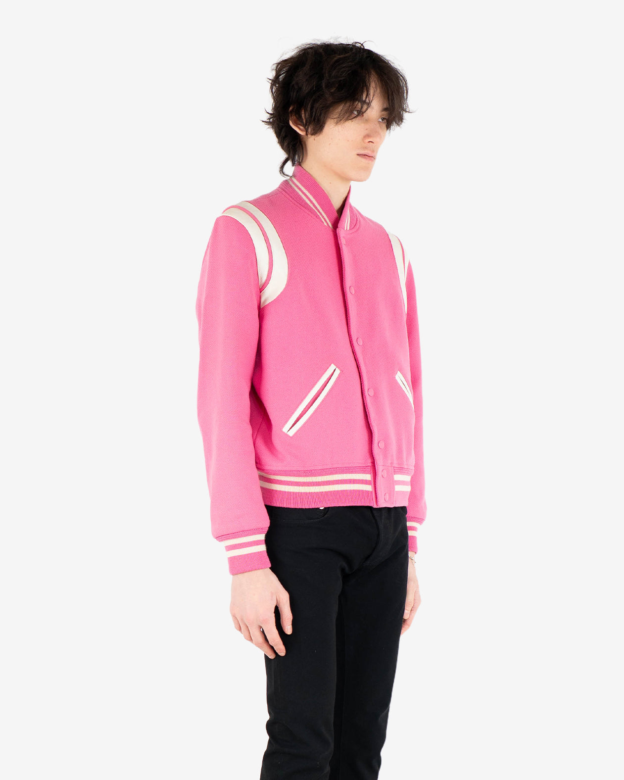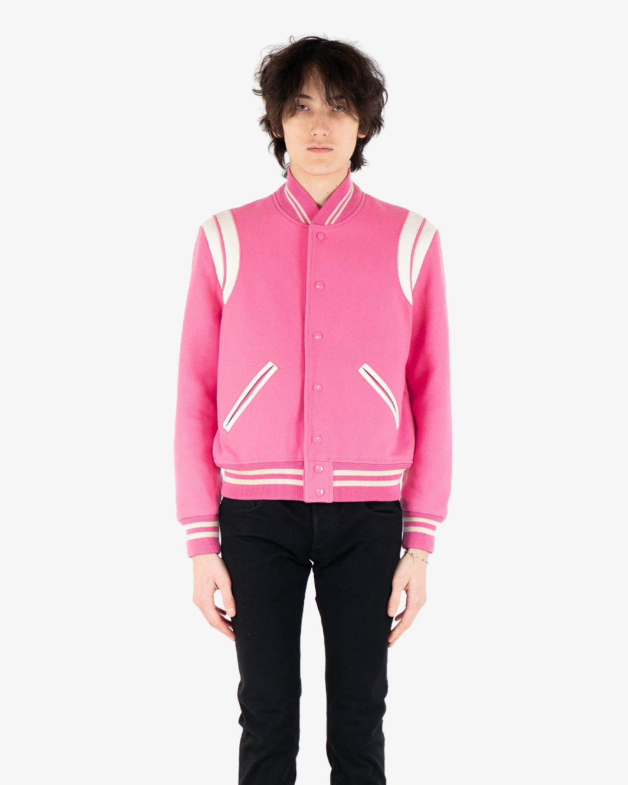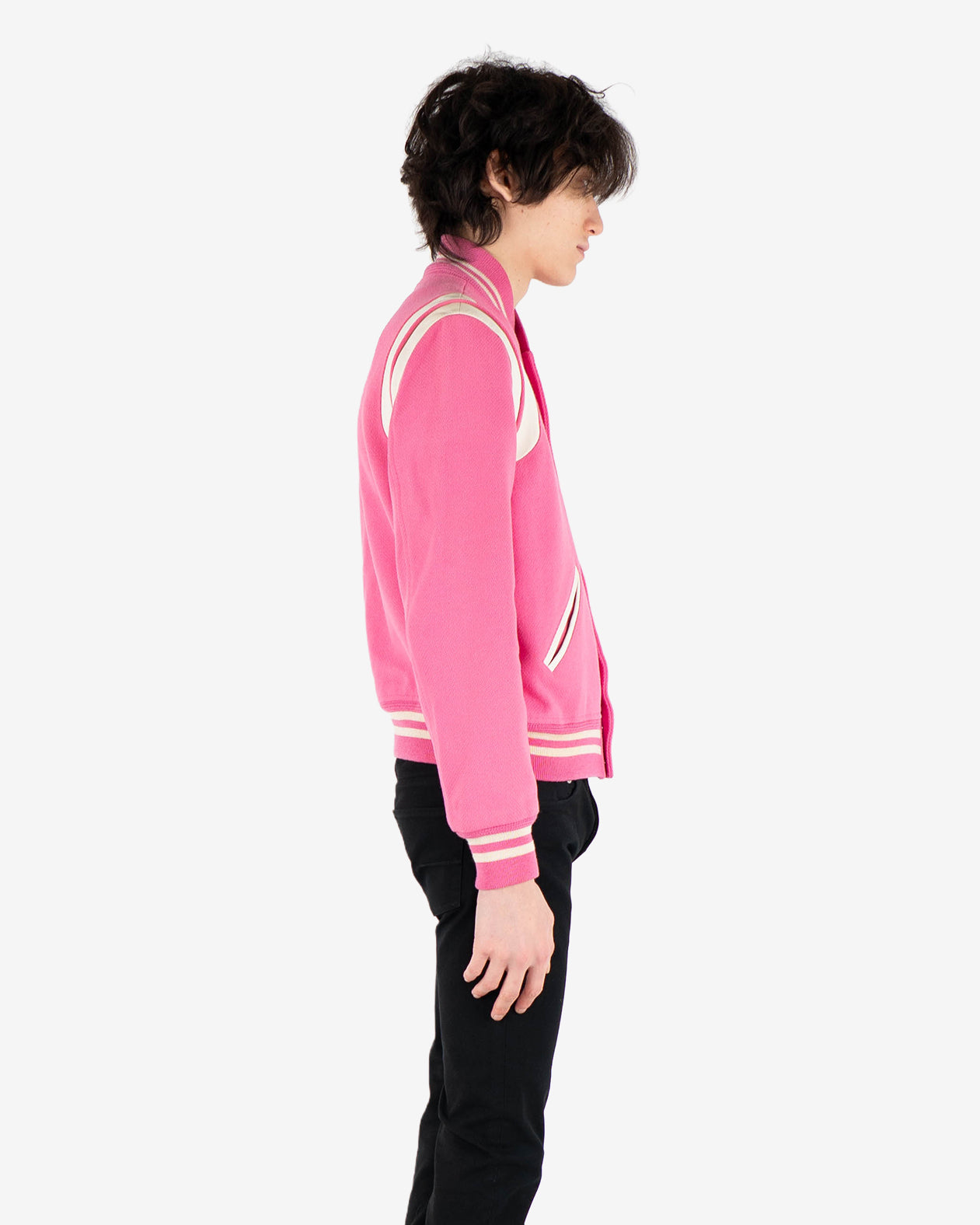 Unique colorway of the iconic teddy jacket features signature leather shoulder panels and leather trim on the pockets; button down front clasp closure, and contrast collar, cuffs and waist.