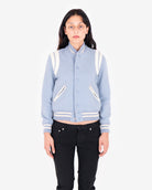 Unique colorway of the iconic teddy jacket features signature leather shoulder panels and leather trim on the pockets; button down front clasp closure, and contrast collar, cuffs and waist. Women's sizing.