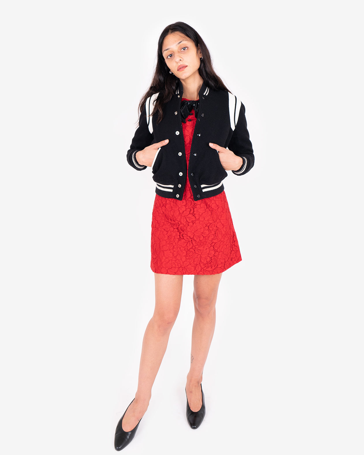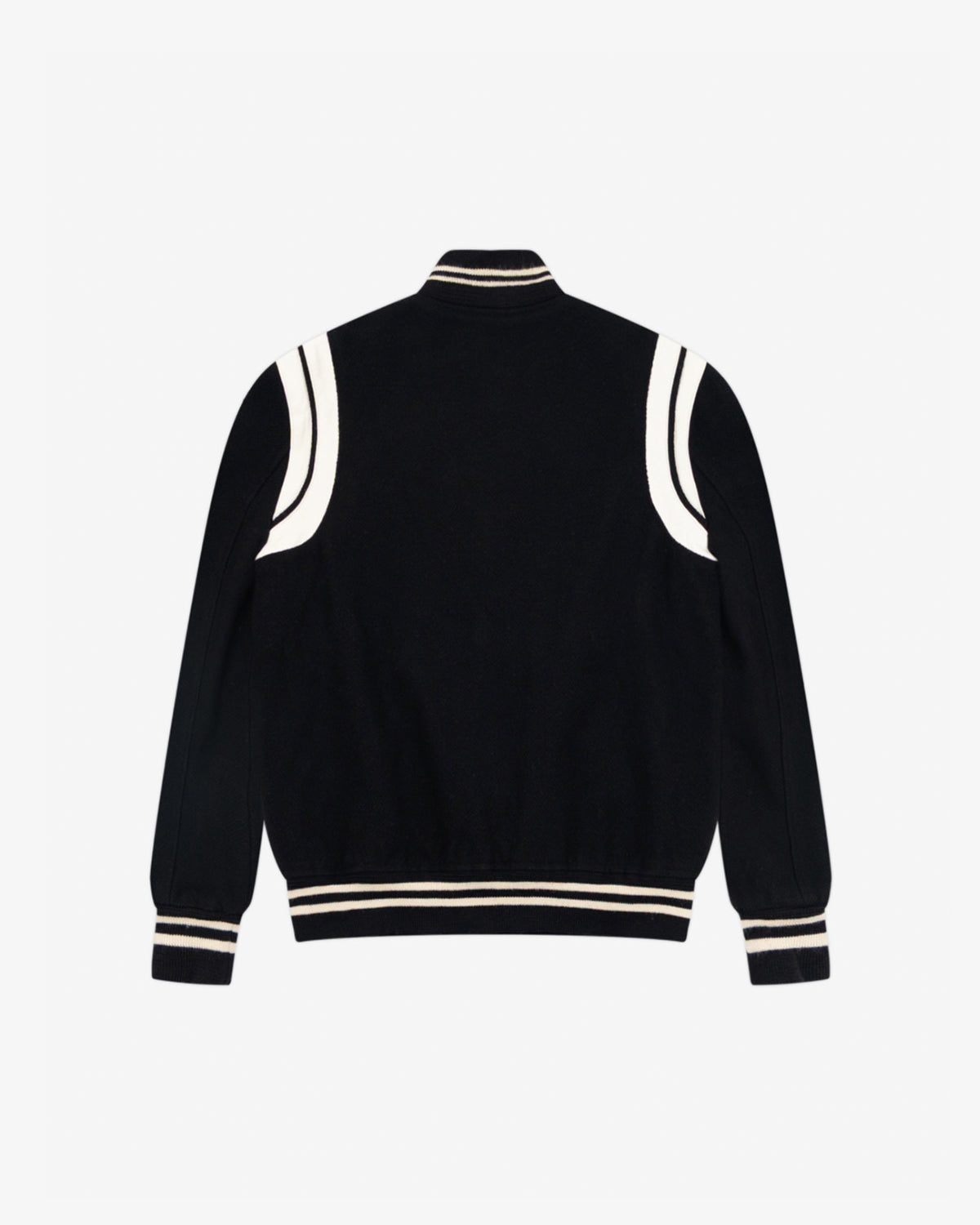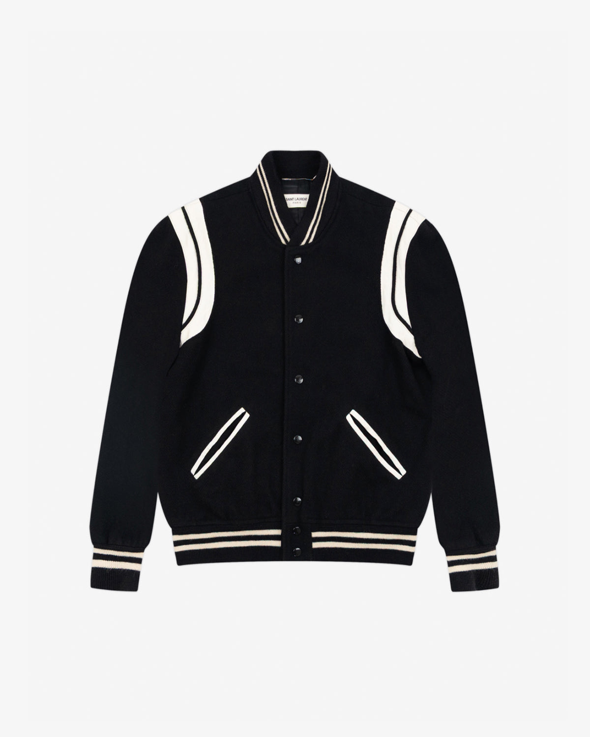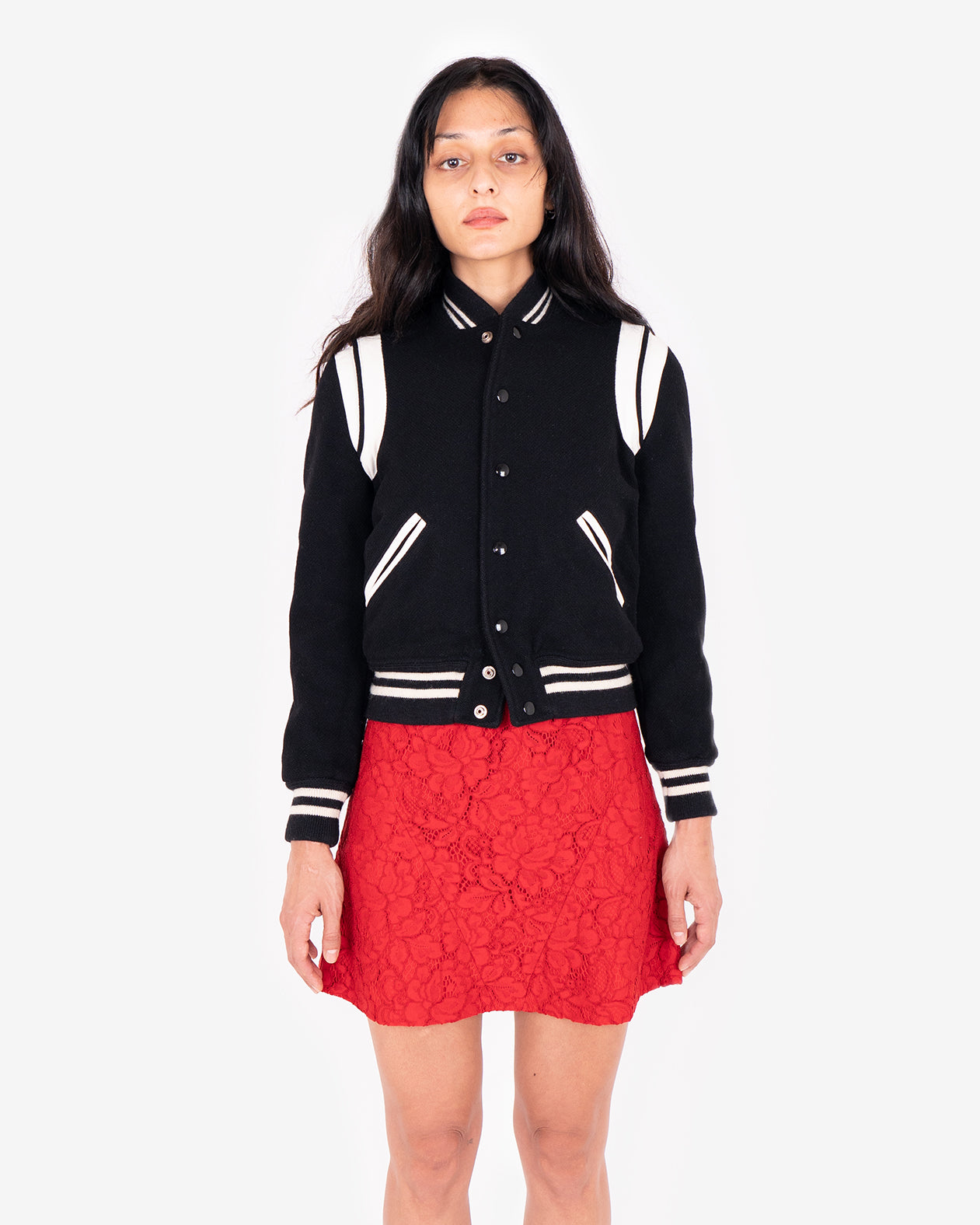 This classic colorway of the teddy jacket features signature leather shoulder panels and leather trim on the pockets; button down front clasp closure, and contrast collar, cuffs and waist. Women's sizing.