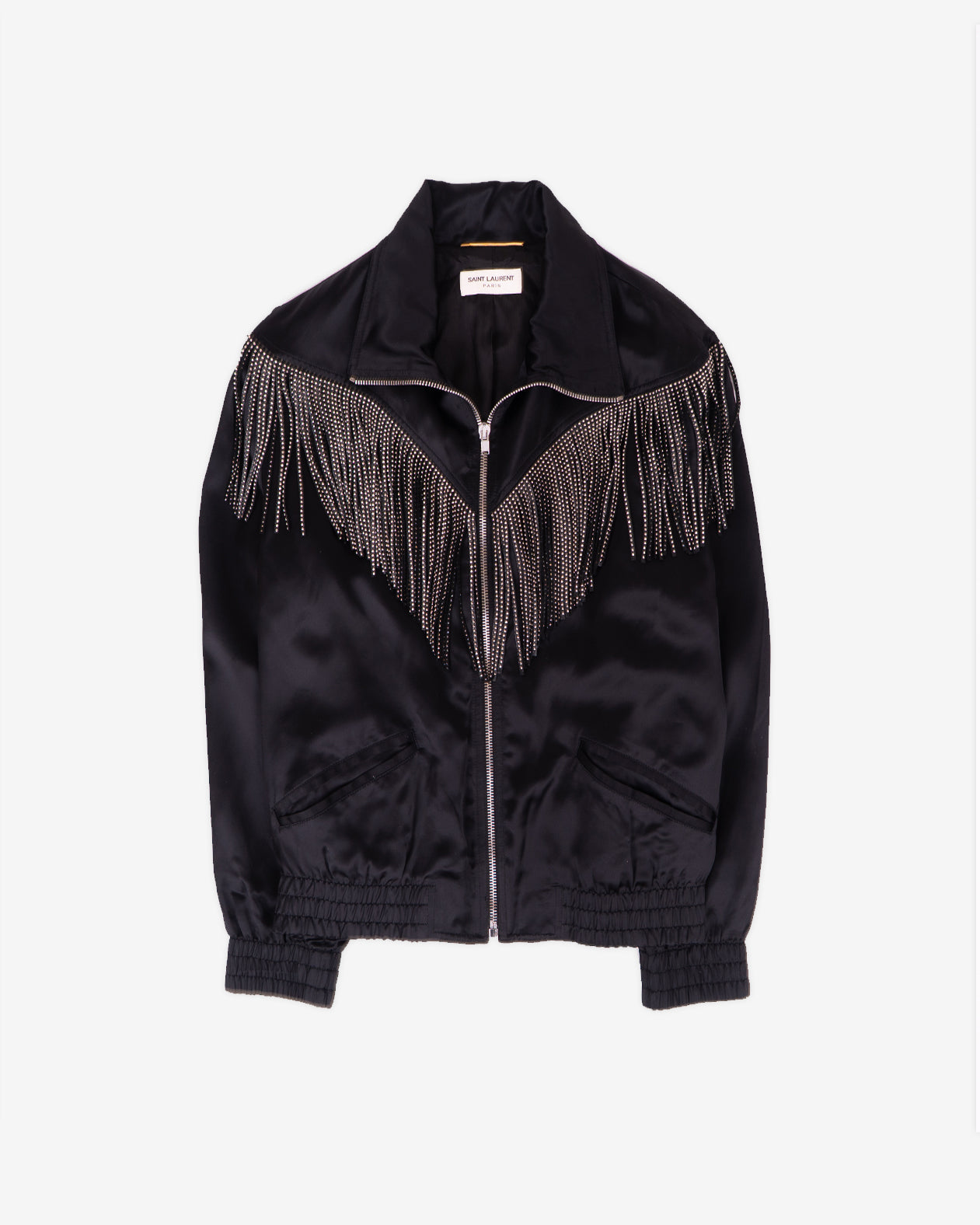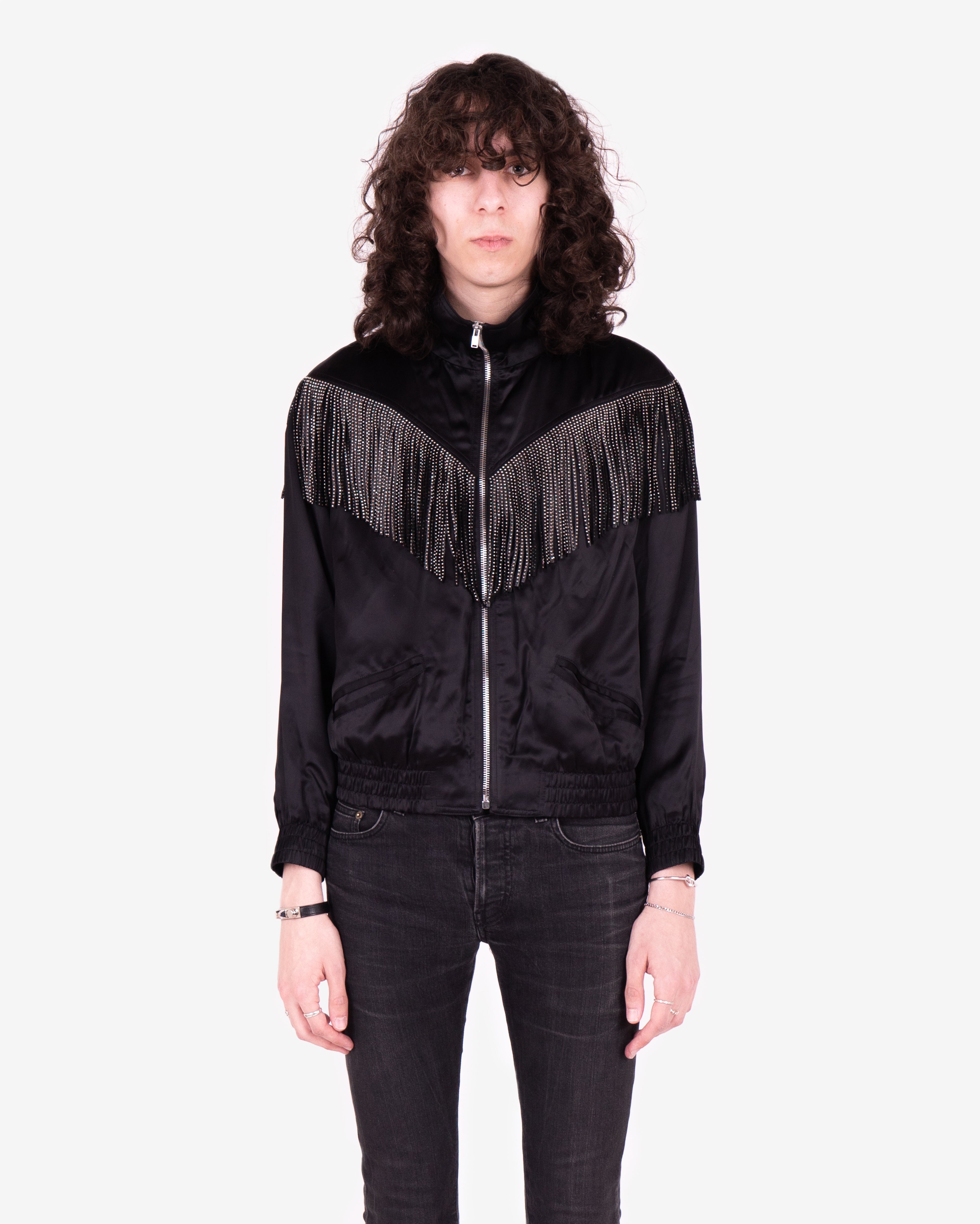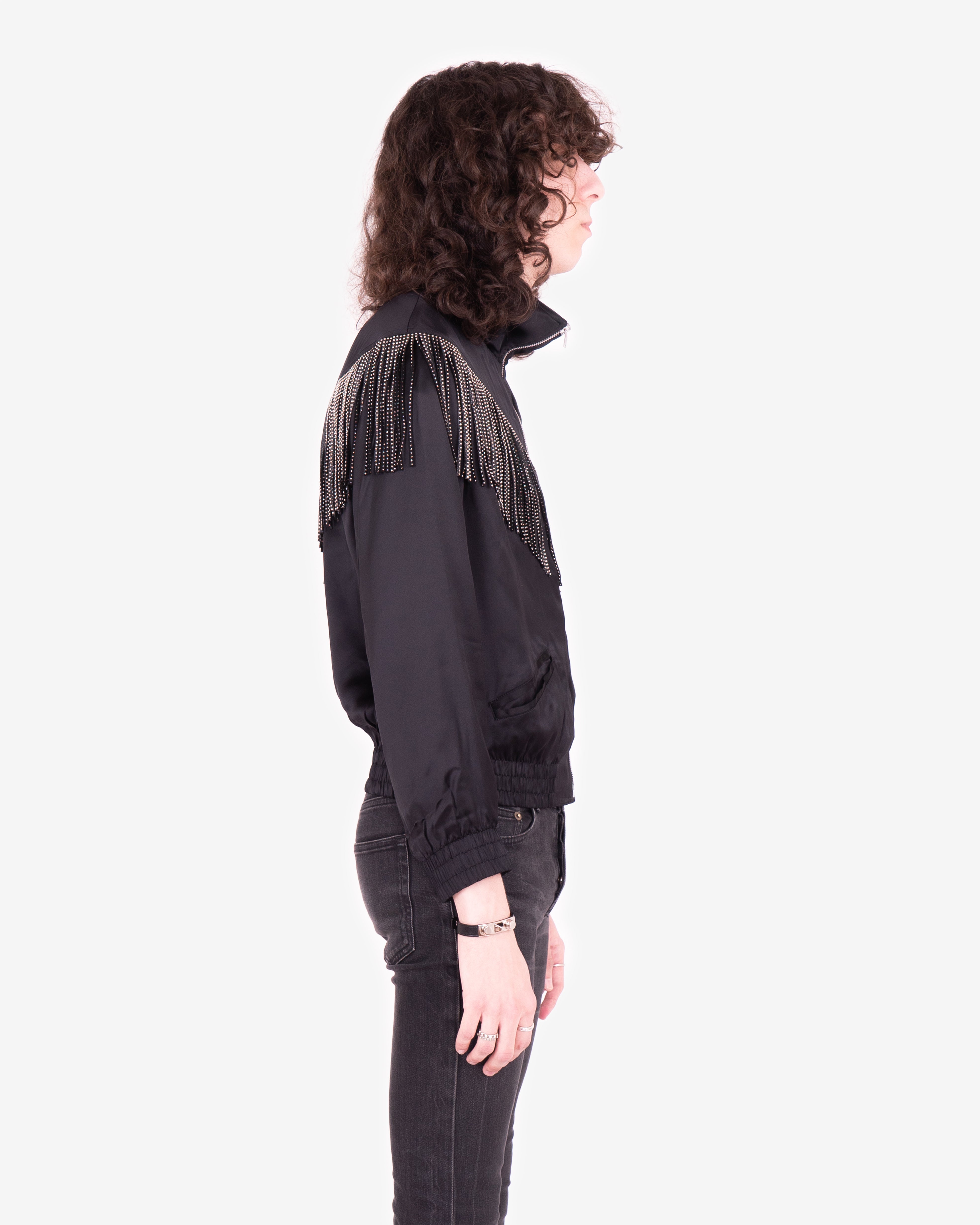 Bomber style jacket, as seen on runway, with long silver metallic fringe trim in V-line across front chest and back.