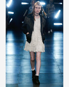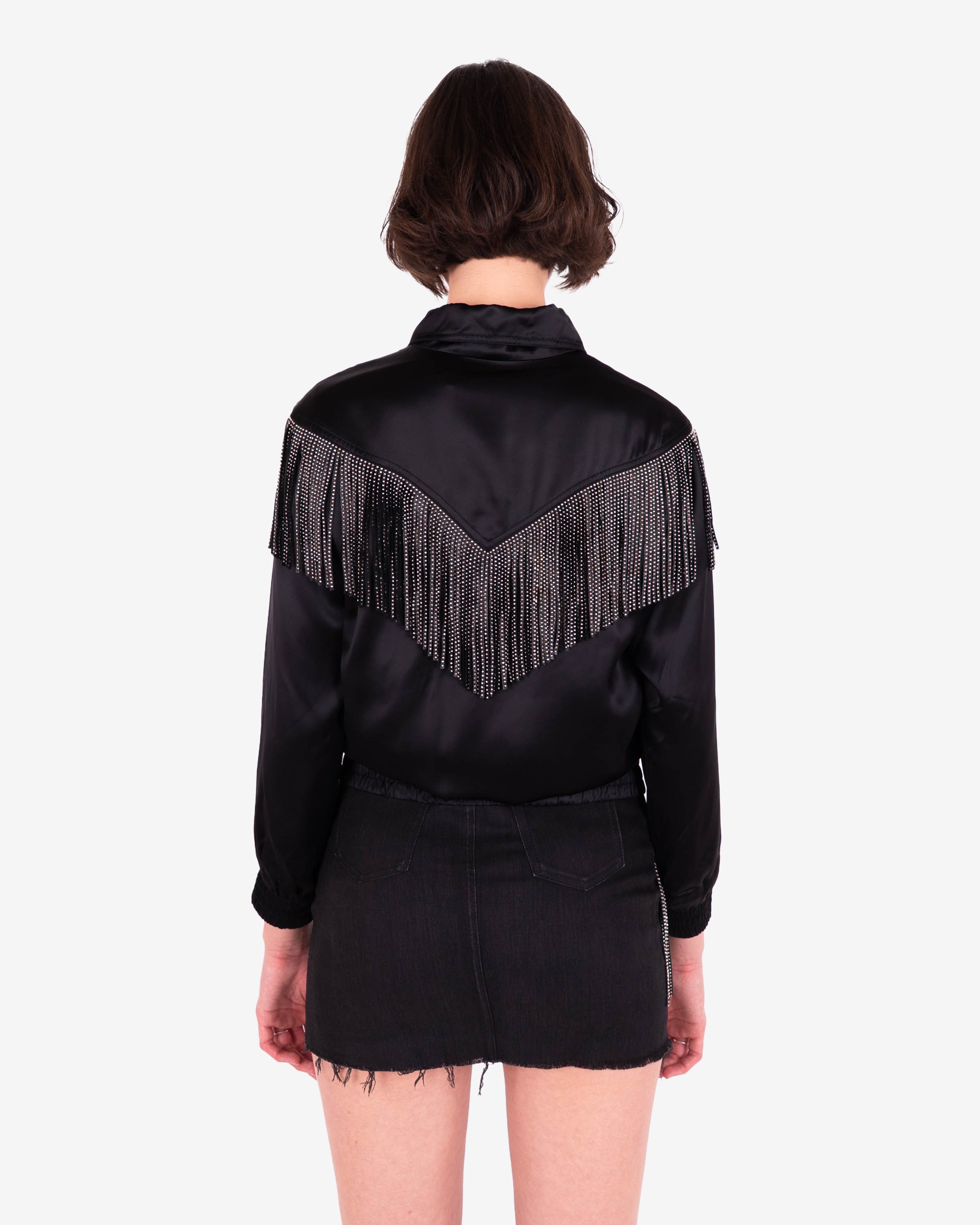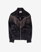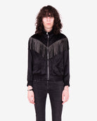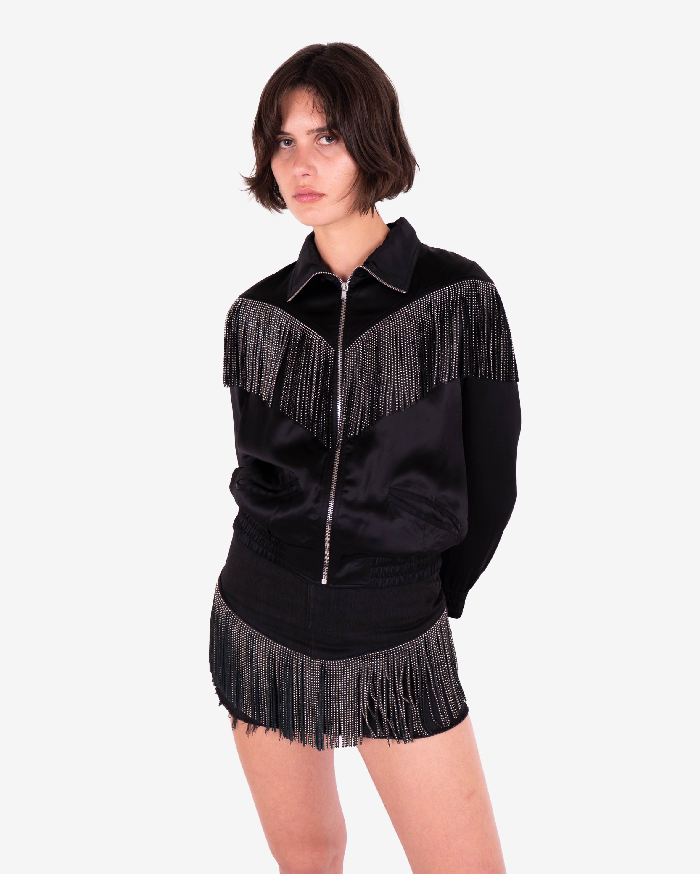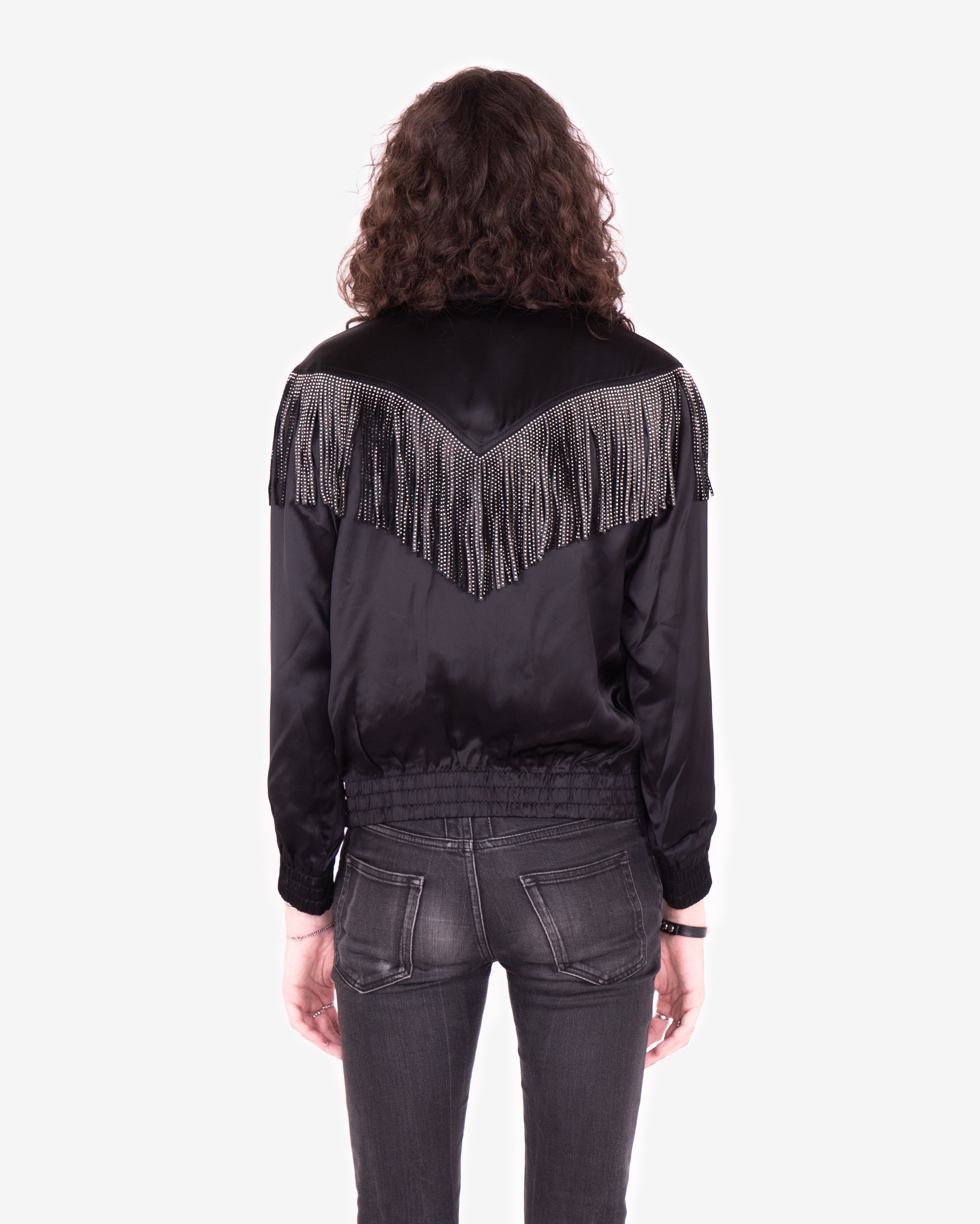 Bomber style jacket, as seen on runway, with long silver metallic fringe trim in V-line across front chest and back.