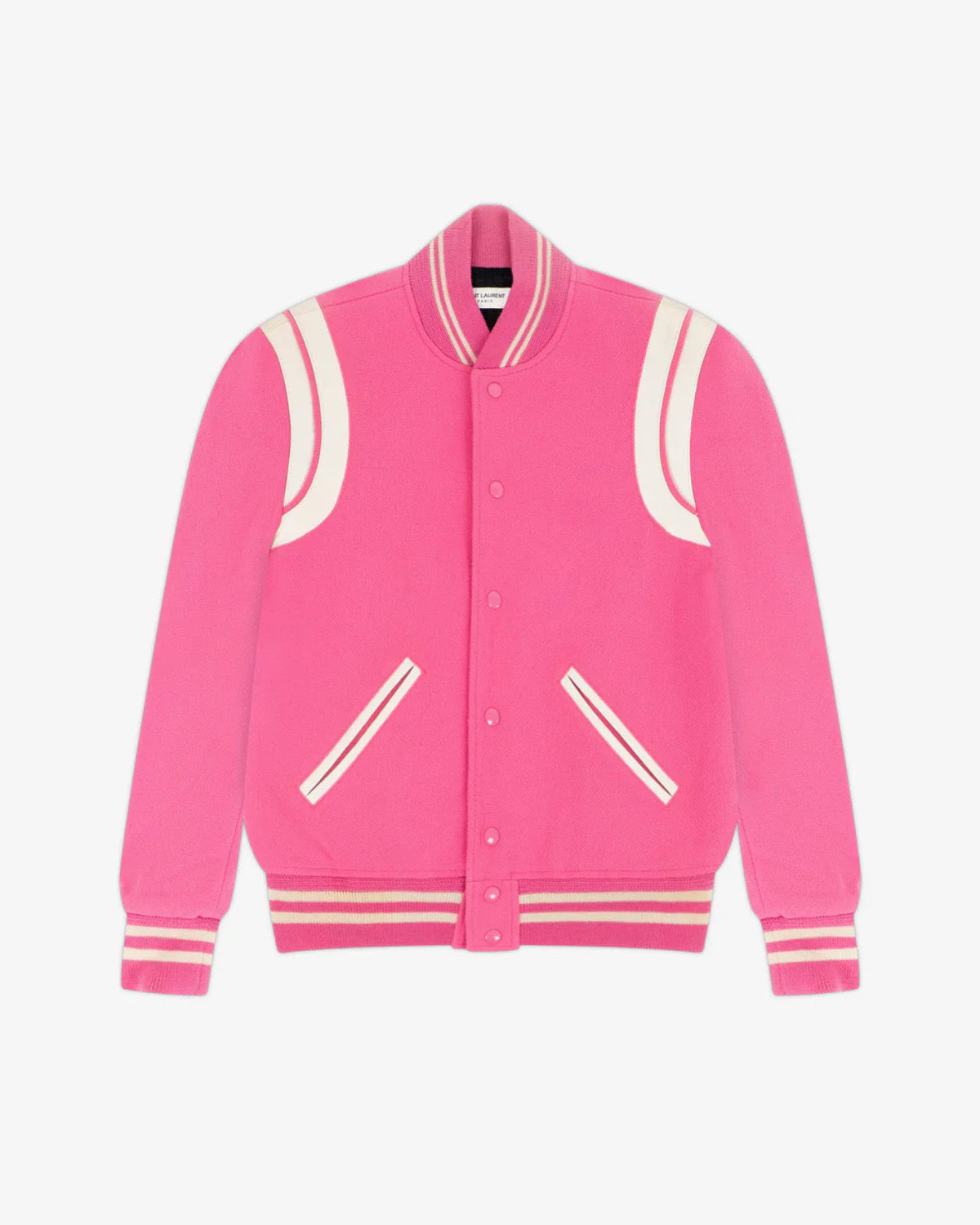 Unique colorway of the iconic teddy jacket features signature leather shoulder panels and leather trim on the pockets; button down front clasp closure, and contrast collar, cuffs and waist.