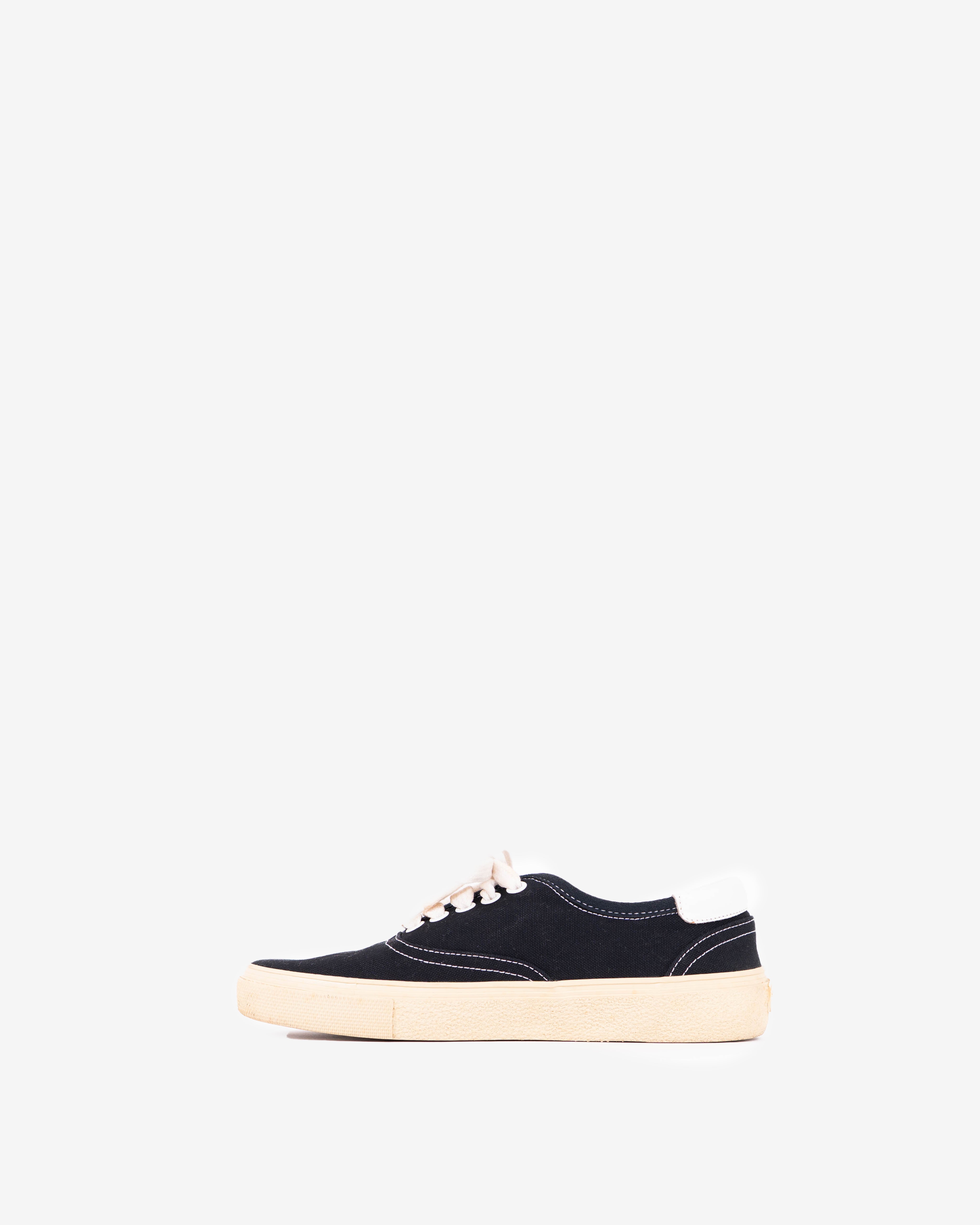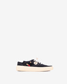 Black distressed cotton-canvas sneakers with stitched & metal enamel pins and patch badges.
