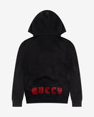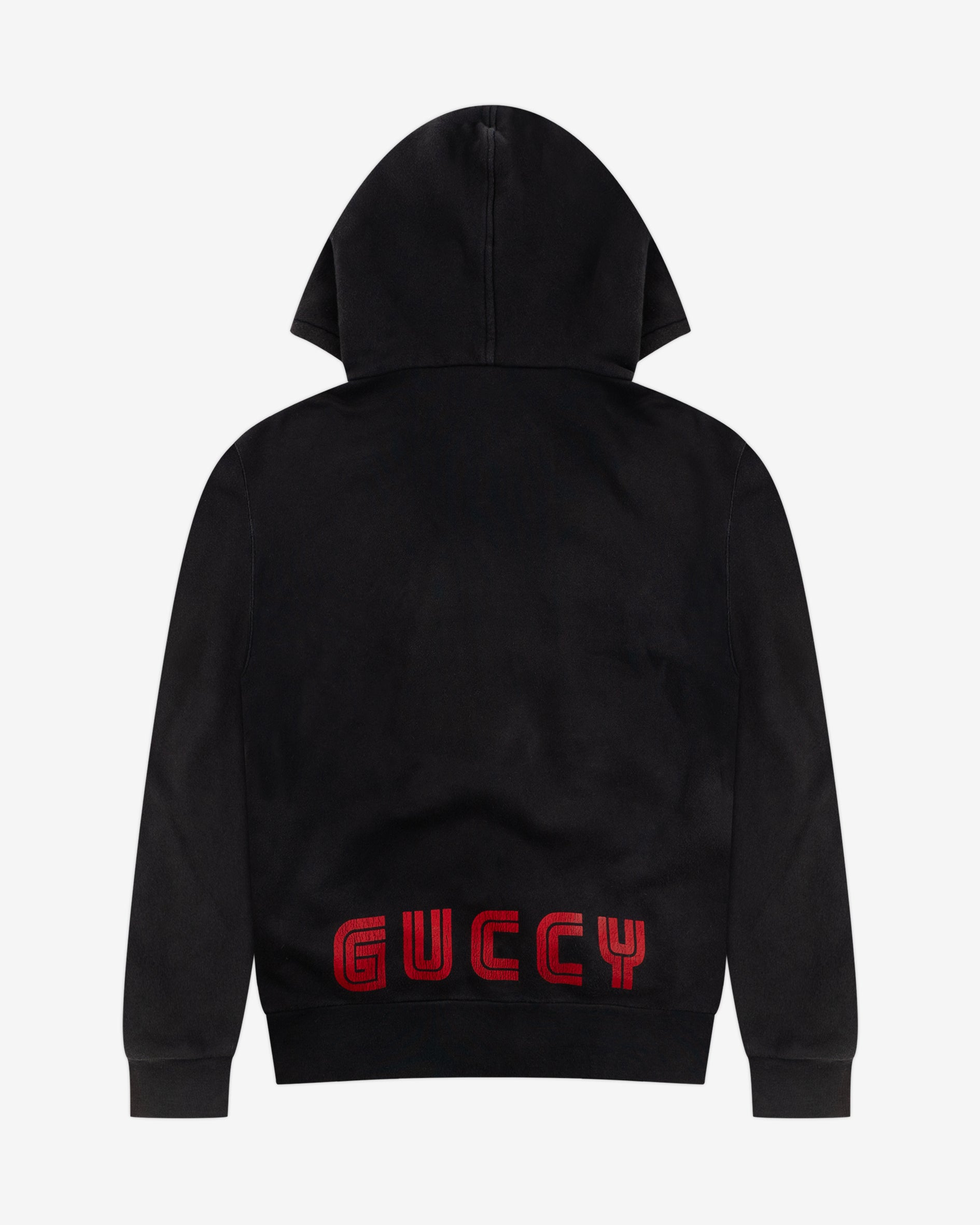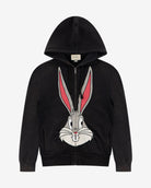 Gucci x Looney Tunes from featuring  large, multicolored Bugs Bunny embroidery print on the front and "GUCCY" print on lower back.