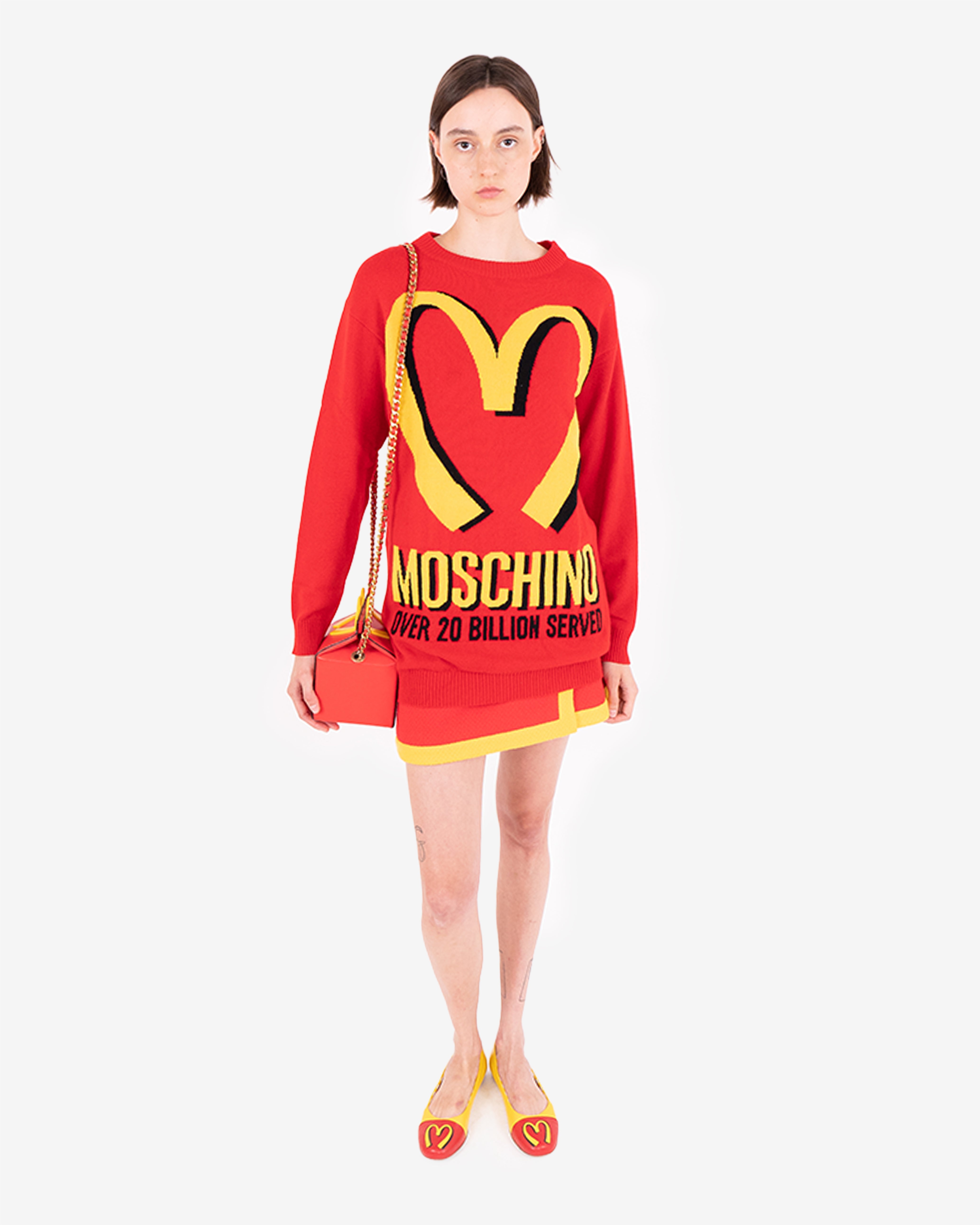Red oversized knit sweater. No official collaboration; but part of Jeremy Scott's fast-food-fashion collection.