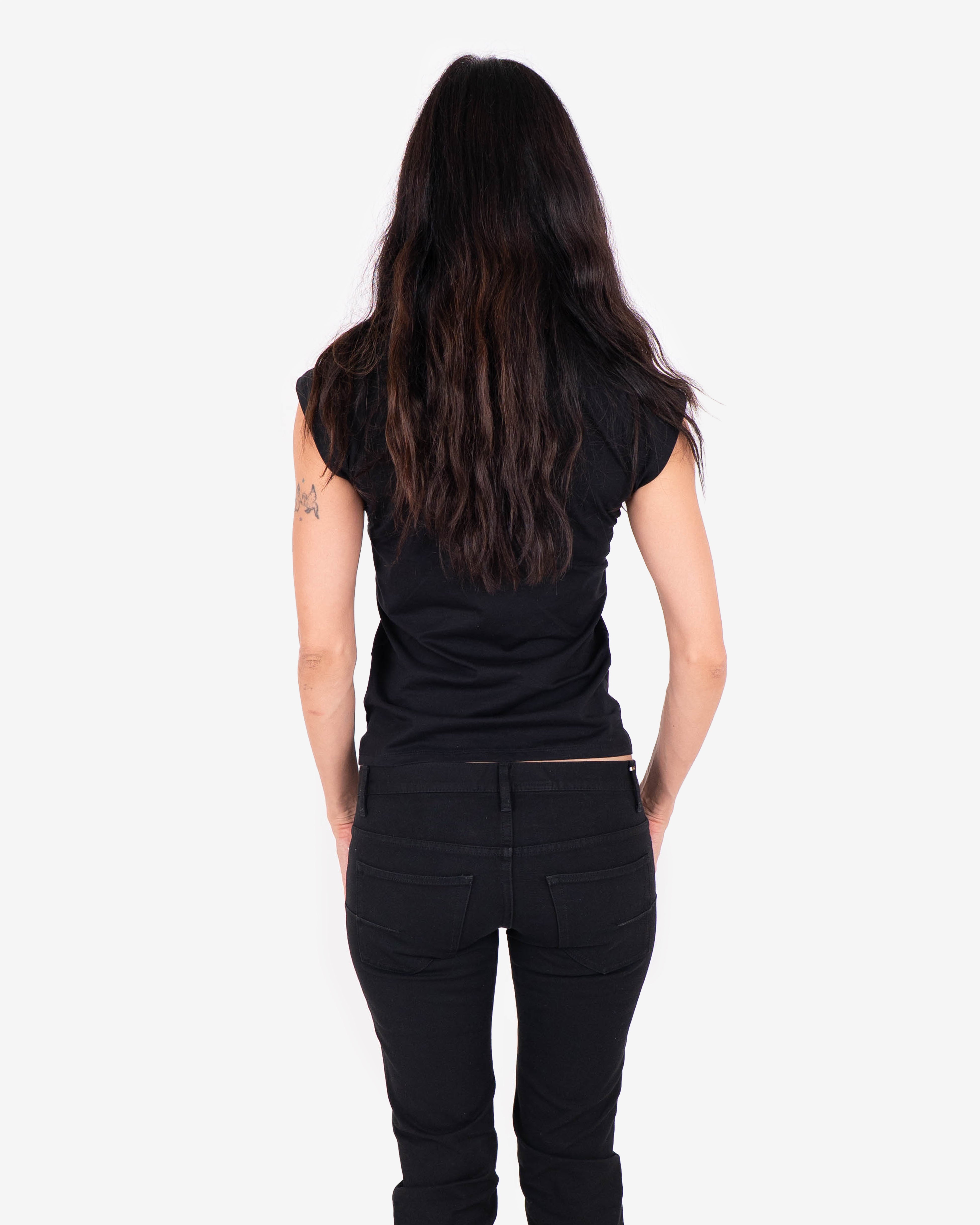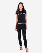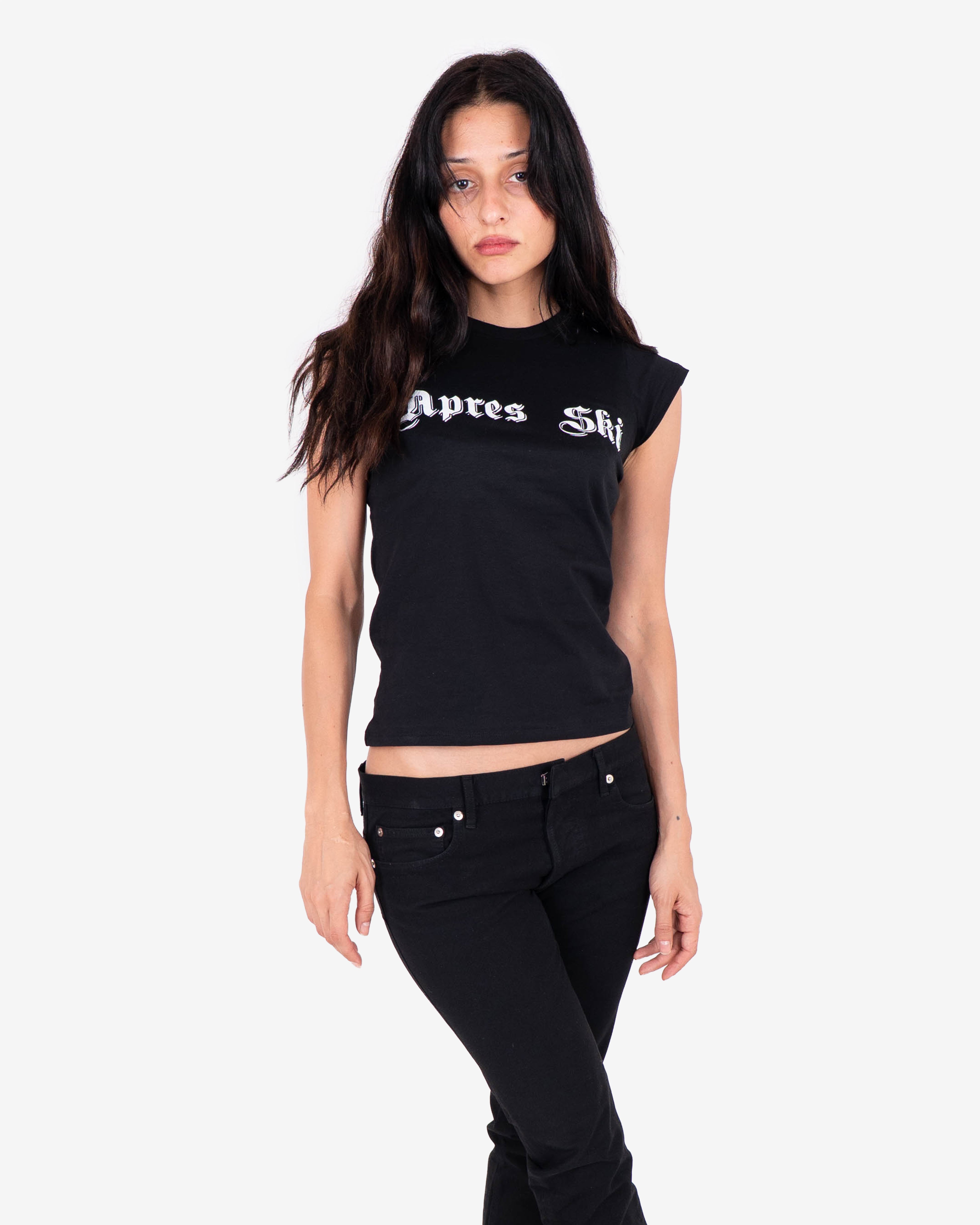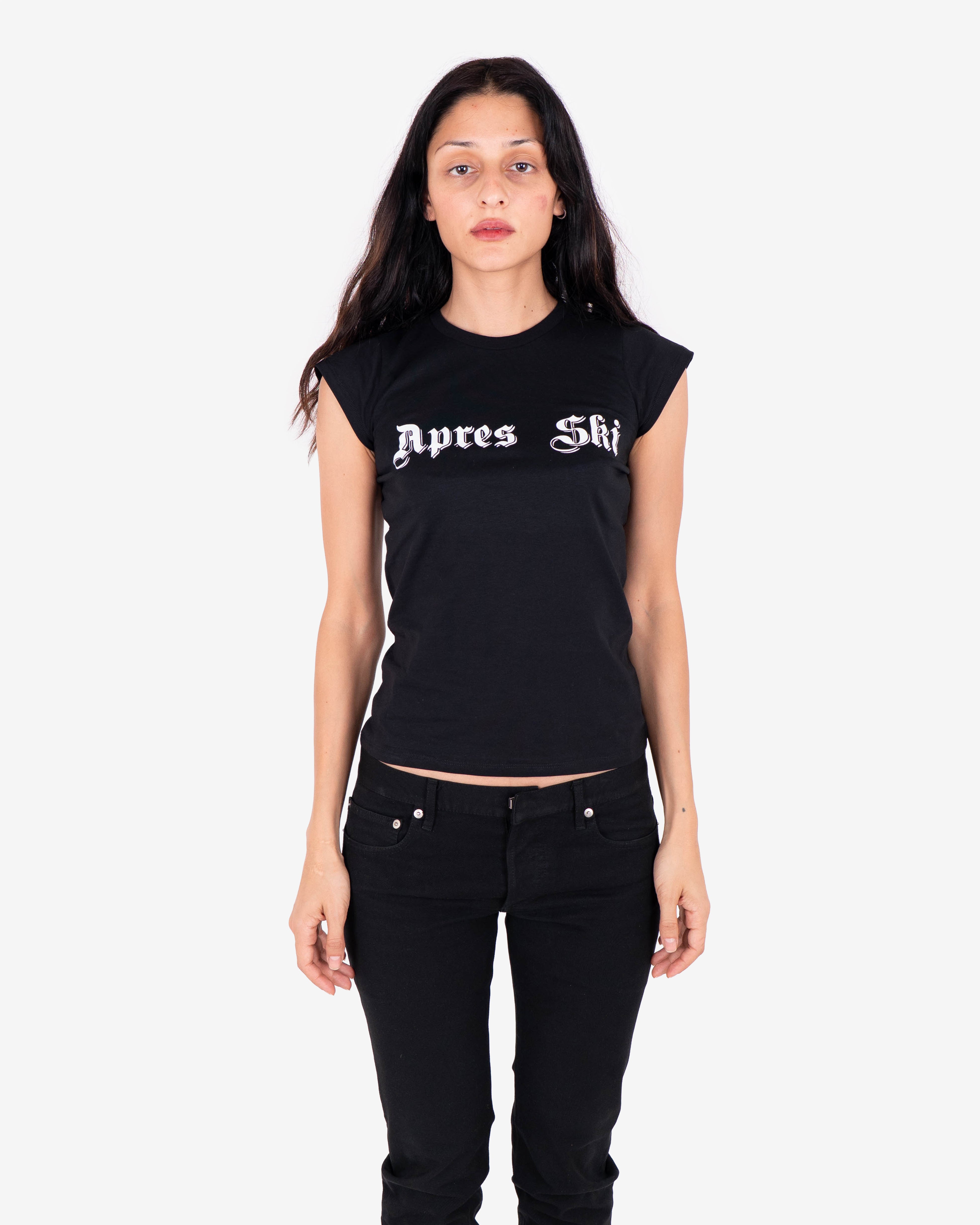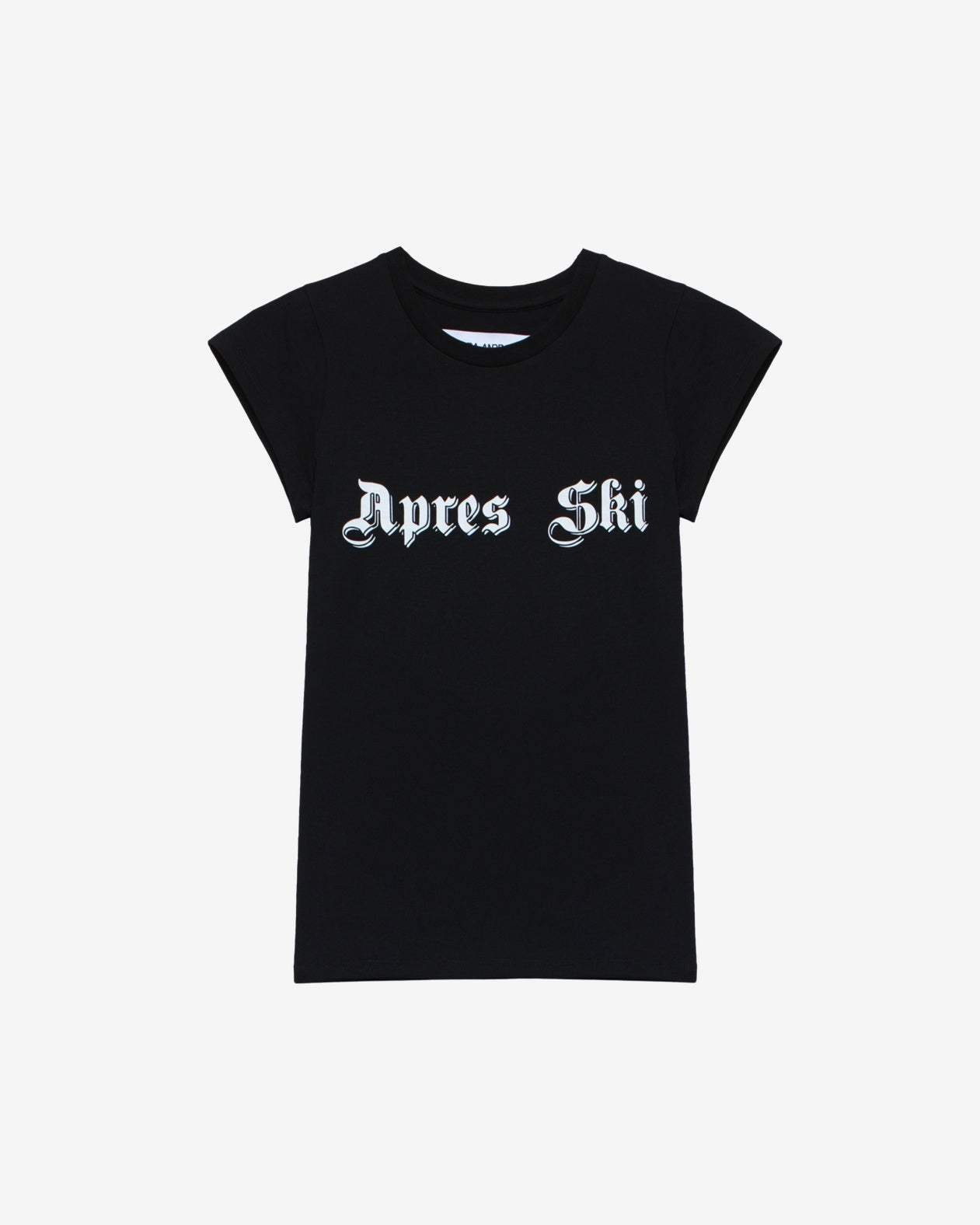 Babydoll t-shirt featuring white gothic style "Apres Ski" print on chest.