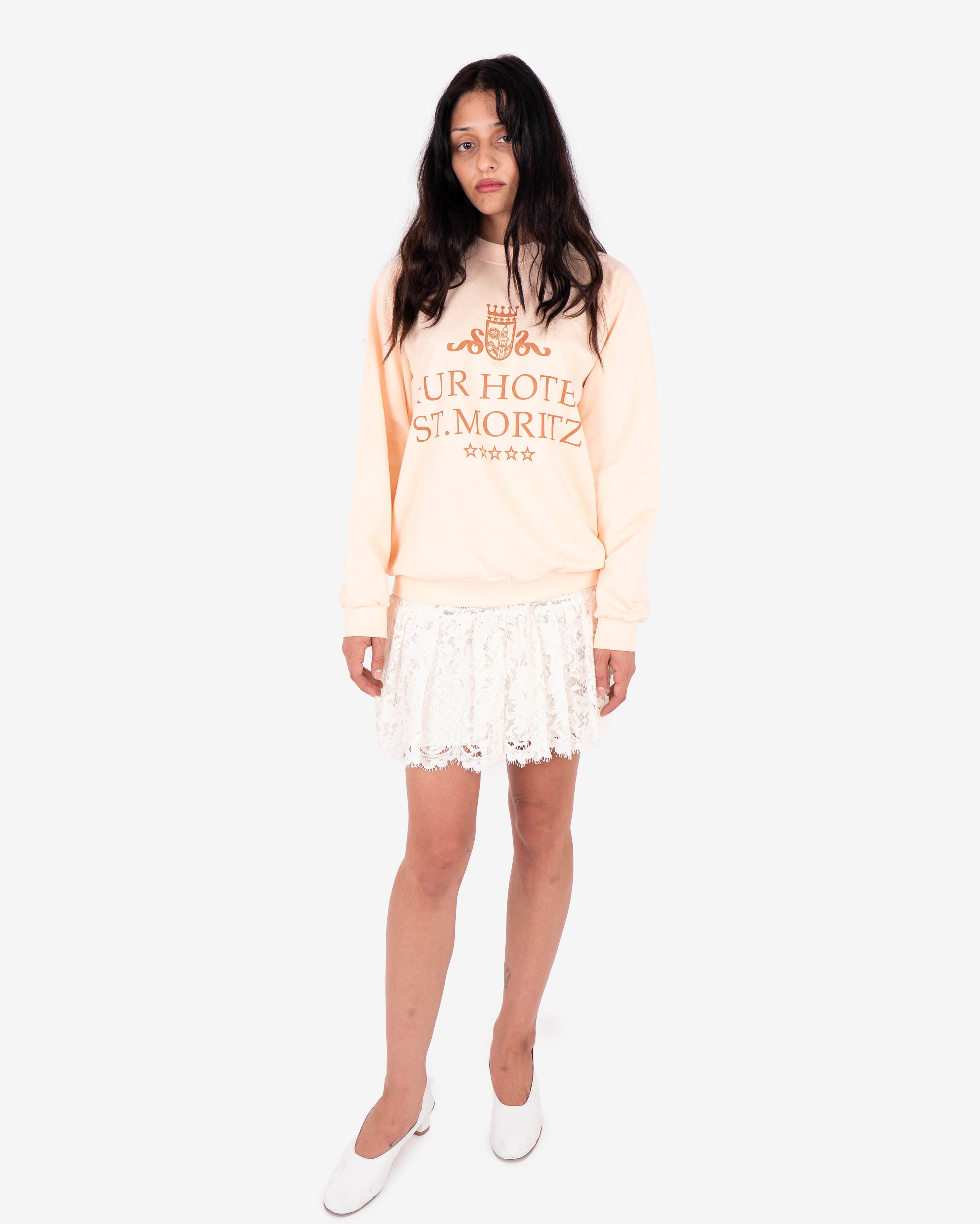 Souvenir style oversize cut sweatshirt featuring "Kur Hotel St. Moritz" logo, a nod to St. Moritz's iconic Kulm Hotel, printed on chest.
