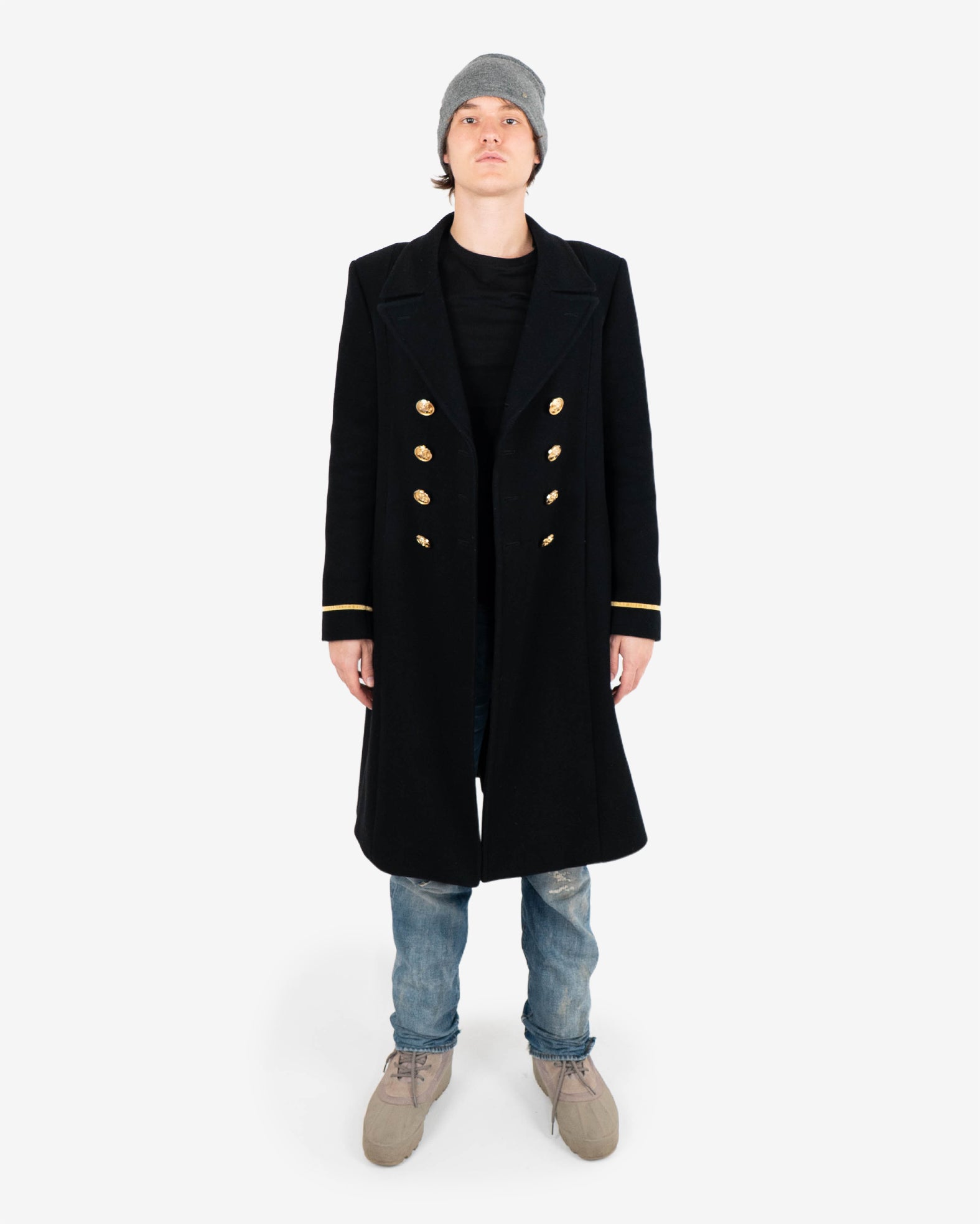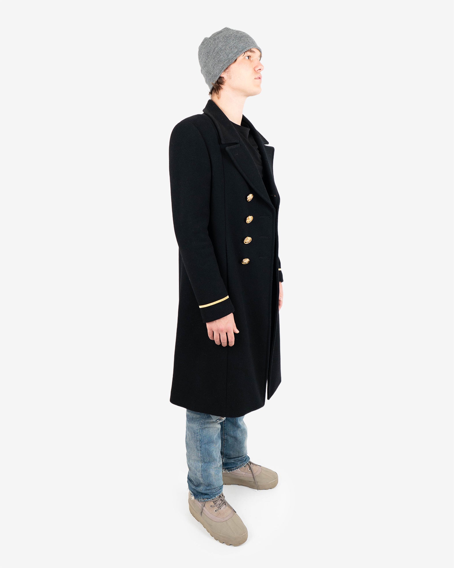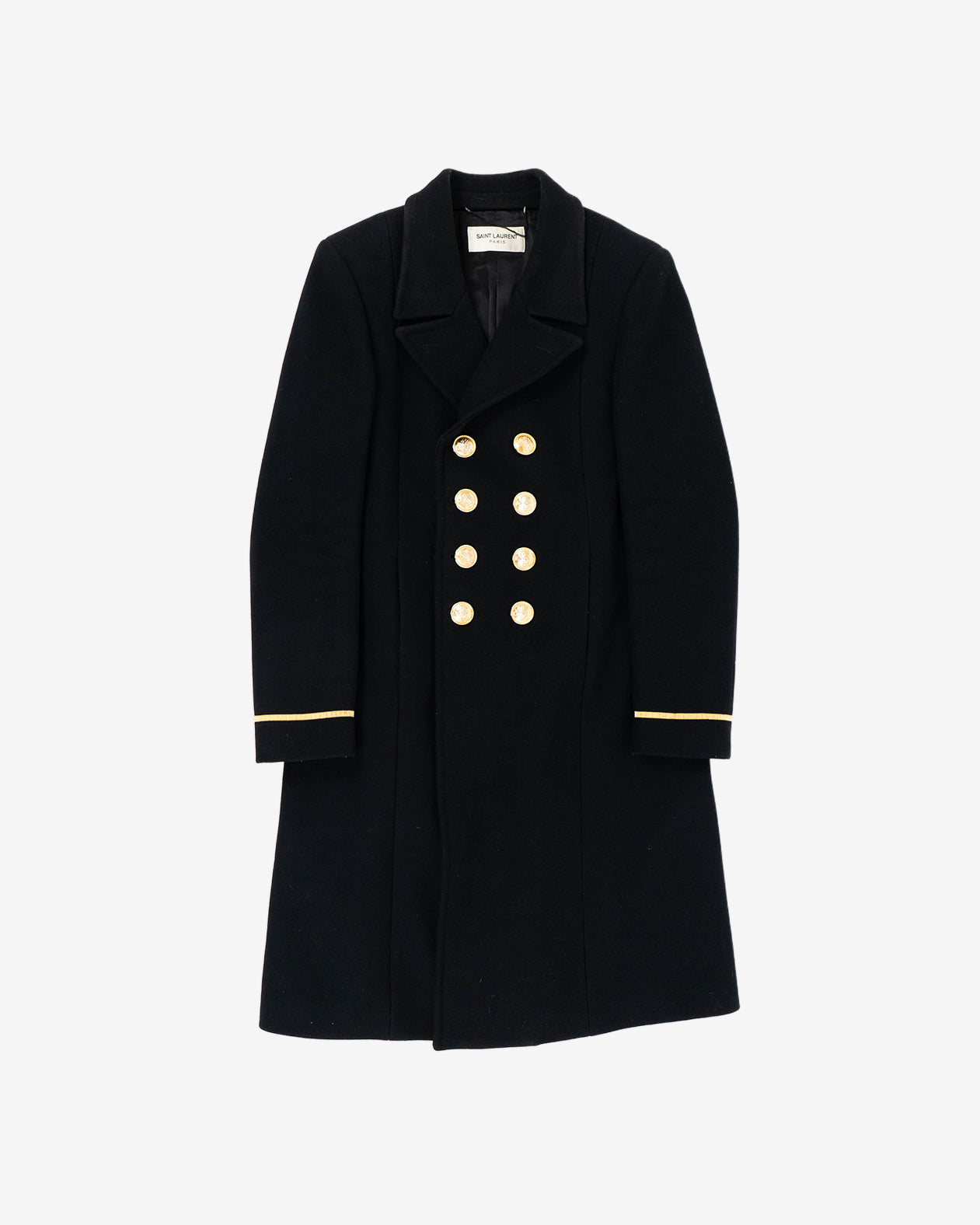 The final collection of Hedi Slimane for Saint Laurent Paris featured some of the most beautiful military-inspired garments of his career. This coat comes in a thick, high-quality wool-nylon base and absolutely stunning golden military details and cuff embroidery. As seen on the runway.